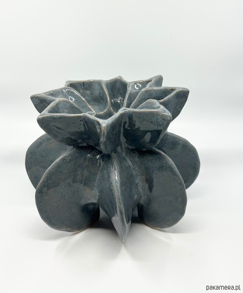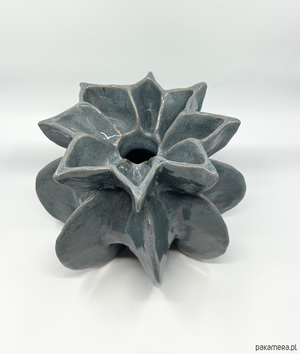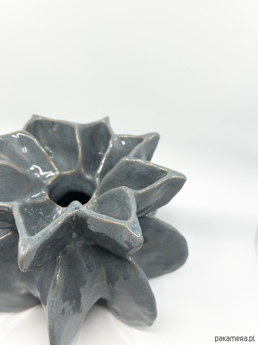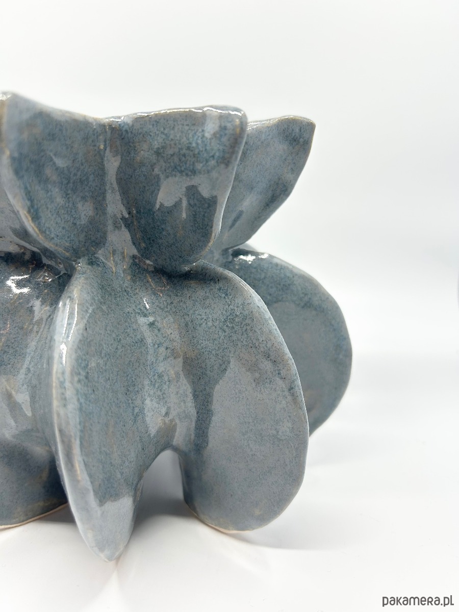 Wazon wykonany jest z jasnej gliny, formowany ręcznie, szkliwiony i wypalany w temperaturze 1100°C. Jego rzeźbiarska forma doskonale sprawdzi się jako dekoracyjny akcent we wnętrzu.