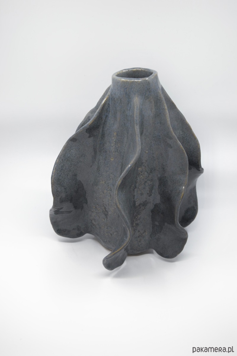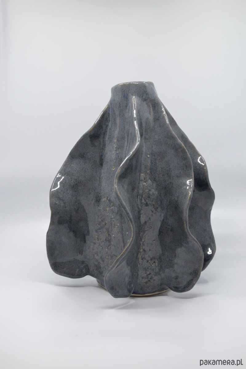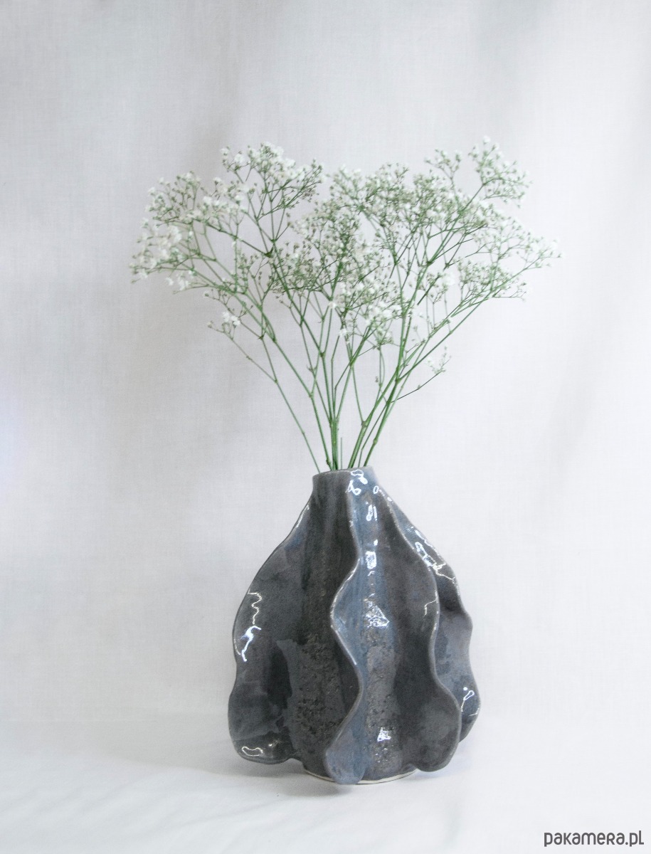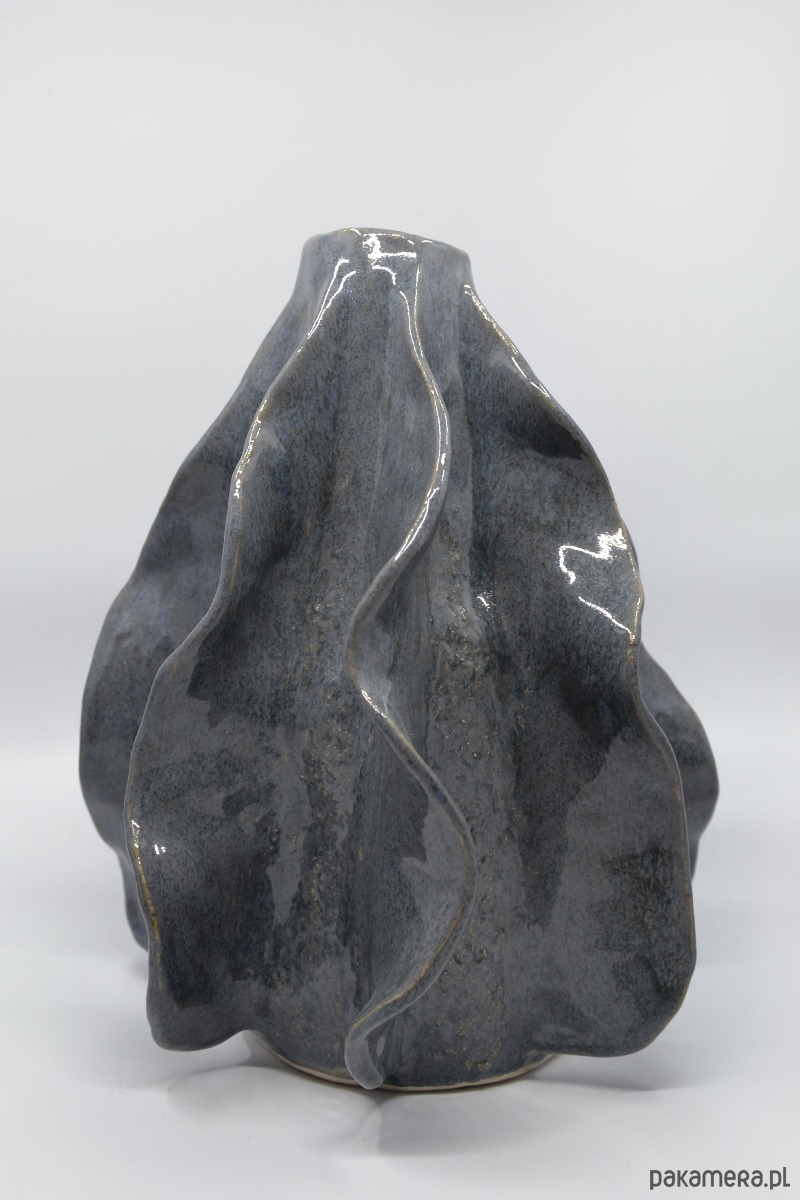 Wazon wykonany jest z jasnej gliny, formowany ręcznie, szkliwiony i wypalany w temperaturze 1100°C. Jego rzeźbiarska forma doskonale sprawdzi się jako dekoracyjny akcent we wnętrzu.
