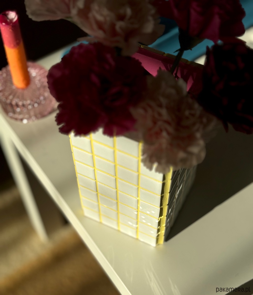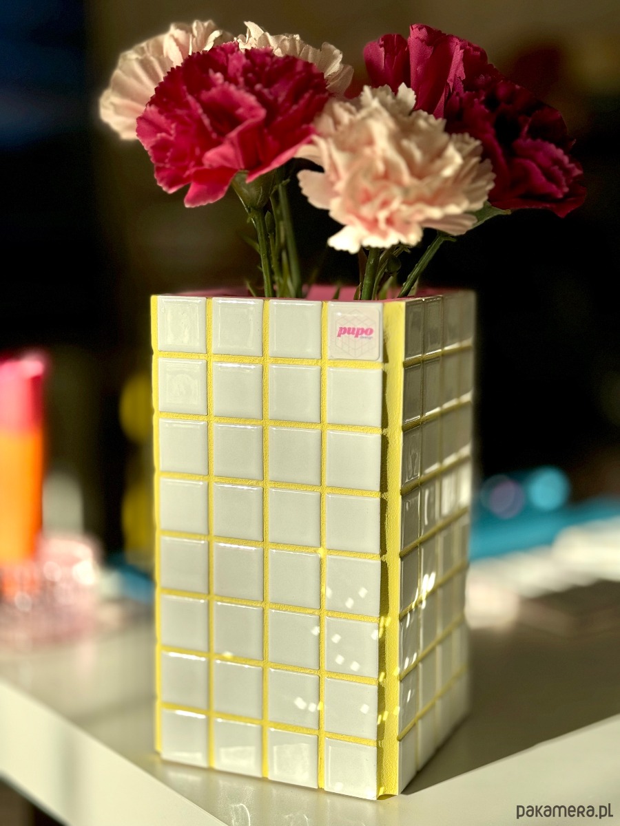 Wazon white został wykonany z białej mozaiki z dodatkiem żółtej fugi.Posiada piankową podkładkę-trzyma się powierzchni. Idealnie sprawdzi się jako wazon na świeże i suche kwiaty. Został wyposażony w szklany wkład na wodę. Wnętrze wazonu jest w kolorze różowym.