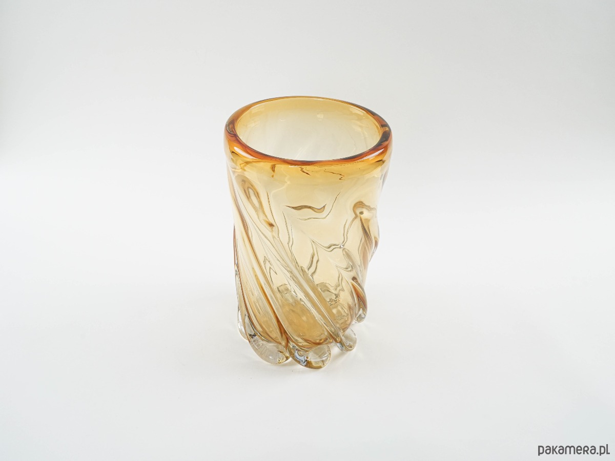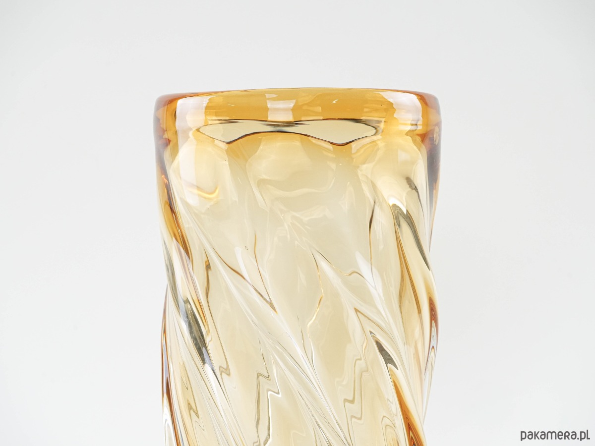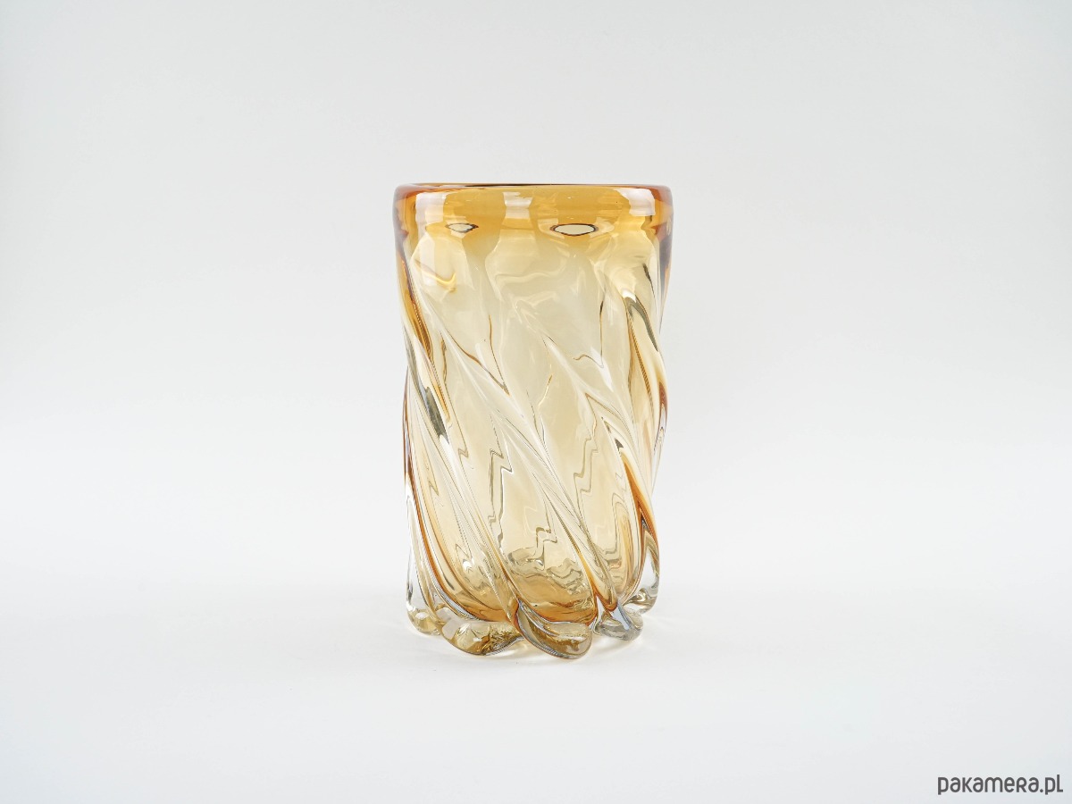 Imponujący wazon o rzeźbiarskiej formie, wykonany z grubego, dmuchanego szkła w miodowym odcieniu, z dynamicznym, spiralnym skrętem i płynnymi przejściami barw. Ciężki i stabilny, robi wrażenie zarówno jako samodzielna rzeźba szklarska, jak i użytkowy obiekt do dużych kompozycji florystycznych. Forma i jakość wykonania przywodzą na myśl włoskie szkło Murano z połowy XX wieku. Prawdziwa perełka dla miłośników unikatowego szkła artystycznego.