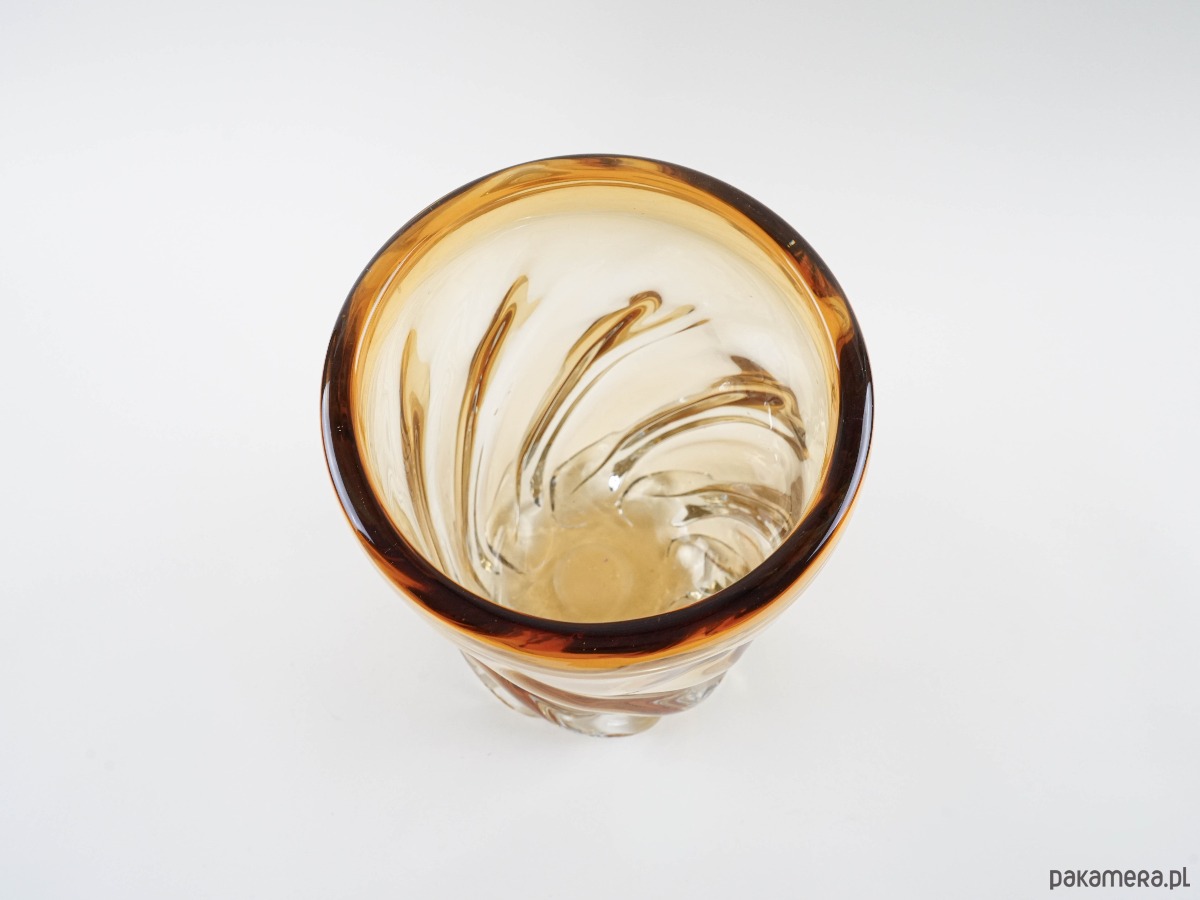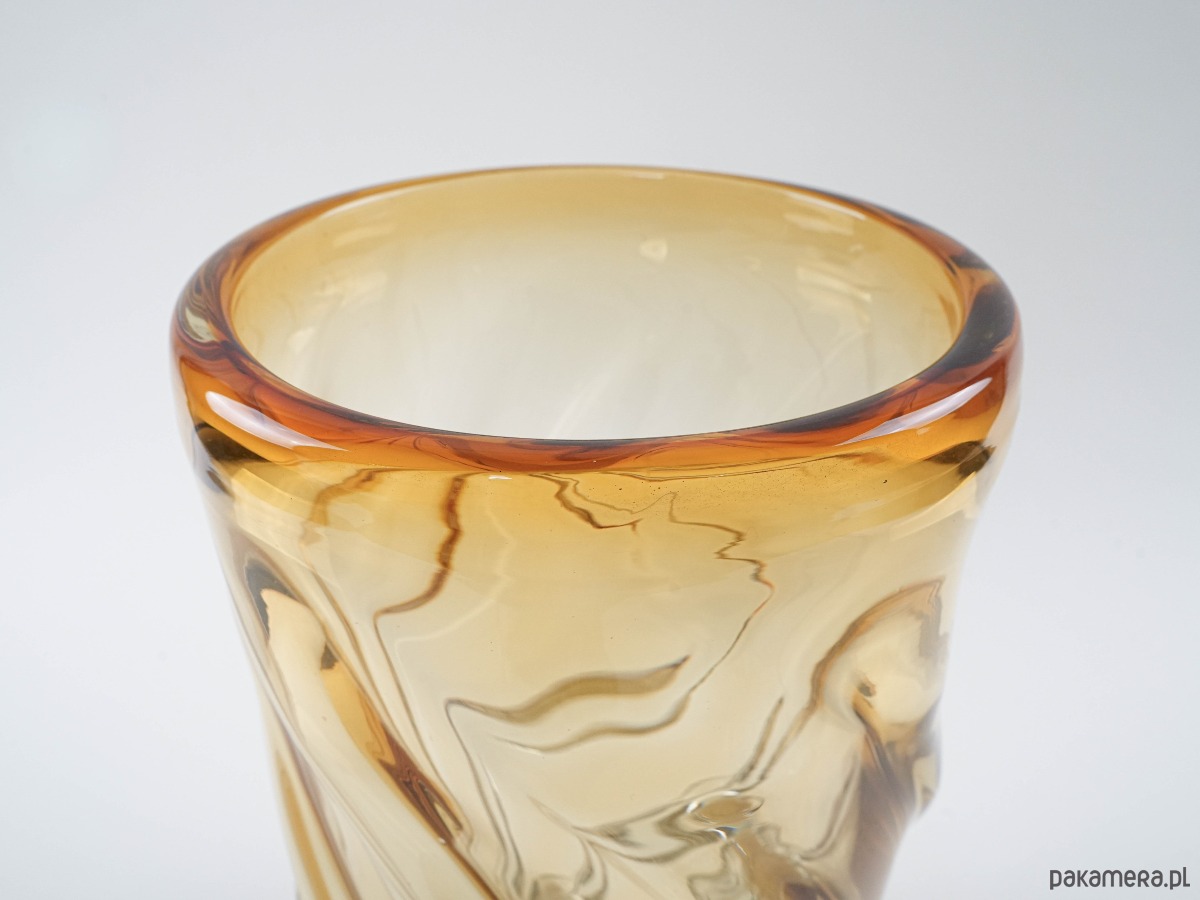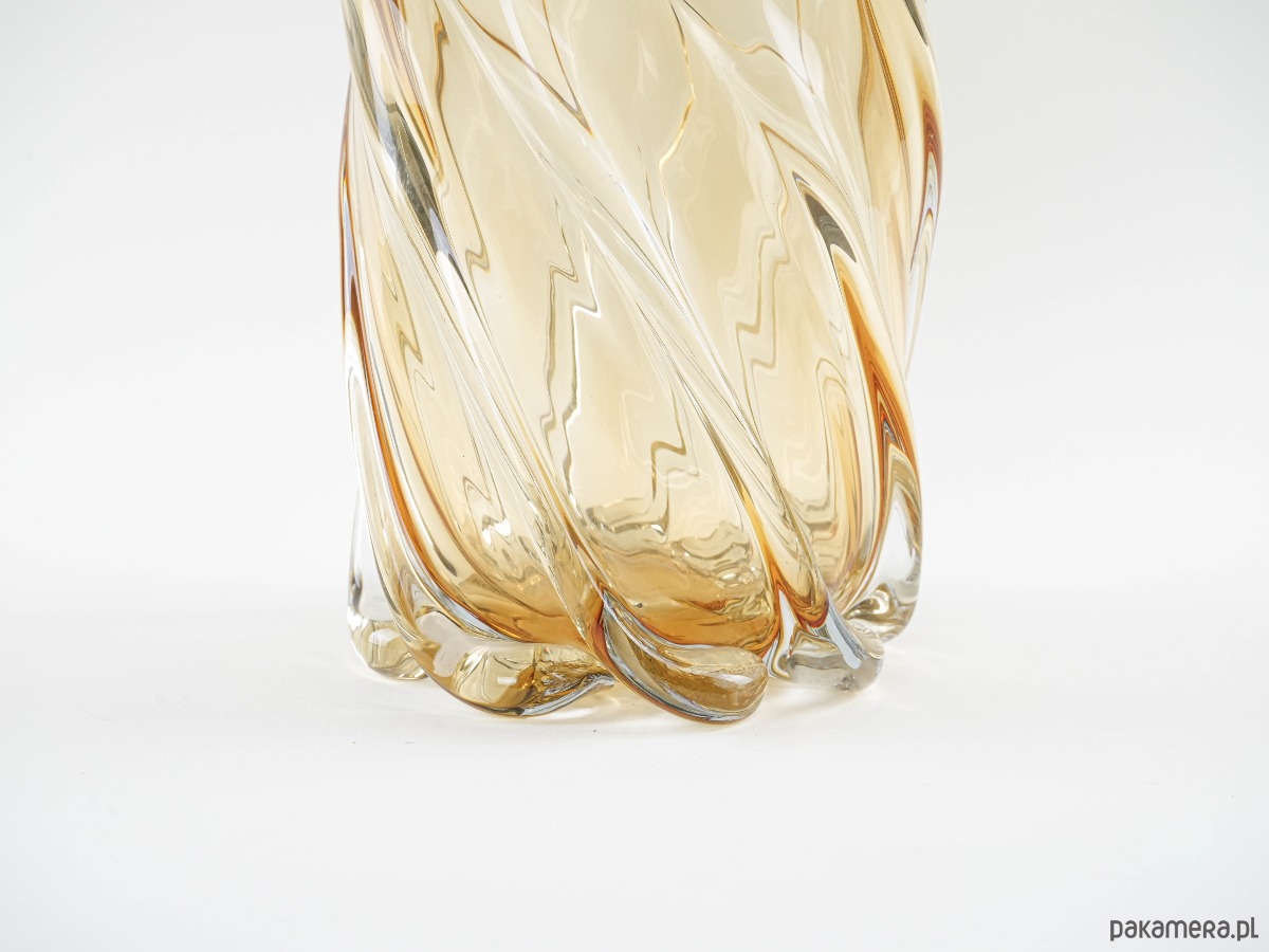 Imponujący wazon o rzeźbiarskiej formie, wykonany z grubego, dmuchanego szkła w miodowym odcieniu, z dynamicznym, spiralnym skrętem i płynnymi przejściami barw. Ciężki i stabilny, robi wrażenie zarówno jako samodzielna rzeźba szklarska, jak i użytkowy obiekt do dużych kompozycji florystycznych. Forma i jakość wykonania przywodzą na myśl włoskie szkło Murano z połowy XX wieku. Prawdziwa perełka dla miłośników unikatowego szkła artystycznego.
