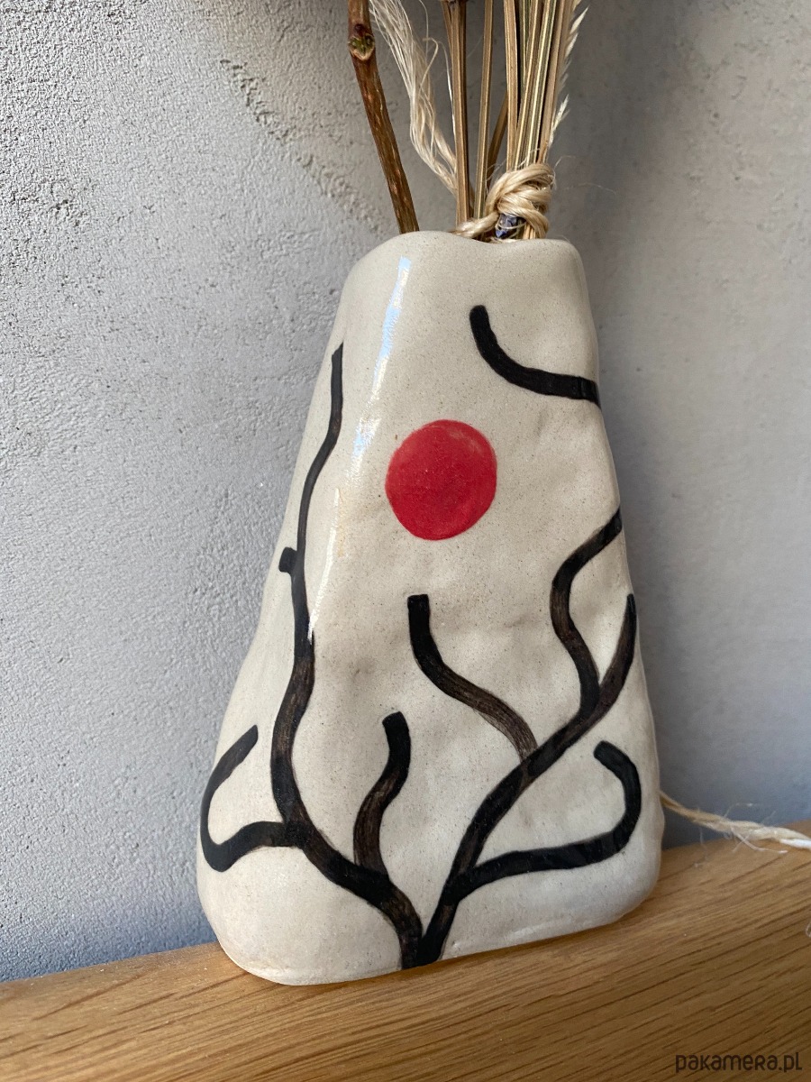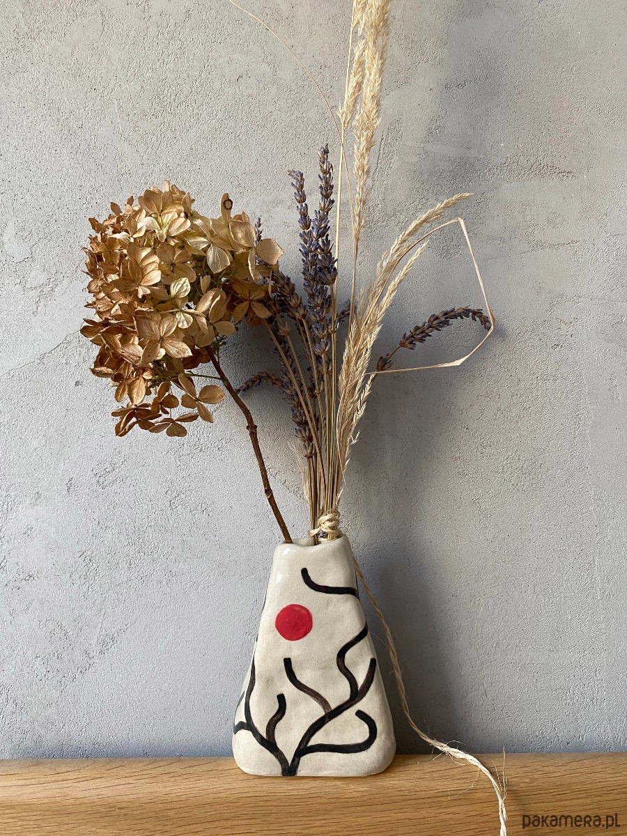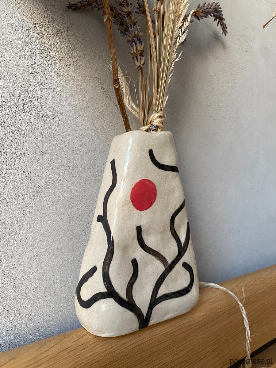 Wazonik z gliny, ręcznie robiony, wypalony w wysokiej temperaturze i malowany w motywy inspirowane podróżą do Japonii. Idealny na pojedynczy kwiatek lub jakąś mniejszą kompozycję. Można przetrzymywać w nim rośliny w wodzie. Świetnie sprawdzi się na prezent. Wazonik jest ręcznie robiony od A do Z, więc nie ma dwóch identycznych, dzięki temu jest unikatowy i niepowtarzalny:) Jest on częścią większej kolekcji dostępnej na moim profilu.