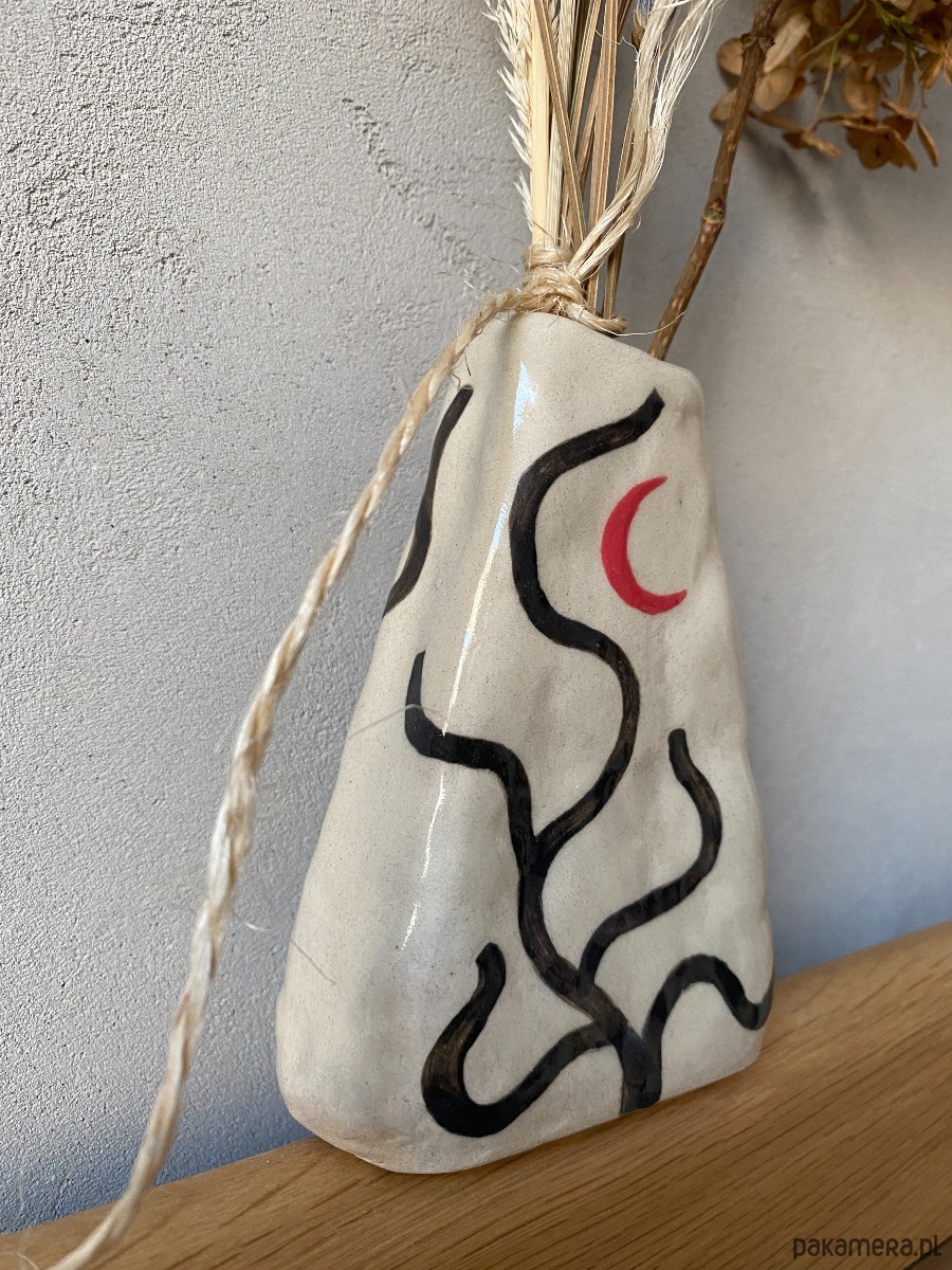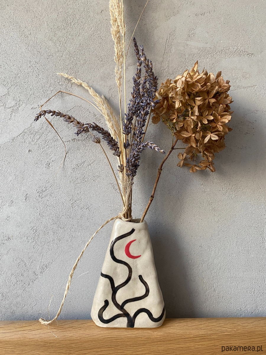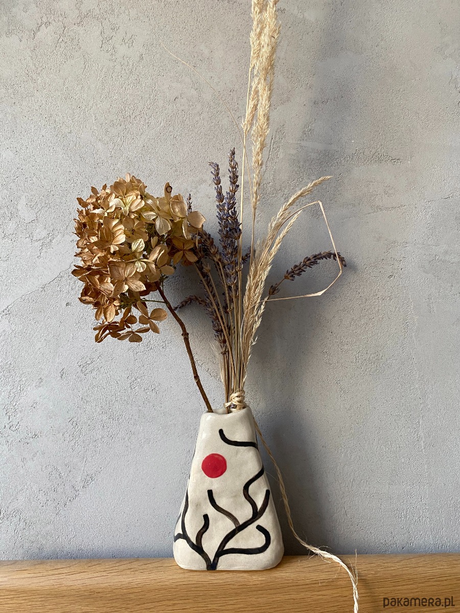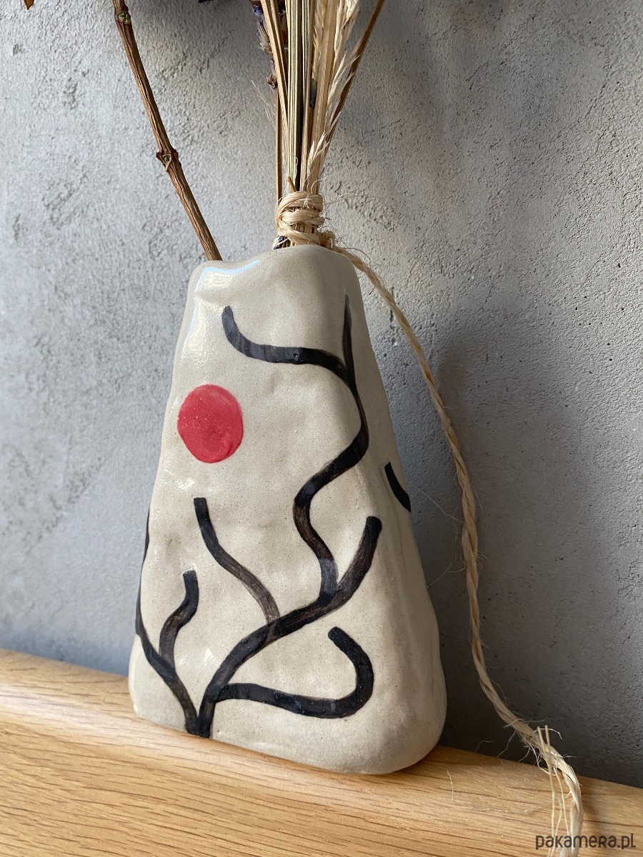 Wazonik z gliny, ręcznie robiony, wypalony w wysokiej temperaturze i malowany w motywy inspirowane podróżą do Japonii. Idealny na pojedynczy kwiatek lub jakąś mniejszą kompozycję. Można przetrzymywać w nim rośliny w wodzie. Świetnie sprawdzi się na prezent. Wazonik jest ręcznie robiony od A do Z, więc nie ma dwóch identycznych, dzięki temu jest unikatowy i niepowtarzalny:) Jest on częścią większej kolekcji dostępnej na moim profilu.