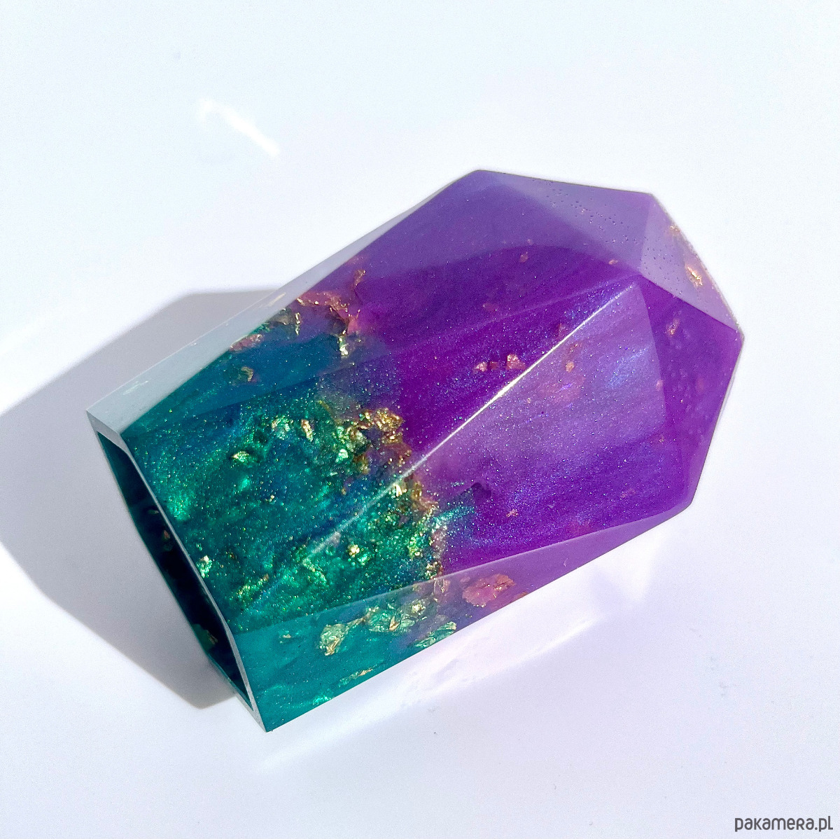Wazonik dekoracyjno-użytkowy wykonany z żywicy epoksydowej z zatopionymi zlotymi drobinkami folii transferowej