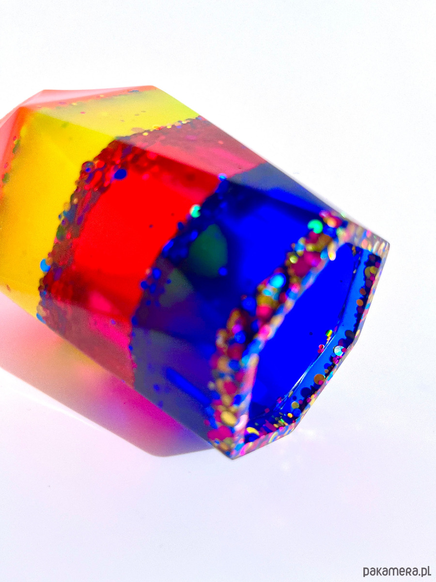 Wazonik dekoracyjno-użytkowy wykonany z żywicy epoksydowej z zatopionymi drobnymi mieniacymi sie kolorowymi drobinkami