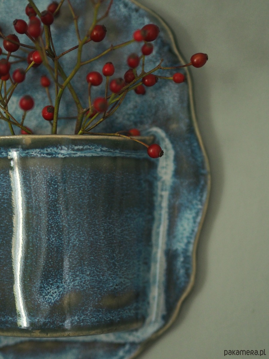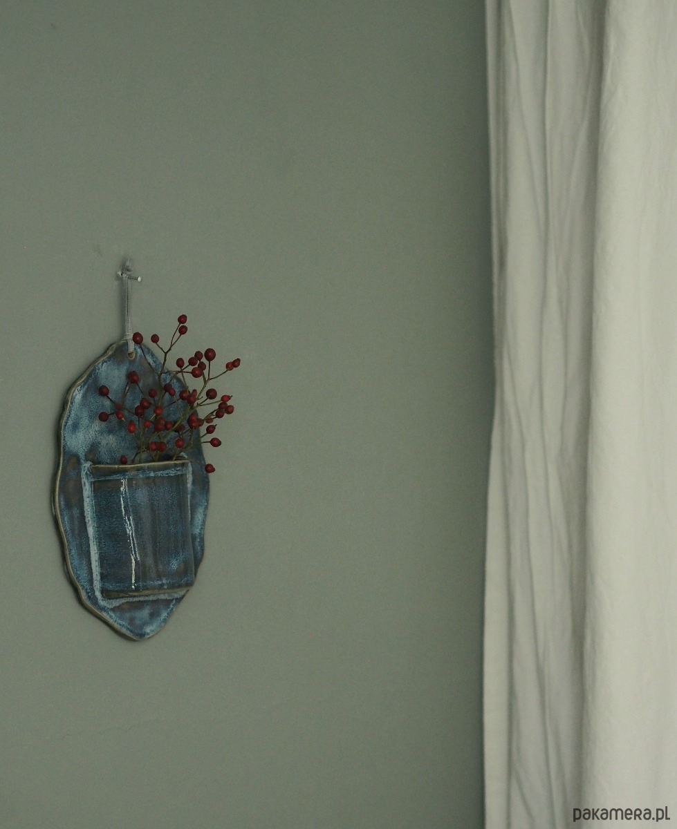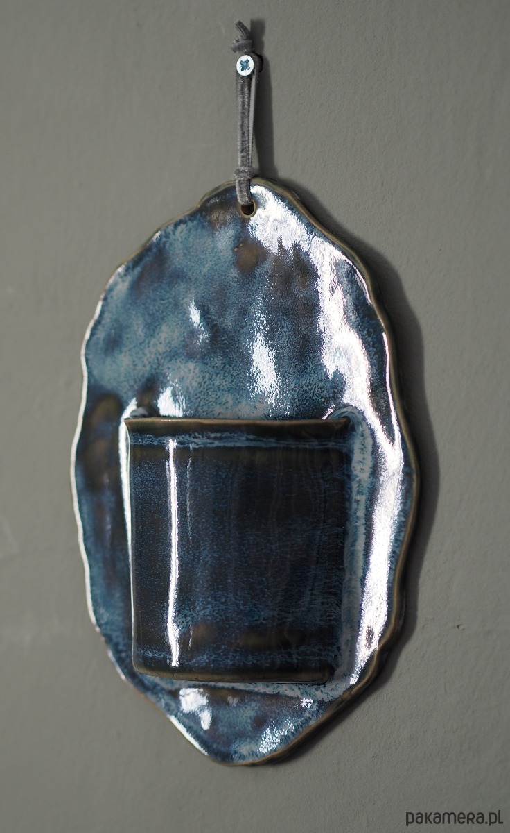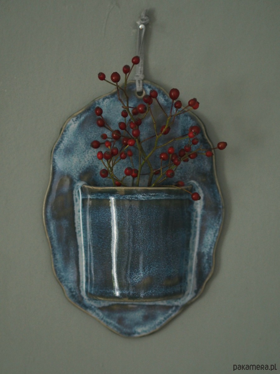 Wazonik na ścianę doskonale uzupełni galerię zdjęć i grafik. Ten ciekawy dodatek zdobiony jest mieszanką efektowych szkliw w odcieniach morskiej zieleni i wypalany w temp. 1240 stopni więc bez obaw można go napełnić wodą .