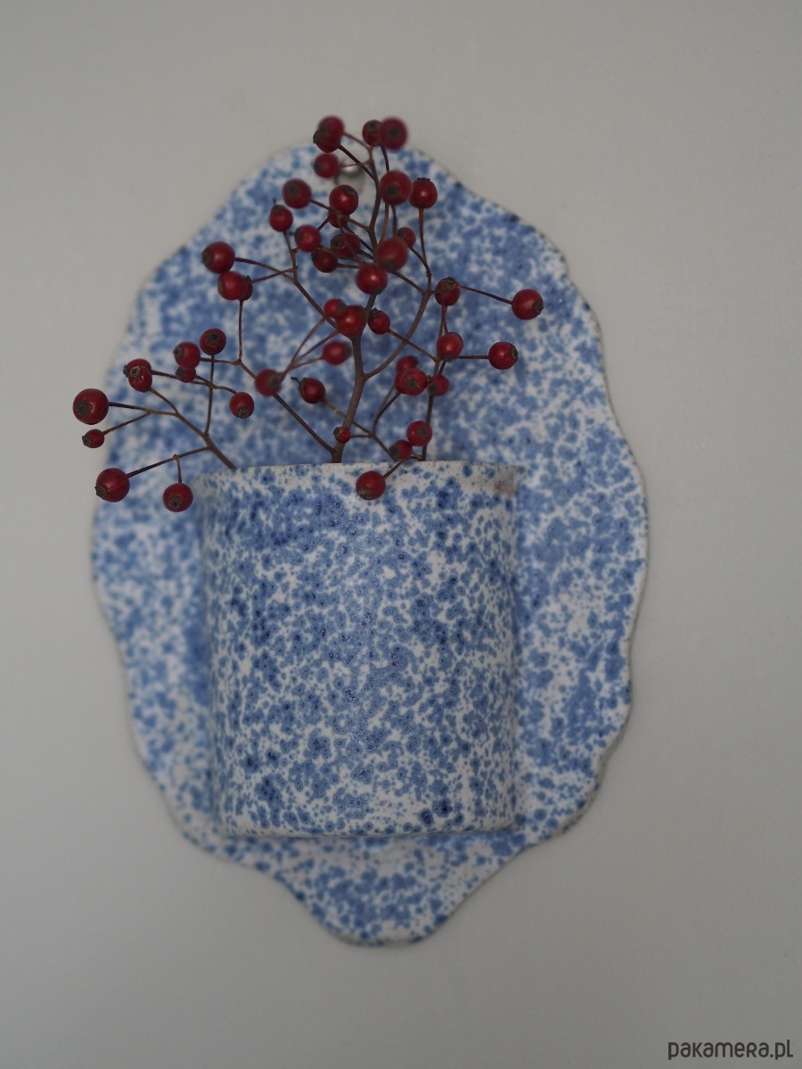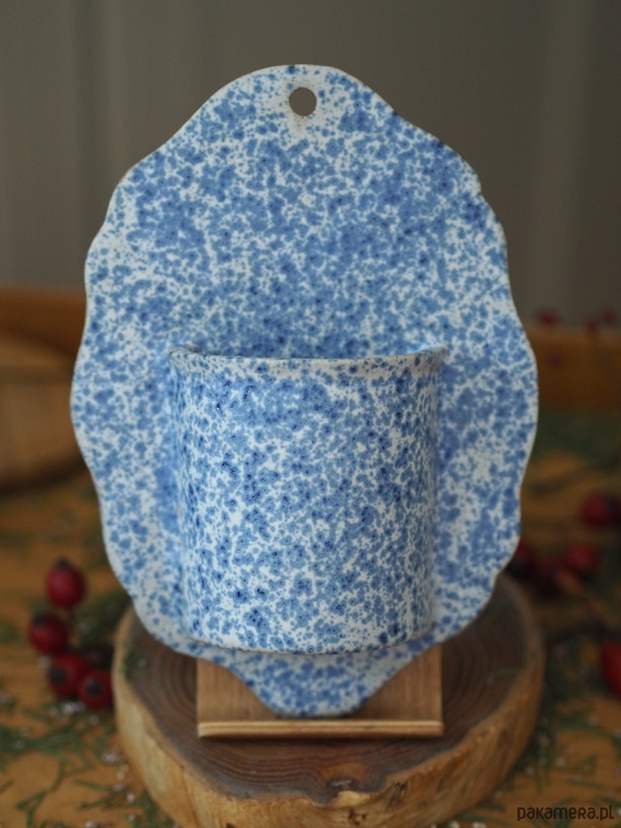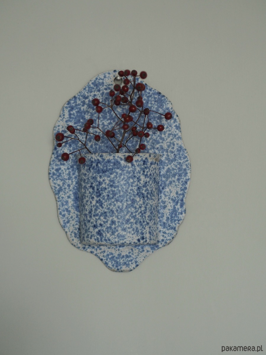 Wazonik na ścianę doskonale uzupełni galerię zdjęć i grafik. Szkliwiony białym,matowym szkliwem z niebieskimi plamkami. Wypalany w temp. 1240 stopni więc bez obaw można go napełnić wodą .