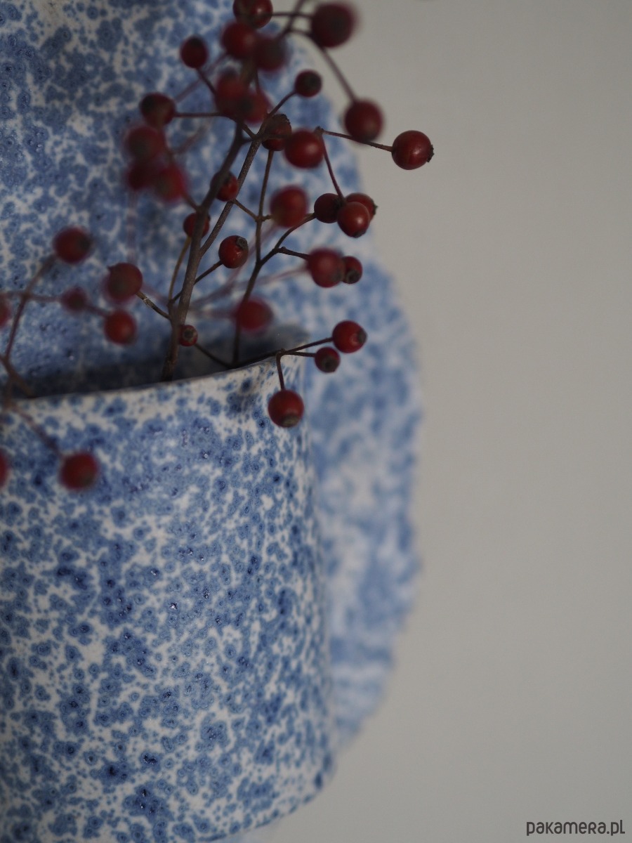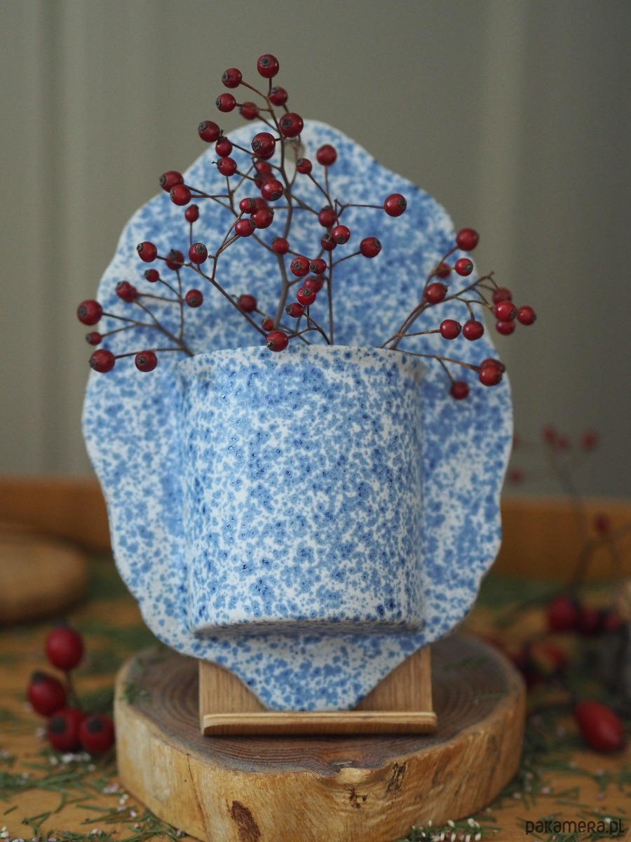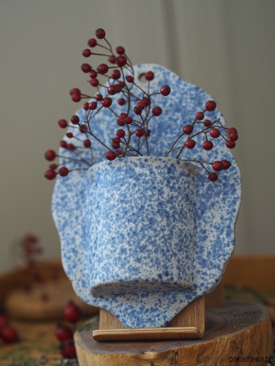 Wazonik na ścianę doskonale uzupełni galerię zdjęć i grafik. Szkliwiony białym,matowym szkliwem z niebieskimi plamkami. Wypalany w temp. 1240 stopni więc bez obaw można go napełnić wodą .