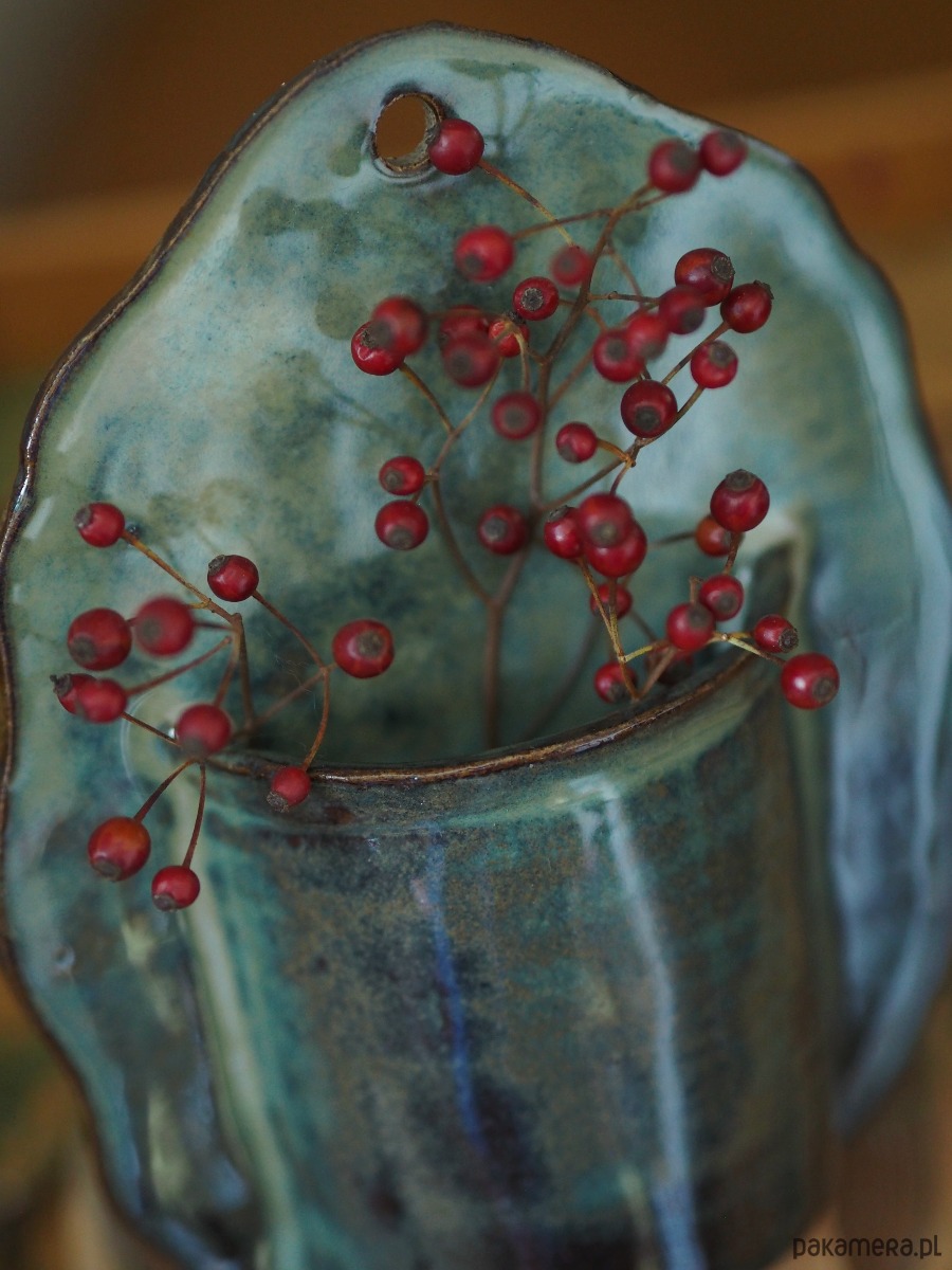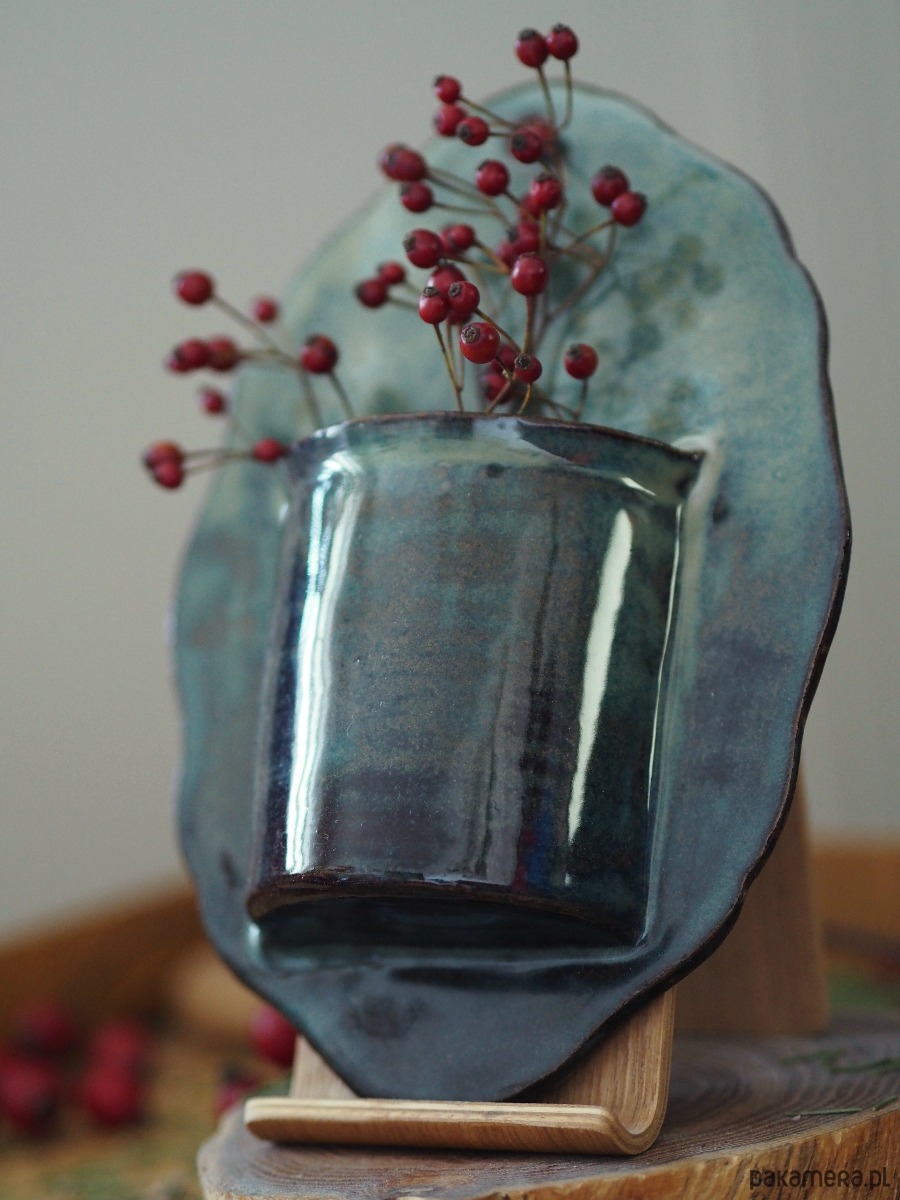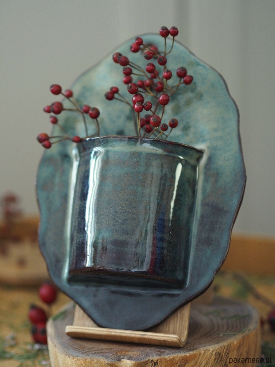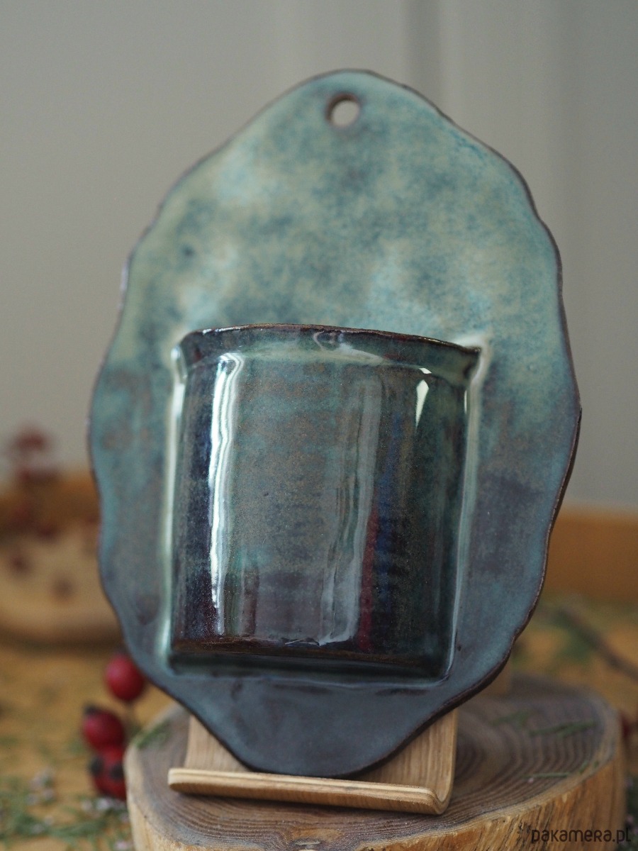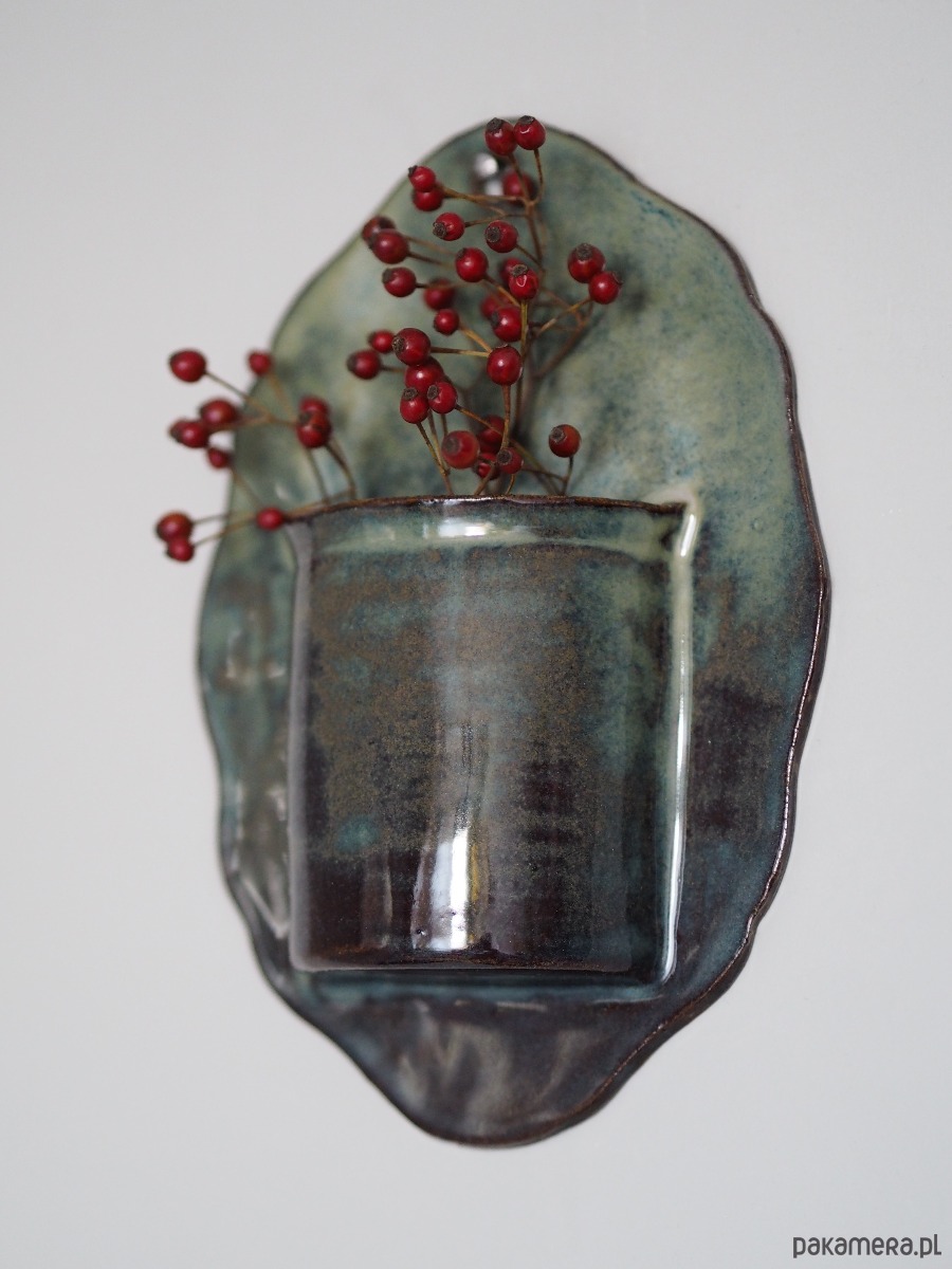 Wazonik na ścianę doskonale uzupełni galerię zdjęć i grafik. Ten ciekawy dodatek zdobiony jest mieszanką efektowych szkliw w odcieniach morskiej zieleni i granatu.Wypalany w temp. 1240 stopni więc bez obaw można go napełnić wodą .