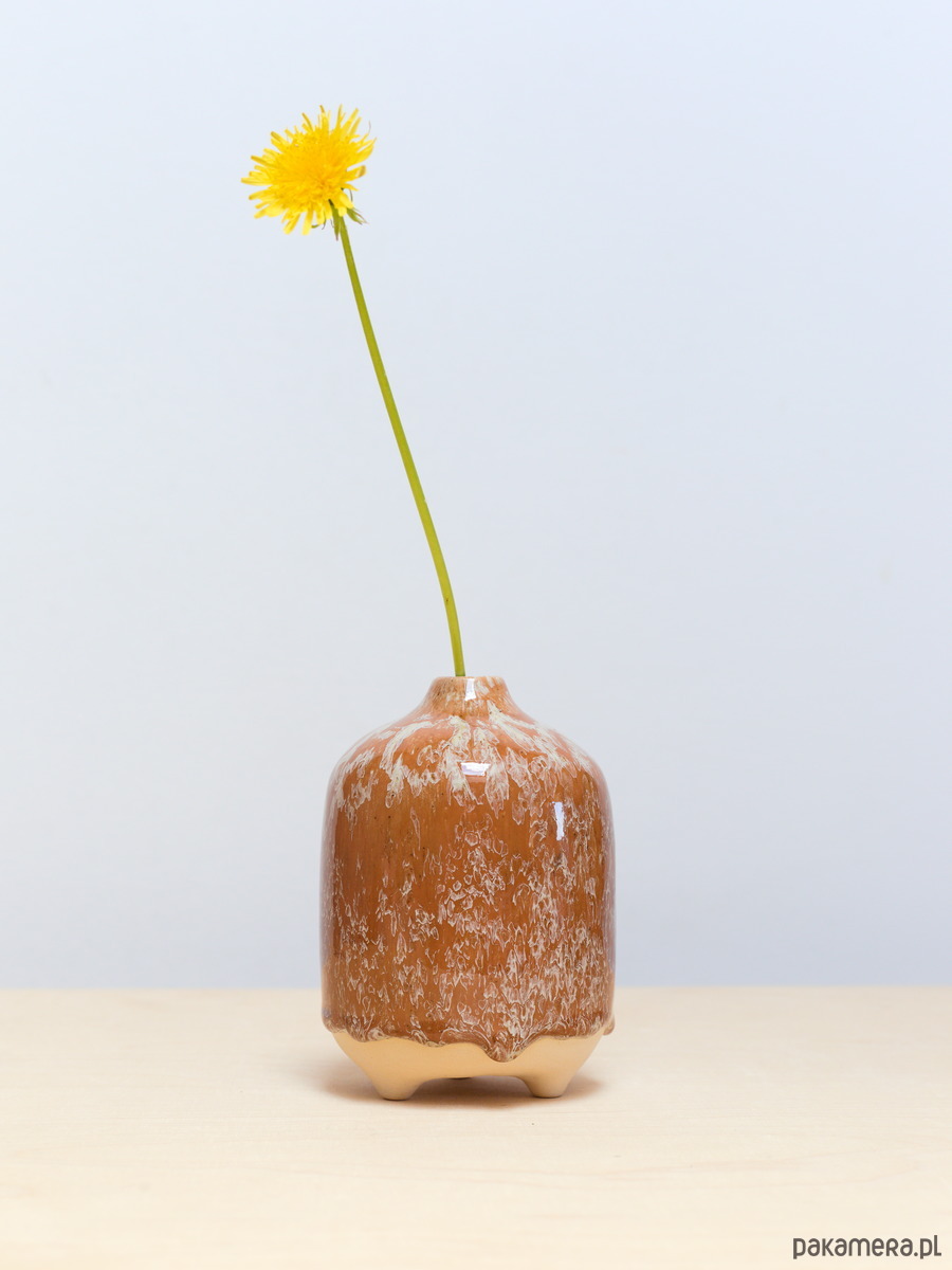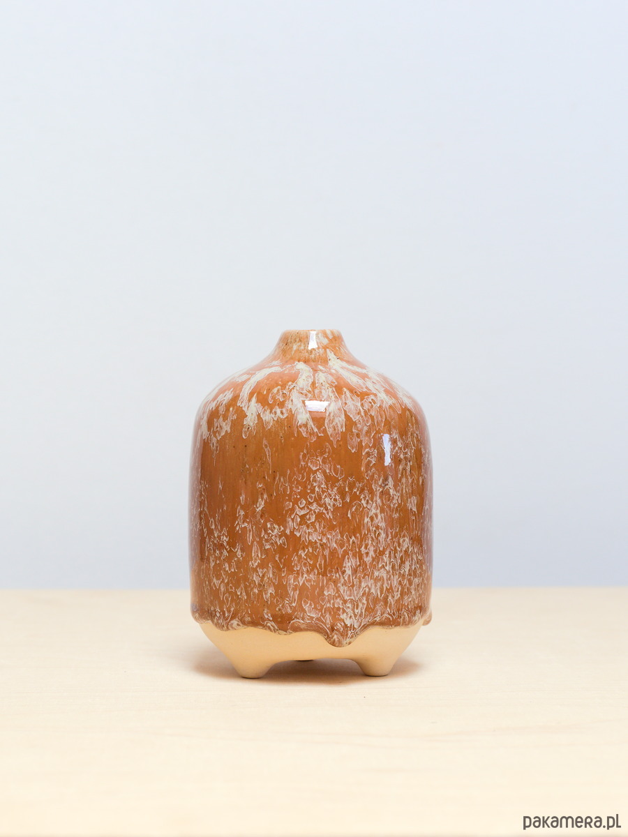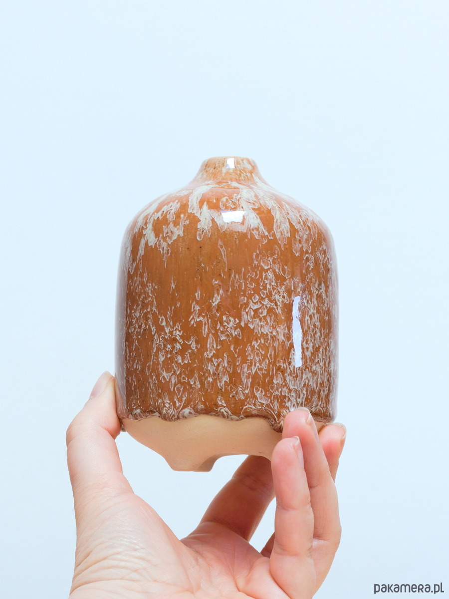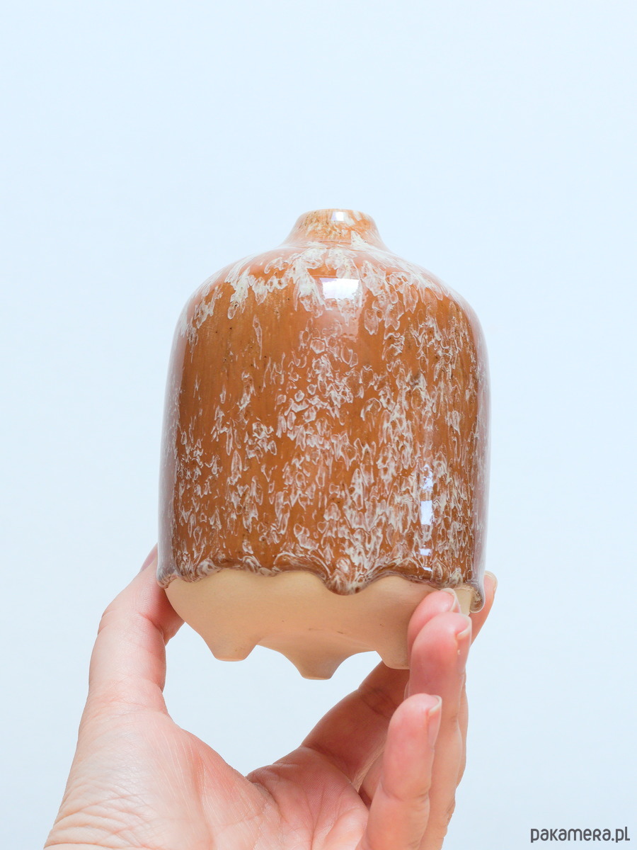 Wazoniki są w pełni szkliwione wewnątrz i częściowo z zewnątrz ukazując beżową glinę i ręcznie rzeźbione stopki u podstawy.