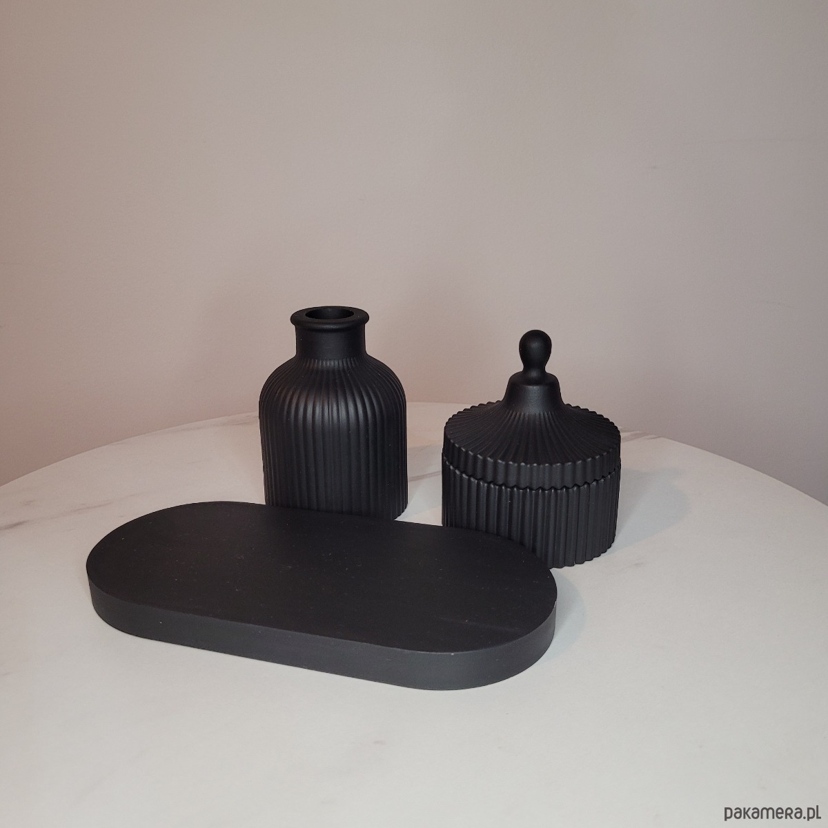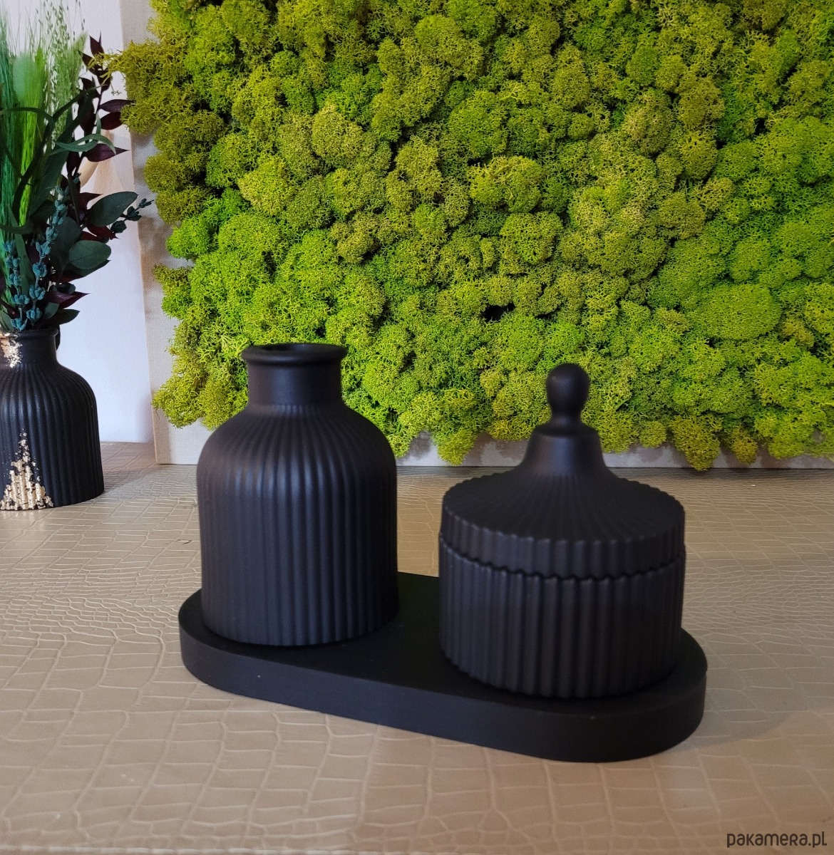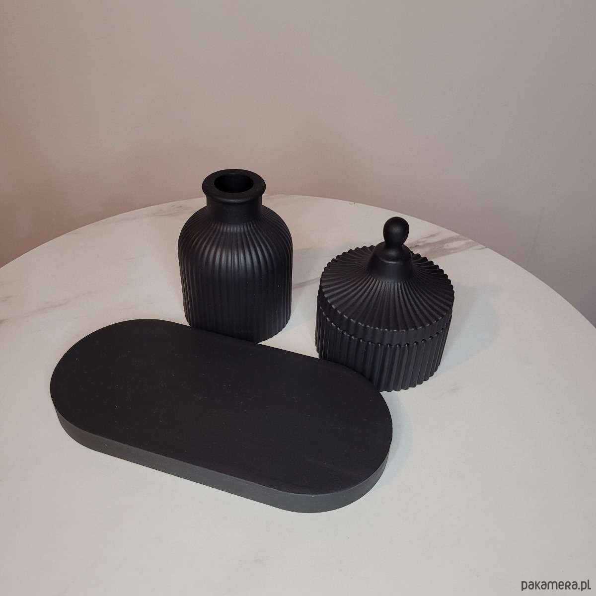 Wazon świetnie prezentuje się samodzielnie lub z suszonymi kwiatami, a stylowy pojemnik z pokrywką będzie idealnym miejscem do przechowywania drobiazgów: biżuterii, kluczy czy świec. Owalna podstawka łączy całą kompozycję, nadając jej pełnię.