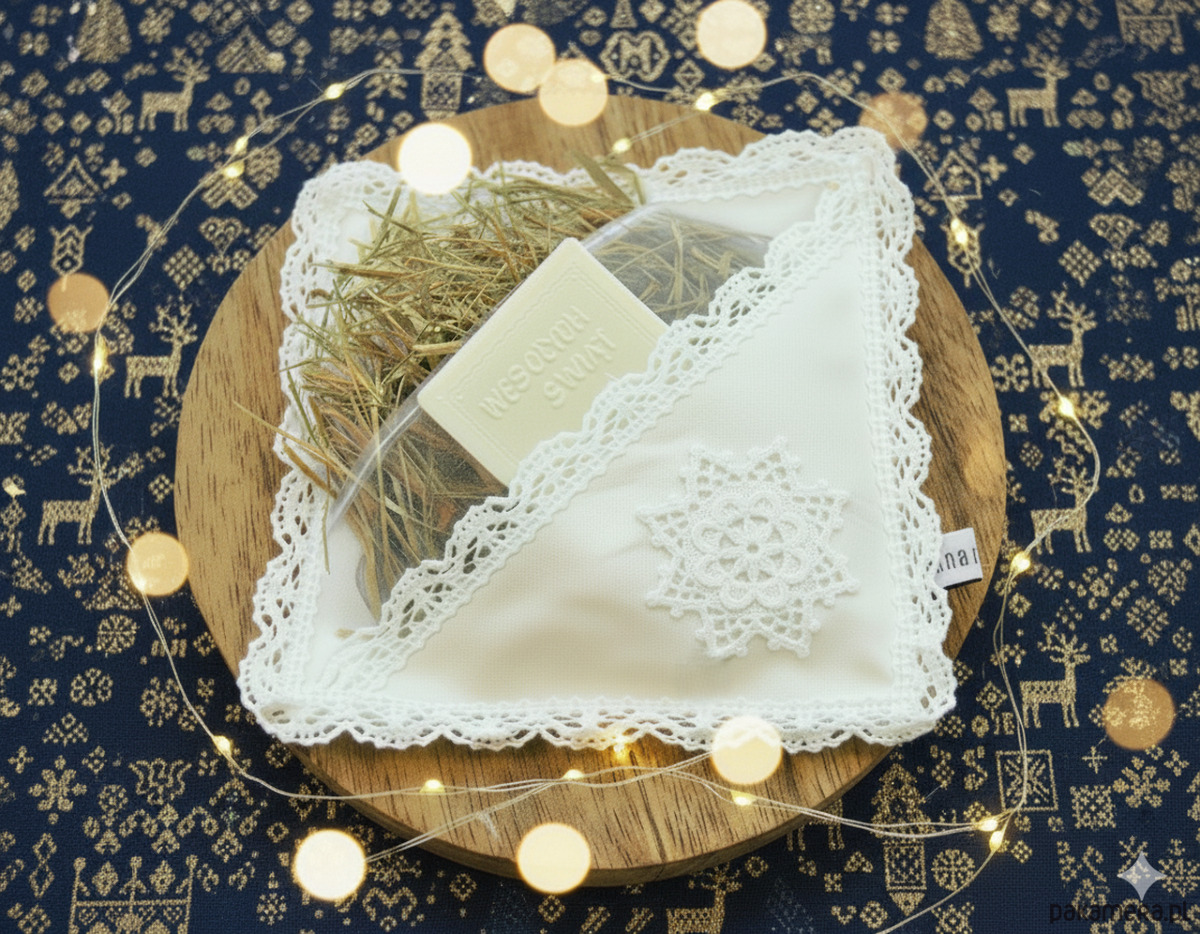 Gotowy Zestaw: W komplecie z siankiem i dekoracyjnym opłatkiem, by całość była od razu gotowa do uświetnienia wigilijnej wieczerzy.