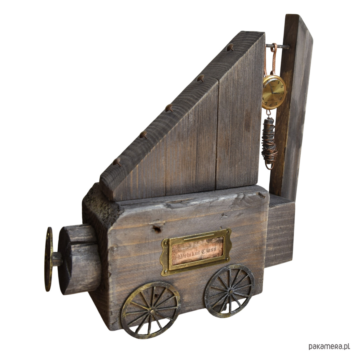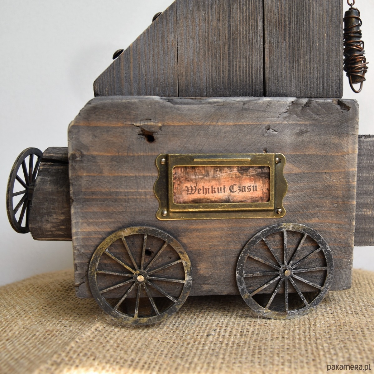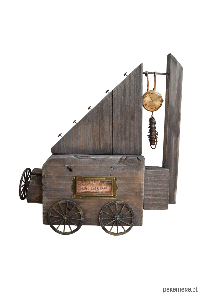 Dekoracja z serii "Wehikuł Czasu" wykonana z kawałków starego drewna "z odzysku", część z nich wyrzucona przez morze, z listewki sosnowej, sklejkowych kół, starej śruby, dekorów metalowych, zawieszki z gliny i miedzianego drutu, a także starego, niesprawnego już zegarka, który czasu biegnącego do przodu już nie będzie odmierzał, ale może przeniesie kogoś do czasów dzieciństwa, gdy zabawa przedmiotami pozornie nieprzydatnymi była esencją stanu "bez czasu" ;) Niedoskonałości drewna z otworami po gwoździach, nierównościami czy stare przedmioty użyte w projekcie nadają mu surowego charakteru i składają się na jego historię. Seria "Wehikułów Czasu" nawiązuje także do filozofii wabi-sabi, stąd wykorzystanie materiałów starych, używanych, "dziwnych", uratowanych przed wyrzuceniem albo wyszukanych wśród staroci czy na bałtyckiej plaży, a niedoskonałość samych (nadżartych czasem) materiałów ma nadawać dekoracjom unikalny charakter.