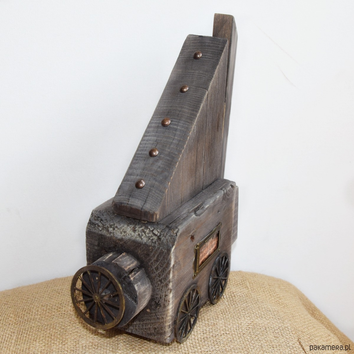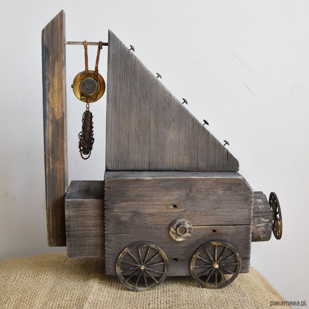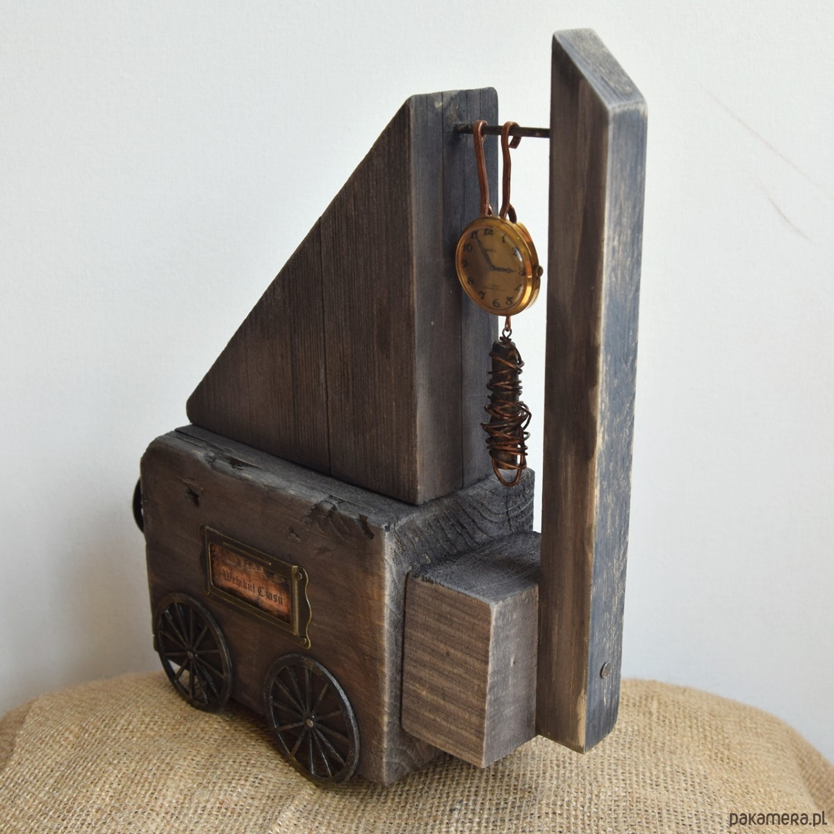 Dekoracja z serii "Wehikuł Czasu" wykonana z kawałków starego drewna "z odzysku", część z nich wyrzucona przez morze, z listewki sosnowej, sklejkowych kół, starej śruby, dekorów metalowych, zawieszki z gliny i miedzianego drutu, a także starego, niesprawnego już zegarka, który czasu biegnącego do przodu już nie będzie odmierzał, ale może przeniesie kogoś do czasów dzieciństwa, gdy zabawa przedmiotami pozornie nieprzydatnymi była esencją stanu "bez czasu" ;) Niedoskonałości drewna z otworami po gwoździach, nierównościami czy stare przedmioty użyte w projekcie nadają mu surowego charakteru i składają się na jego historię. Seria "Wehikułów Czasu" nawiązuje także do filozofii wabi-sabi, stąd wykorzystanie materiałów starych, używanych, "dziwnych", uratowanych przed wyrzuceniem albo wyszukanych wśród staroci czy na bałtyckiej plaży, a niedoskonałość samych (nadżartych czasem) materiałów ma nadawać dekoracjom unikalny charakter.