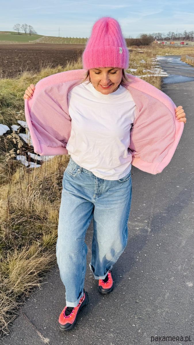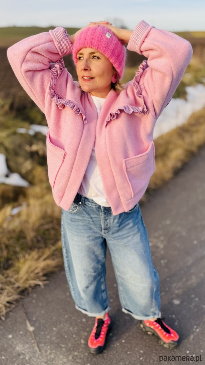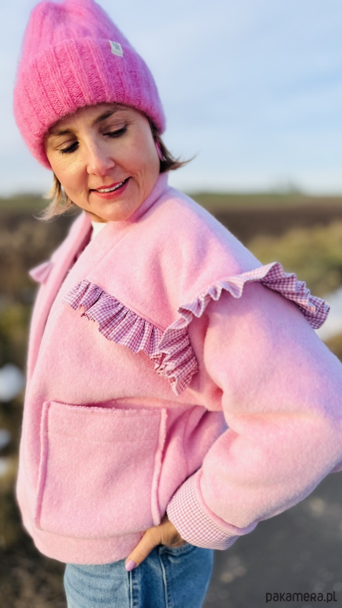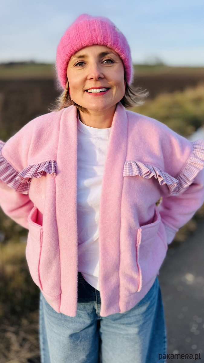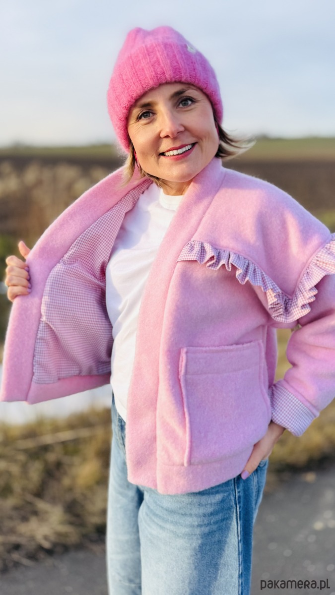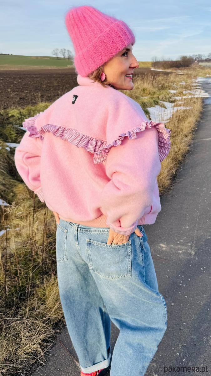 Wełniana bomberka z falbaną to wyjątkowa kurtka łącząca klasyczny sportowy fason z subtelnymi, kobiecymi akcentami. Wykonana z wełny w pięknym odcieniu różu, zapewnia ciepło i komfort noszenia. Charakterystycznym elementem jest delikatna falbana biegnąca wzdłuż linii ramion, dodająca całości lekkości i oryginalnego wyrazu.