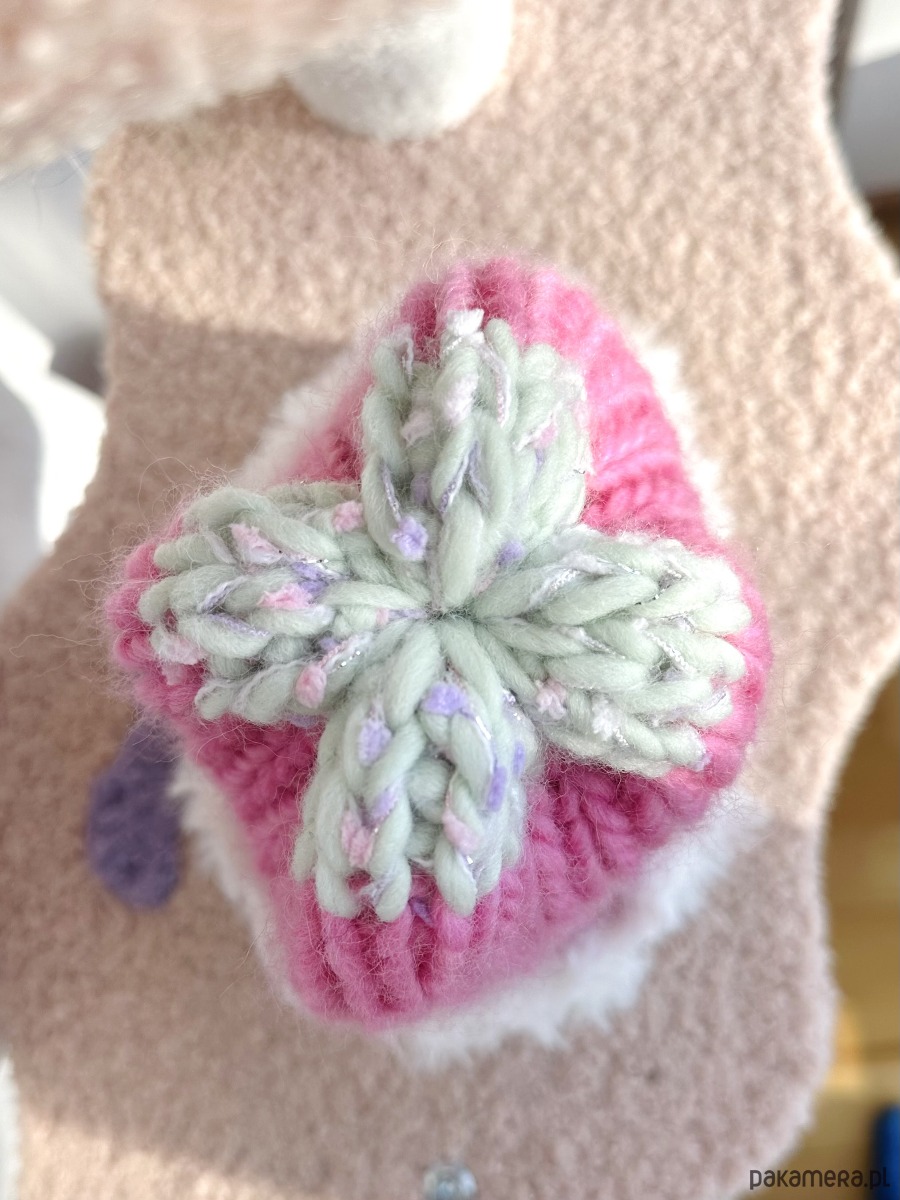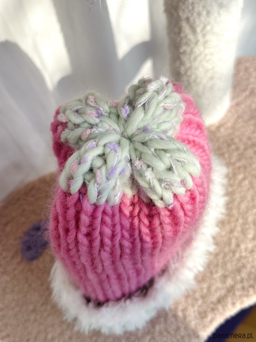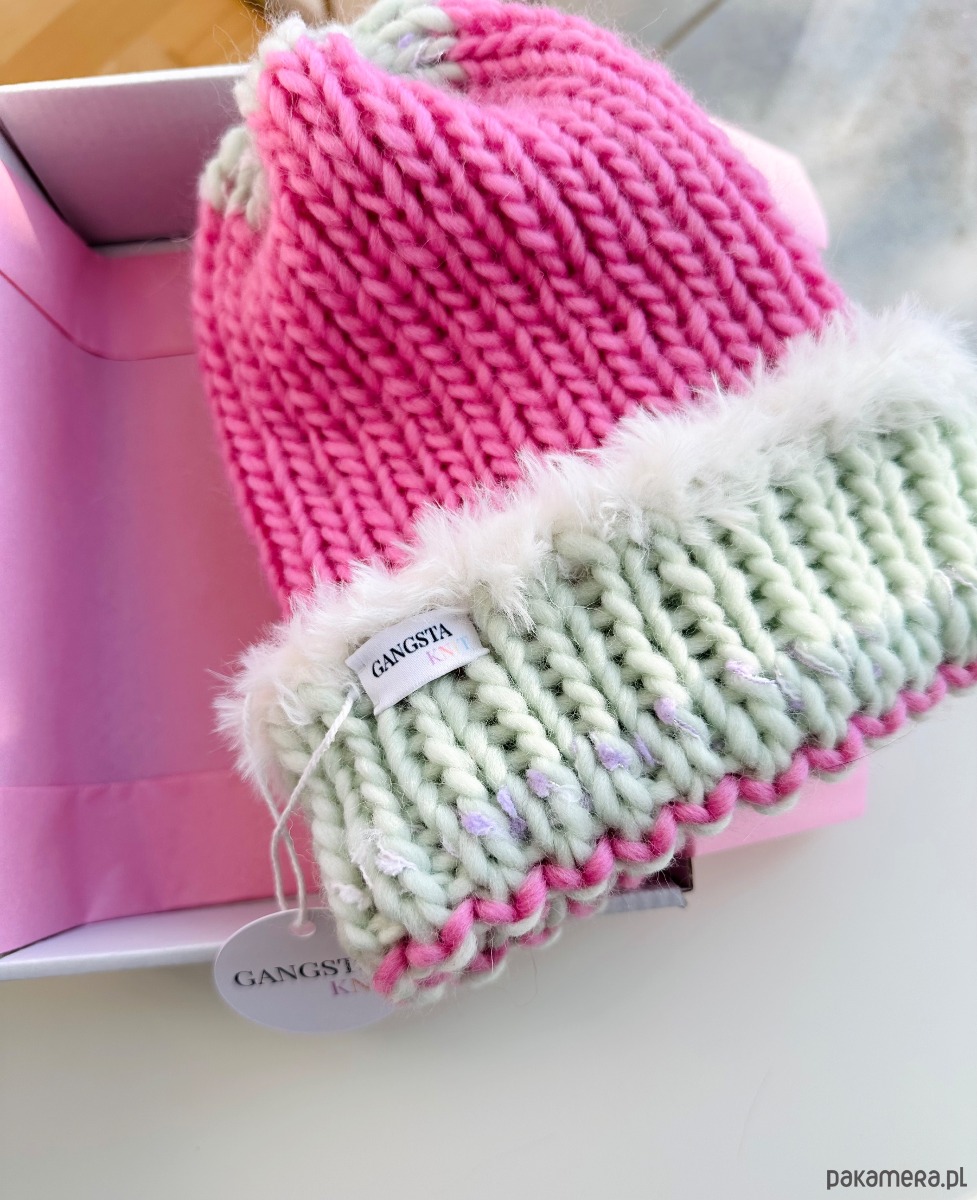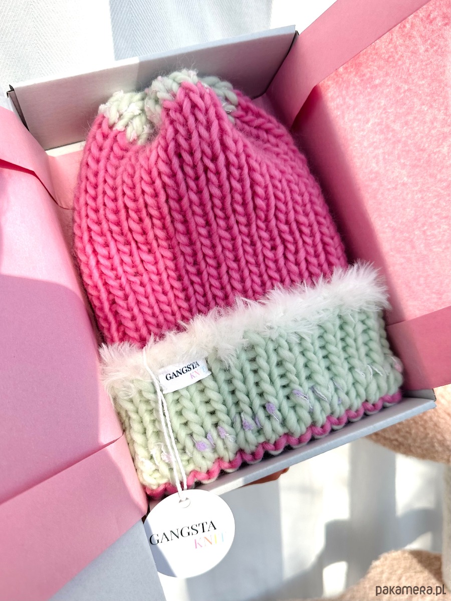 Wełniana czapka Candy handmade ręcznie robiona róż pistacja futerko