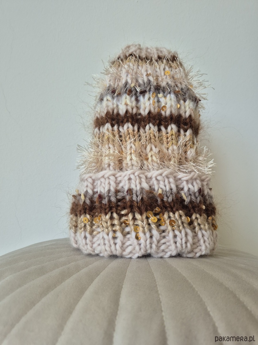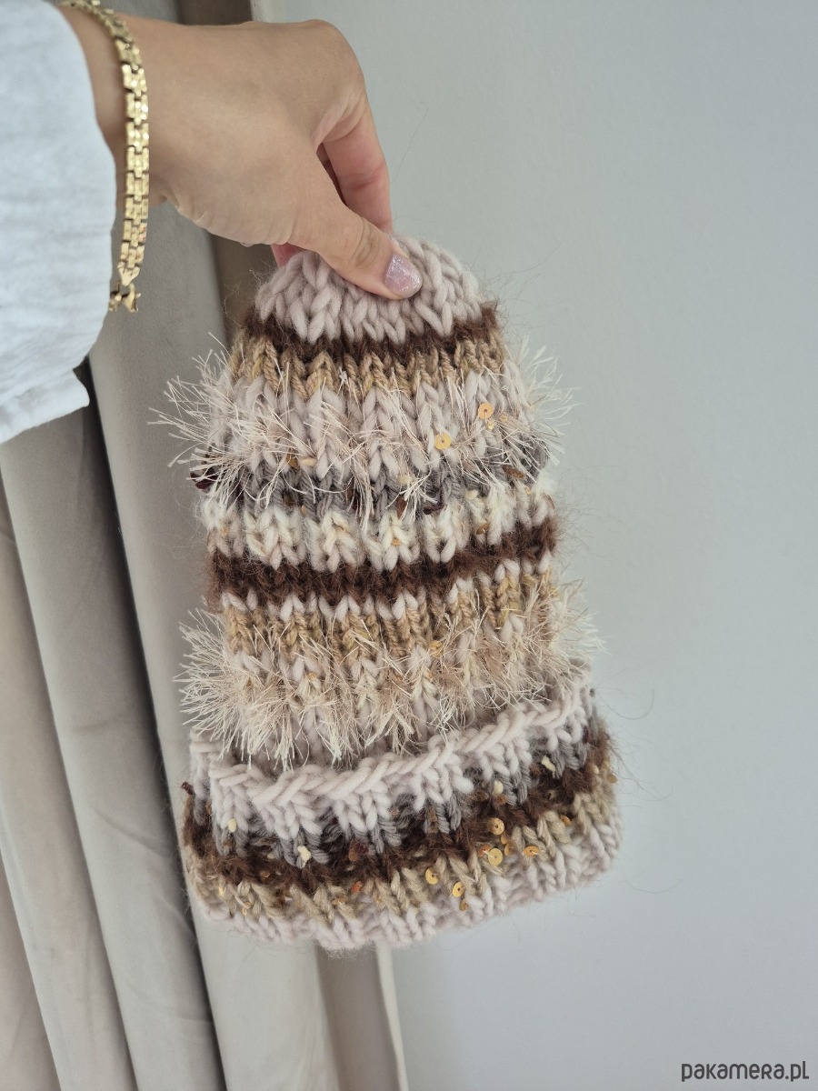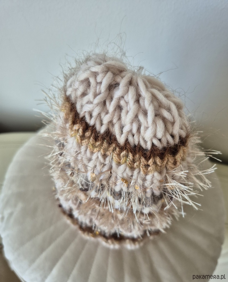 Ręcznie robiona czapka z miękkiej, puszystej włóczki w naturalnych odcieniach brązu, beżu i złota.