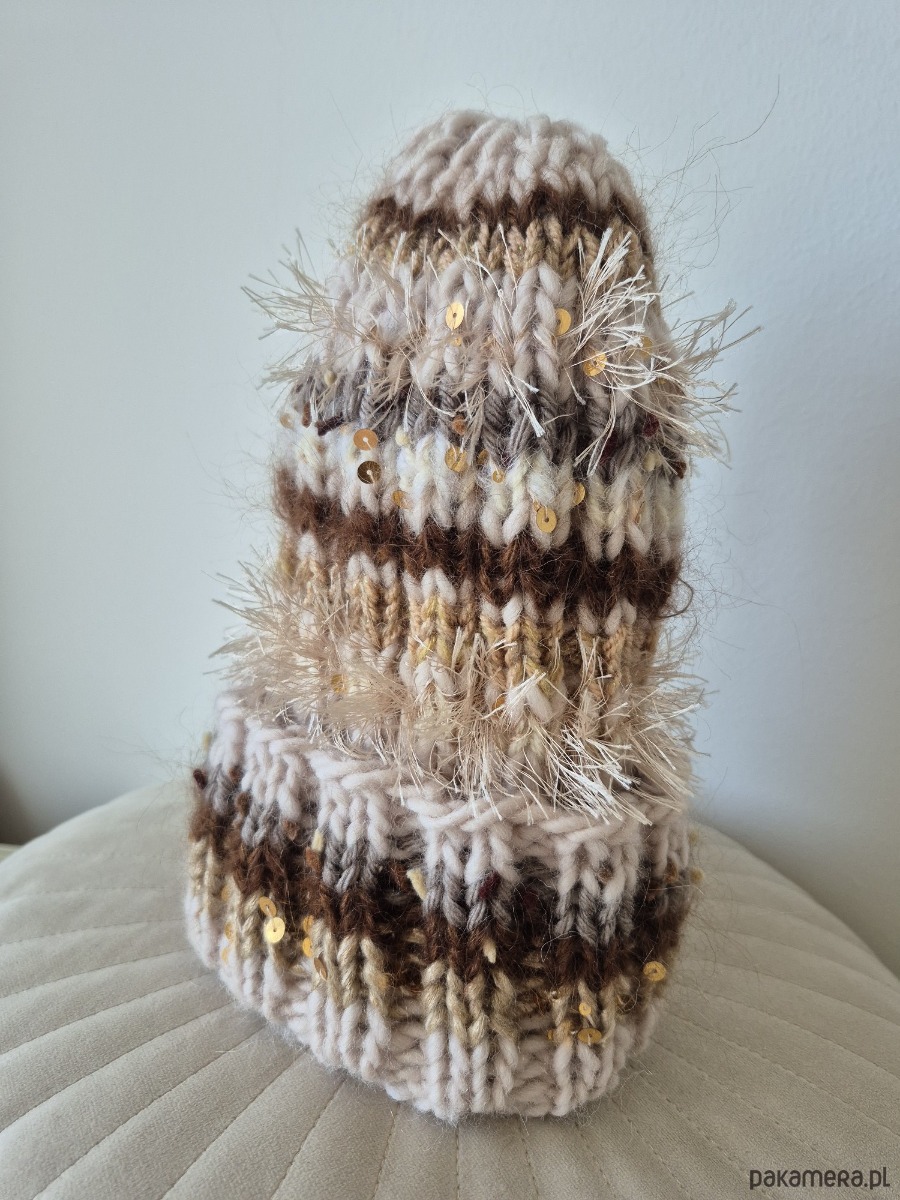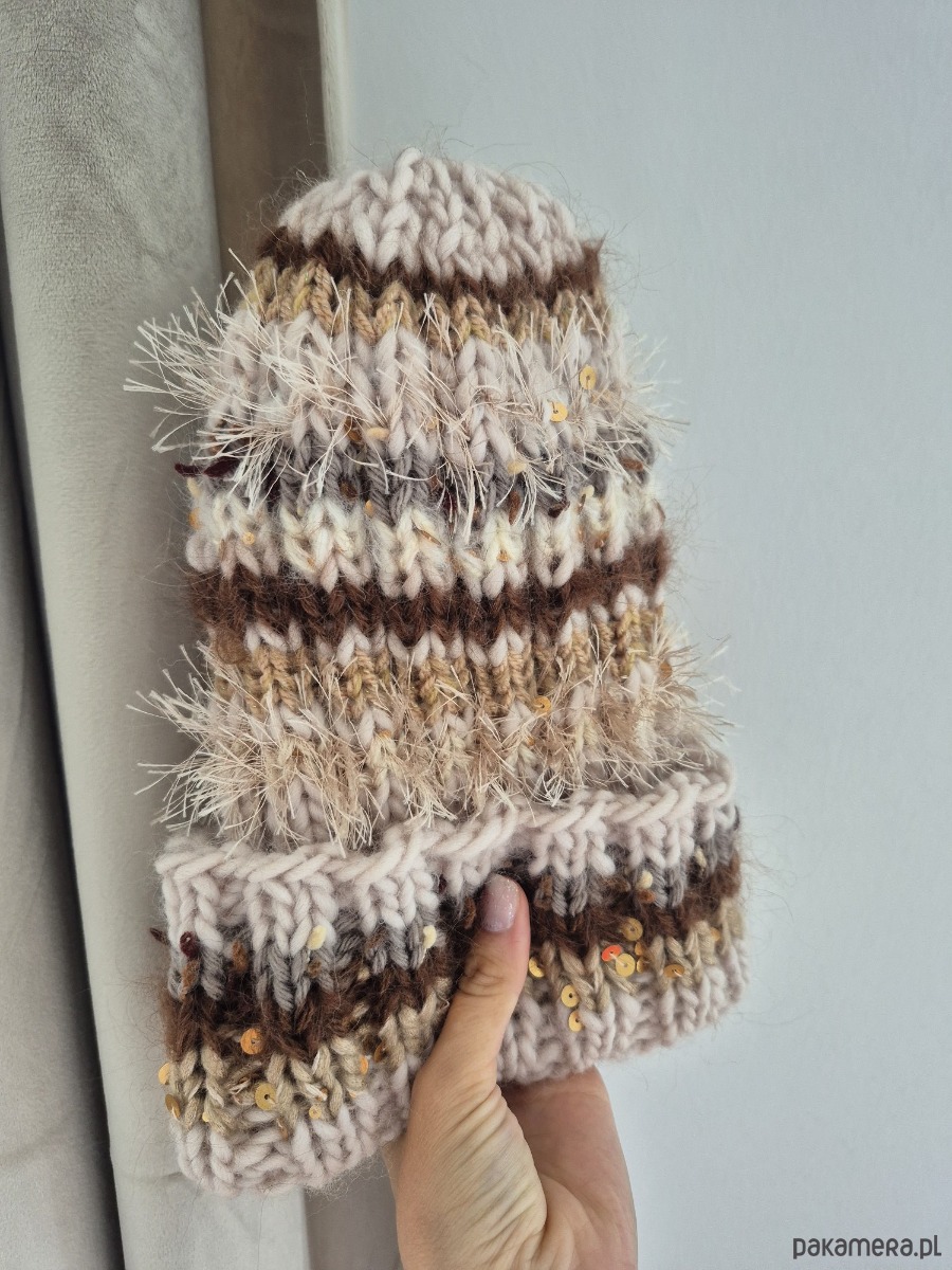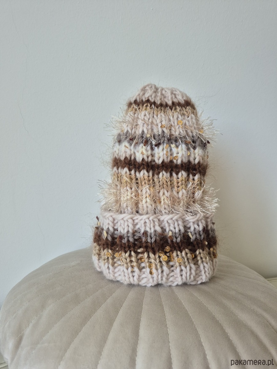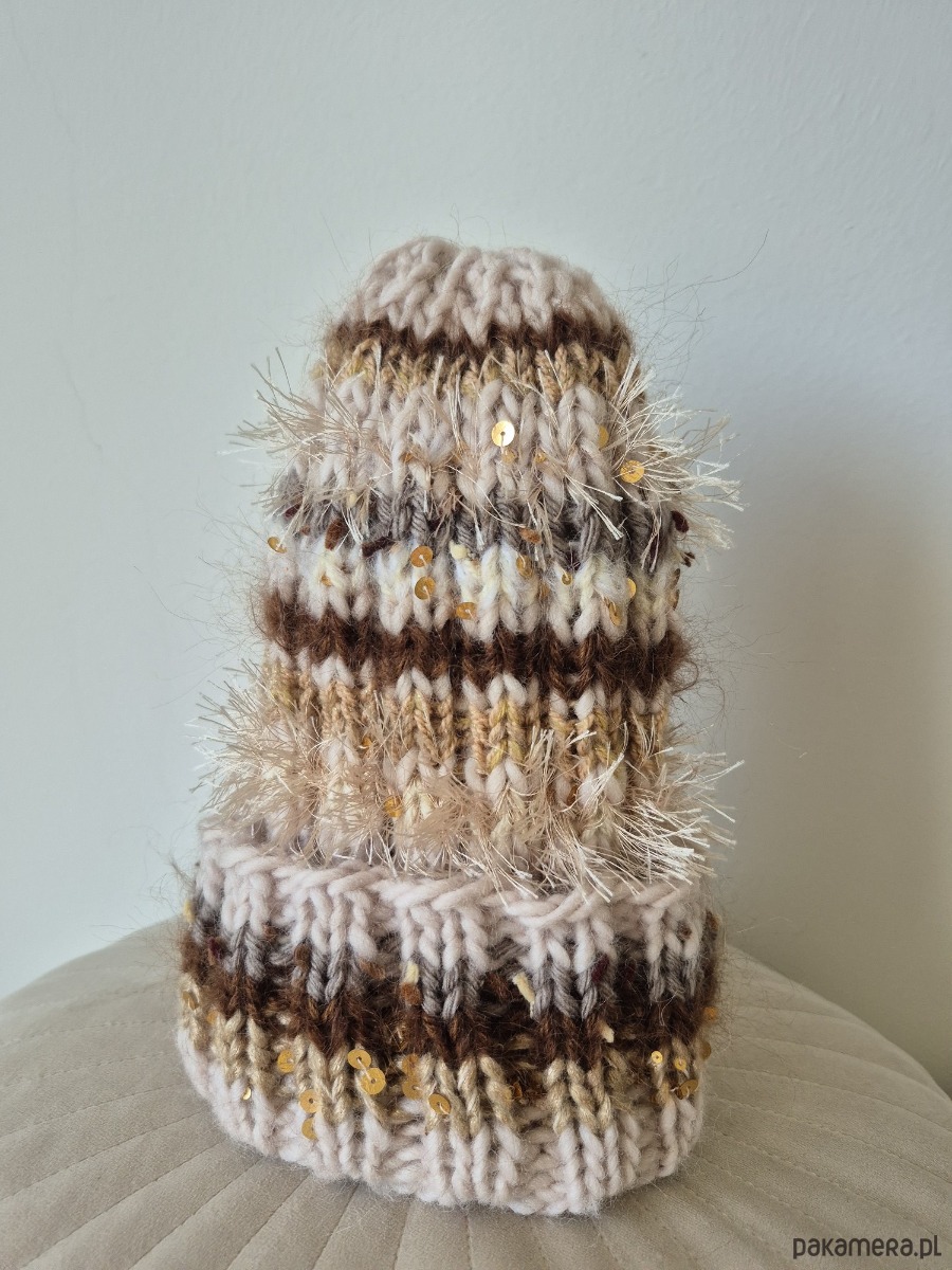 Ręcznie robiona czapka z miękkiej, puszystej włóczki w naturalnych odcieniach brązu, beżu i złota.