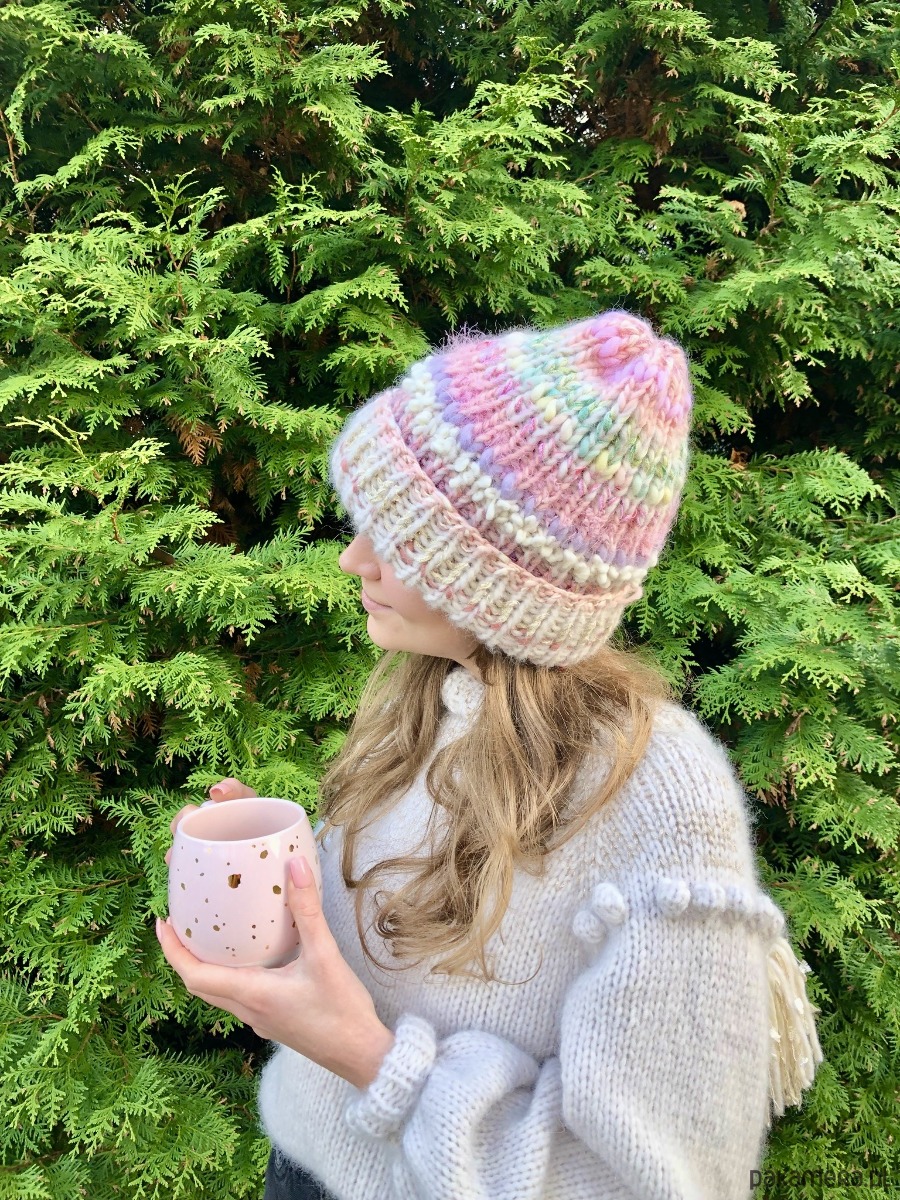 Wyjątkowa czapka wykonana z różnego rodzaju włóczek takich jak wełna merino, alpaka, bawełna oraz poliestrowe ozdobne nitki.