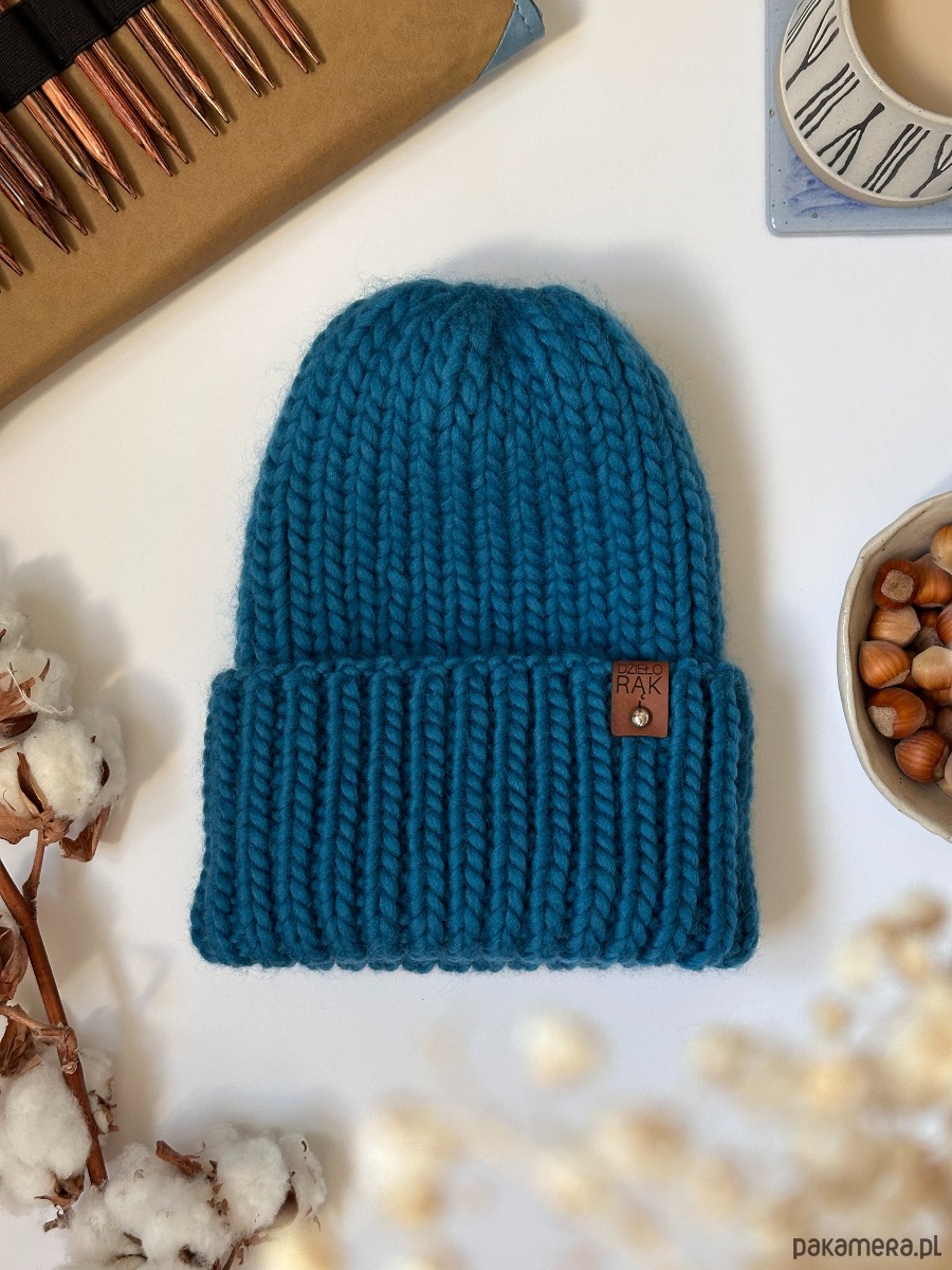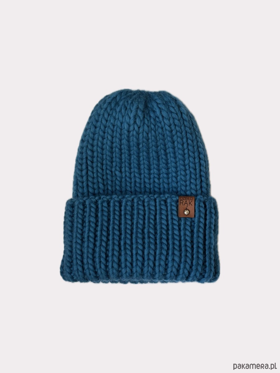 Zimowa czapka handmade w ponadczasowym, głębokim kolorze niebieskim.