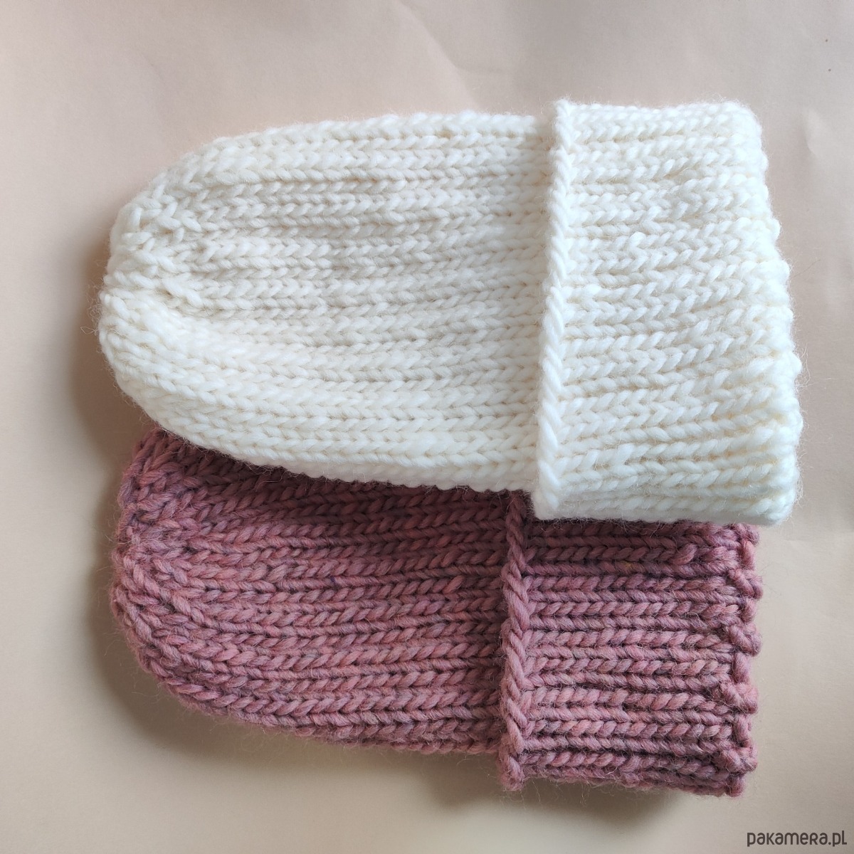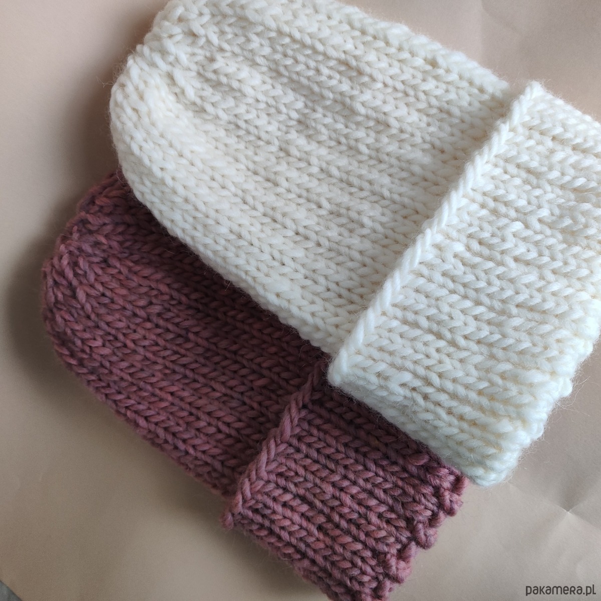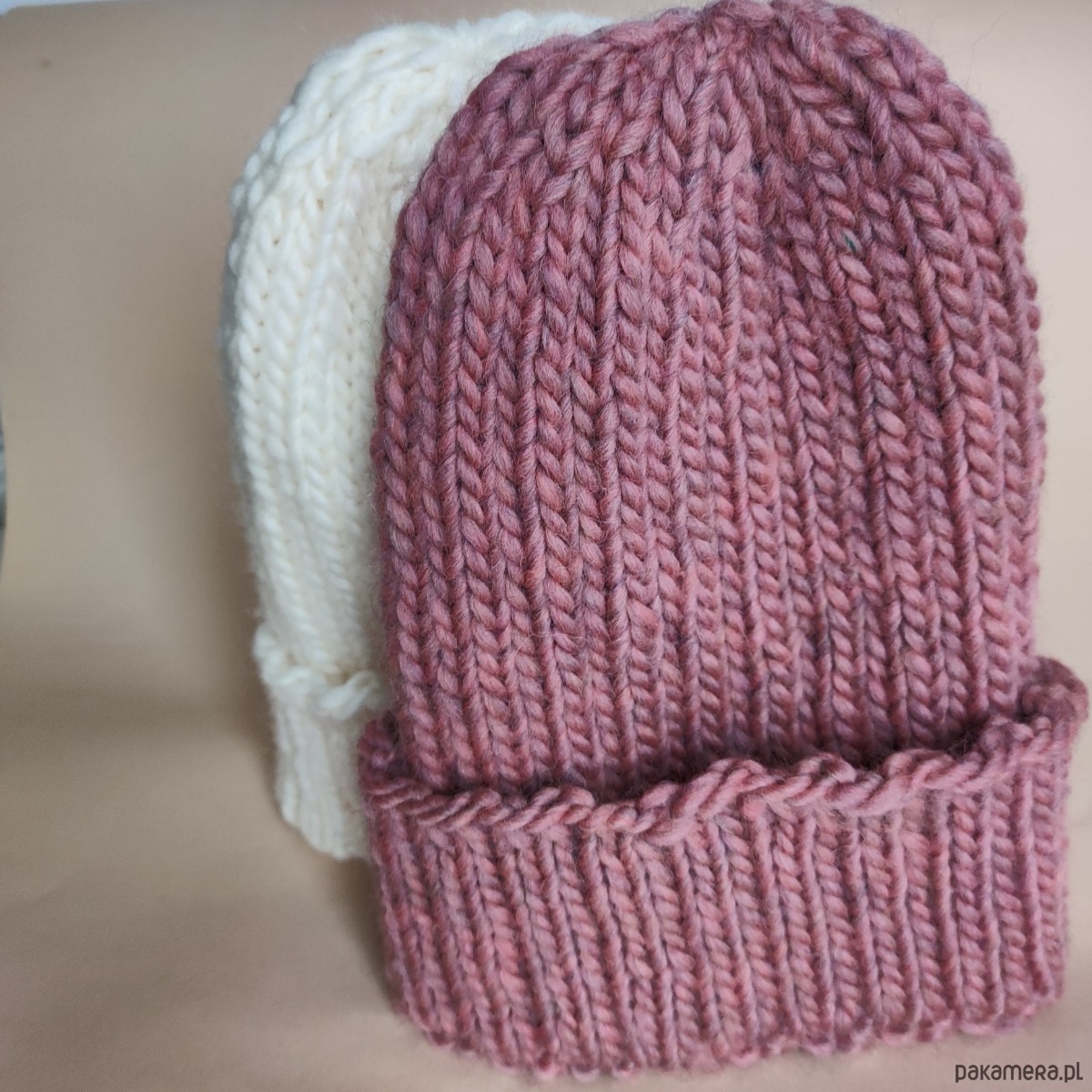 Czapki o mięsistym grubym splocie z naturalnym składem, w kolorze "brudnego różu" i "śmietanki"