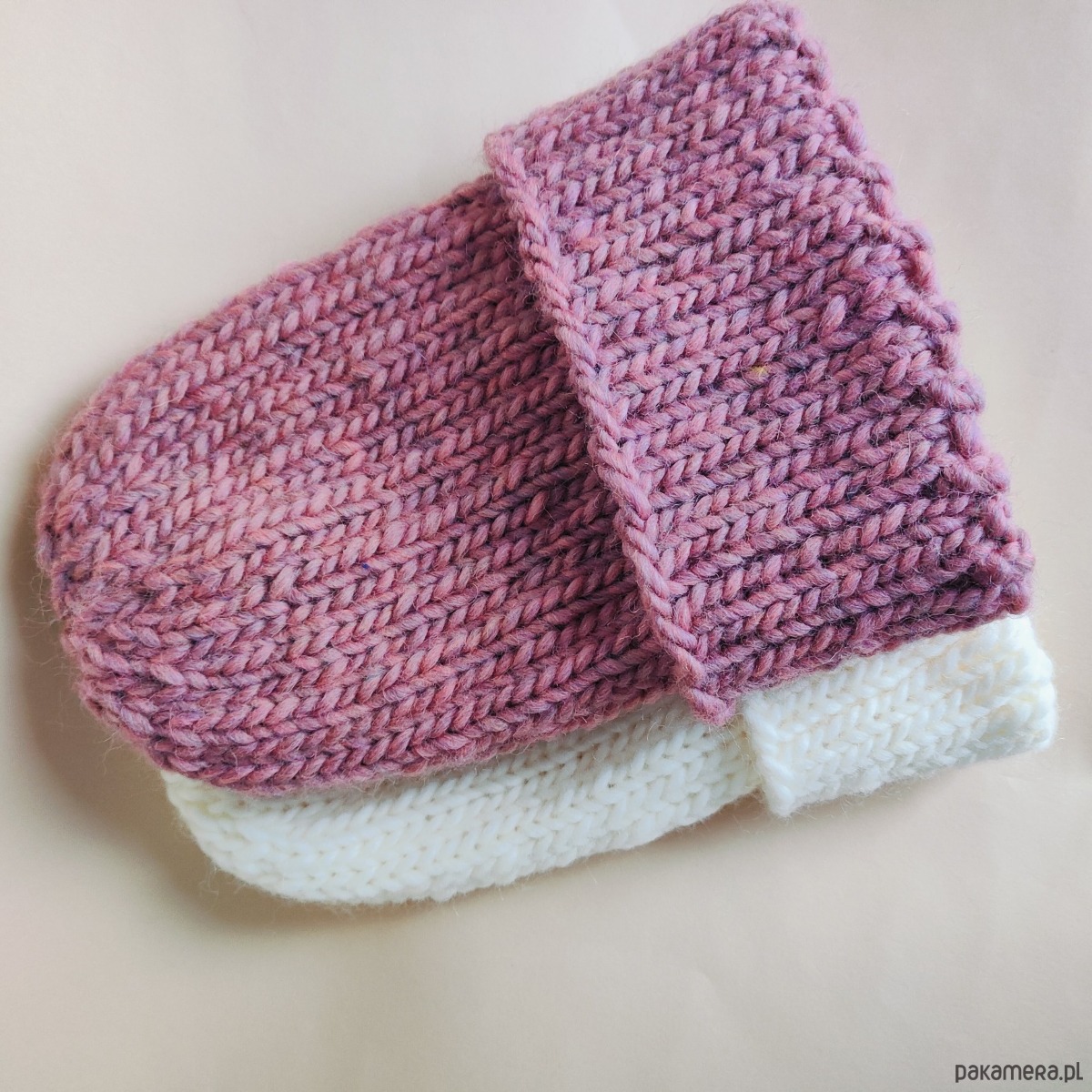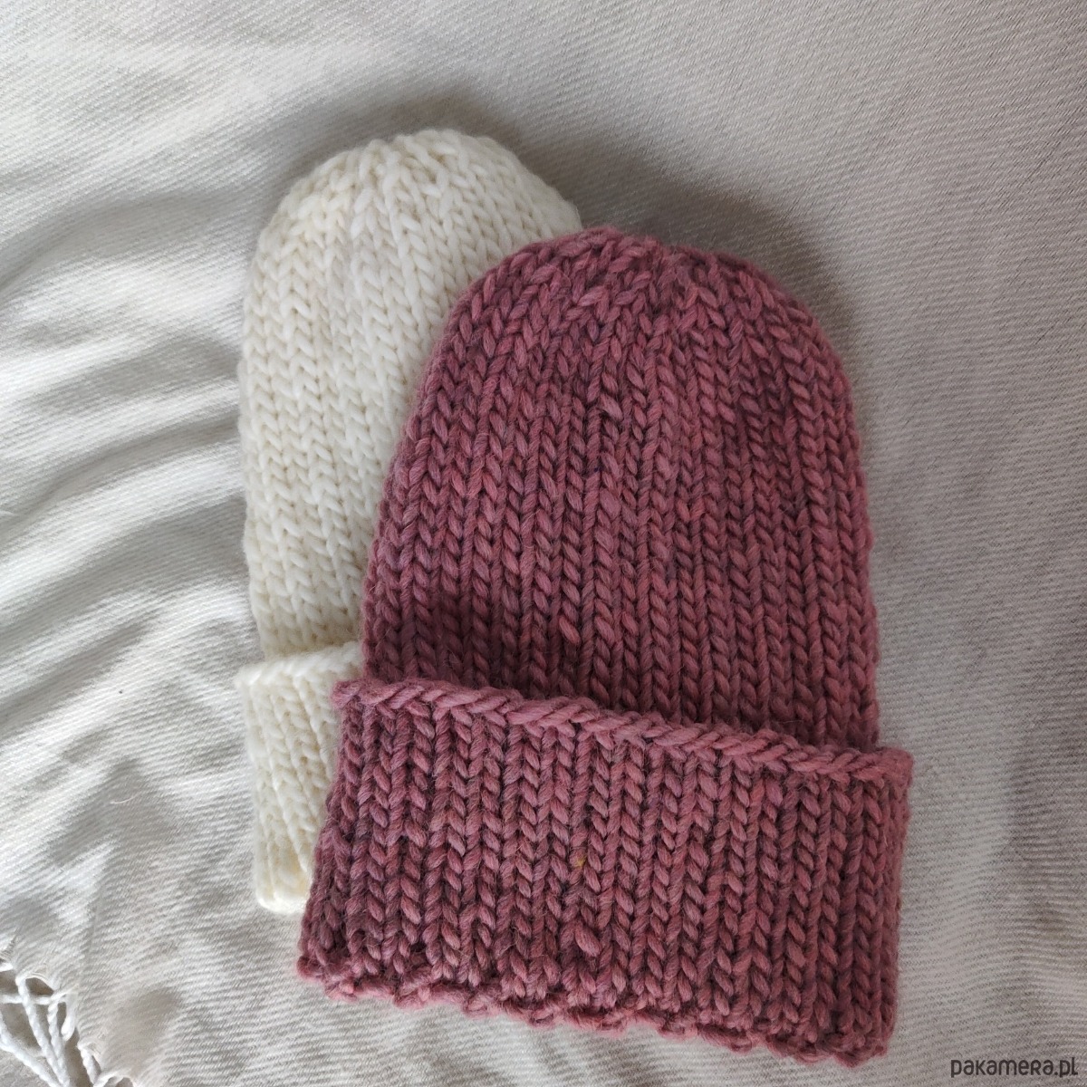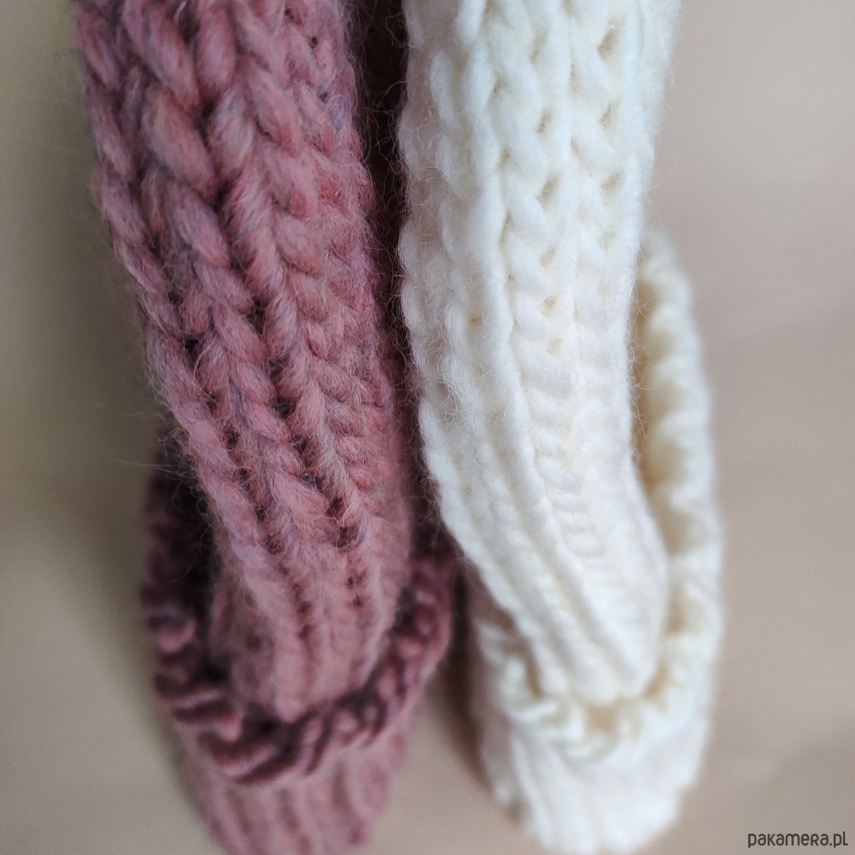 Czapki o mięsistym grubym splocie z naturalnym składem, w kolorze "brudnego różu" i "śmietanki"
