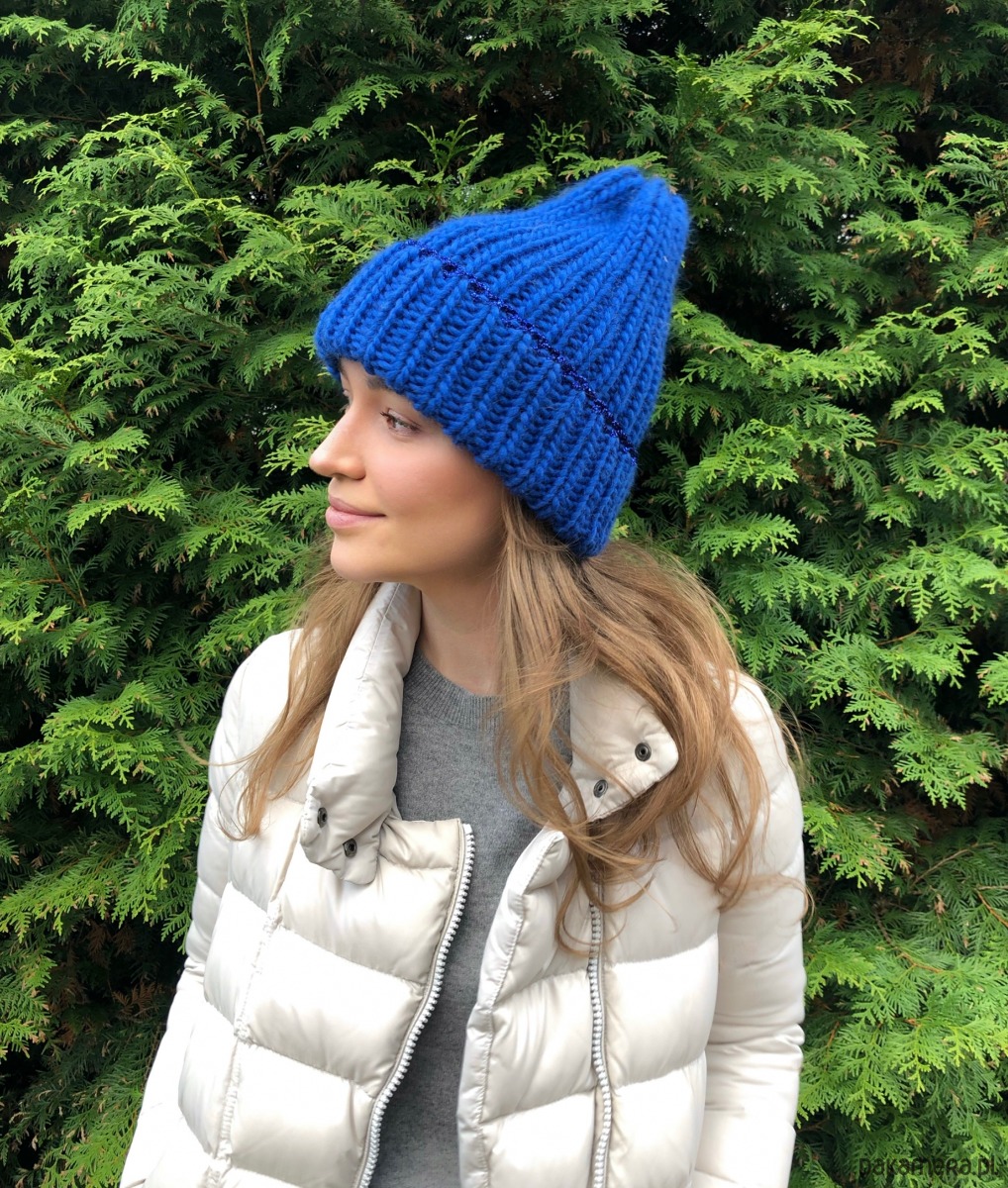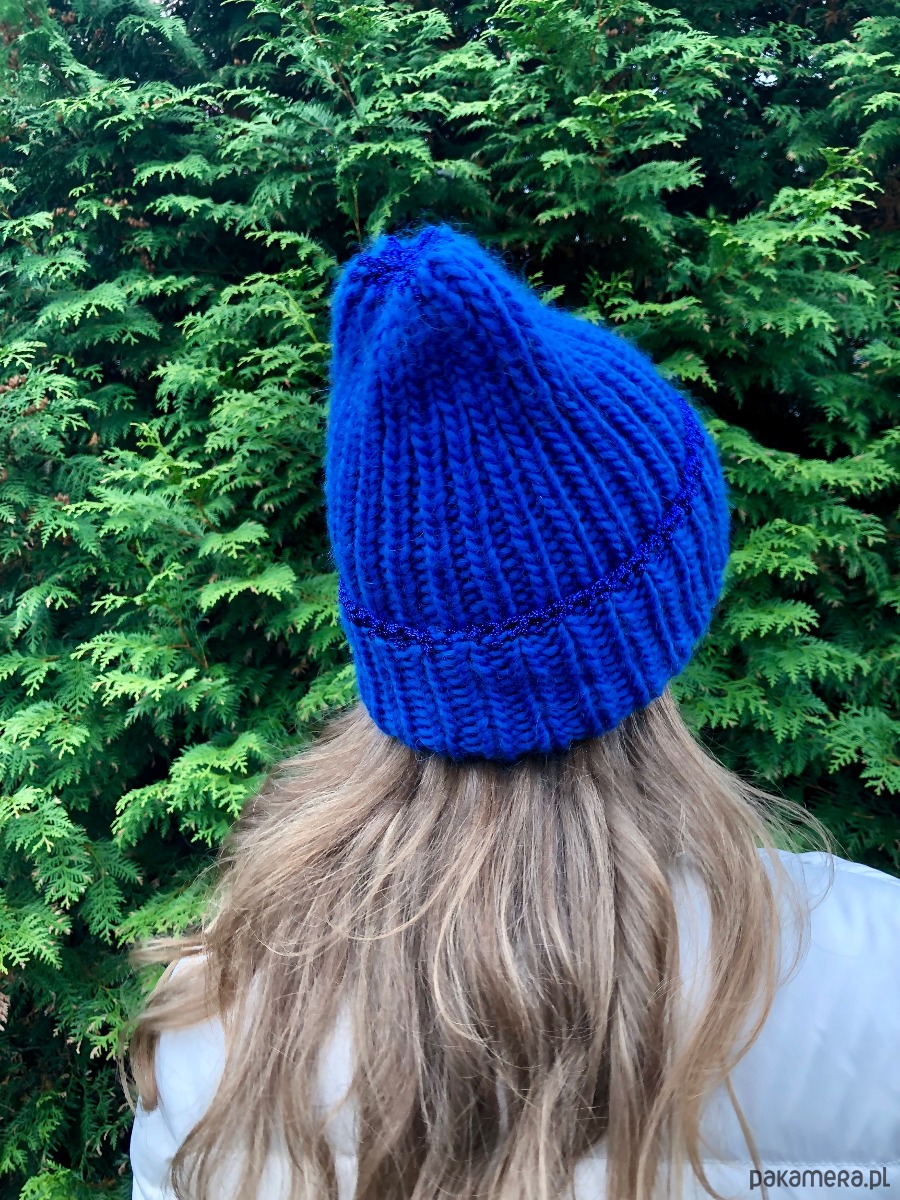 Wełniana czapka z dodatkiem błyszczącej nitki handmade ręczna robota kobalt
