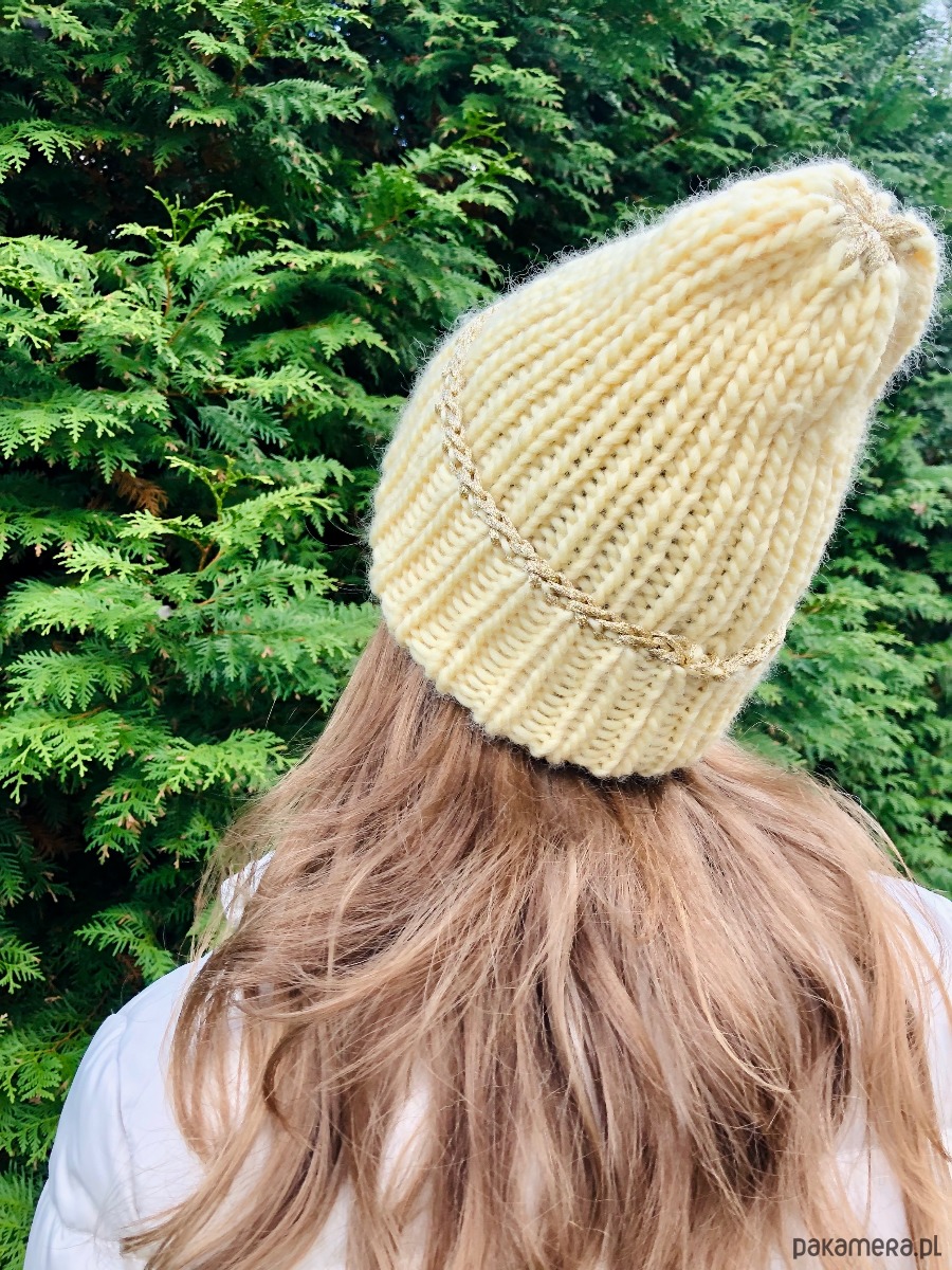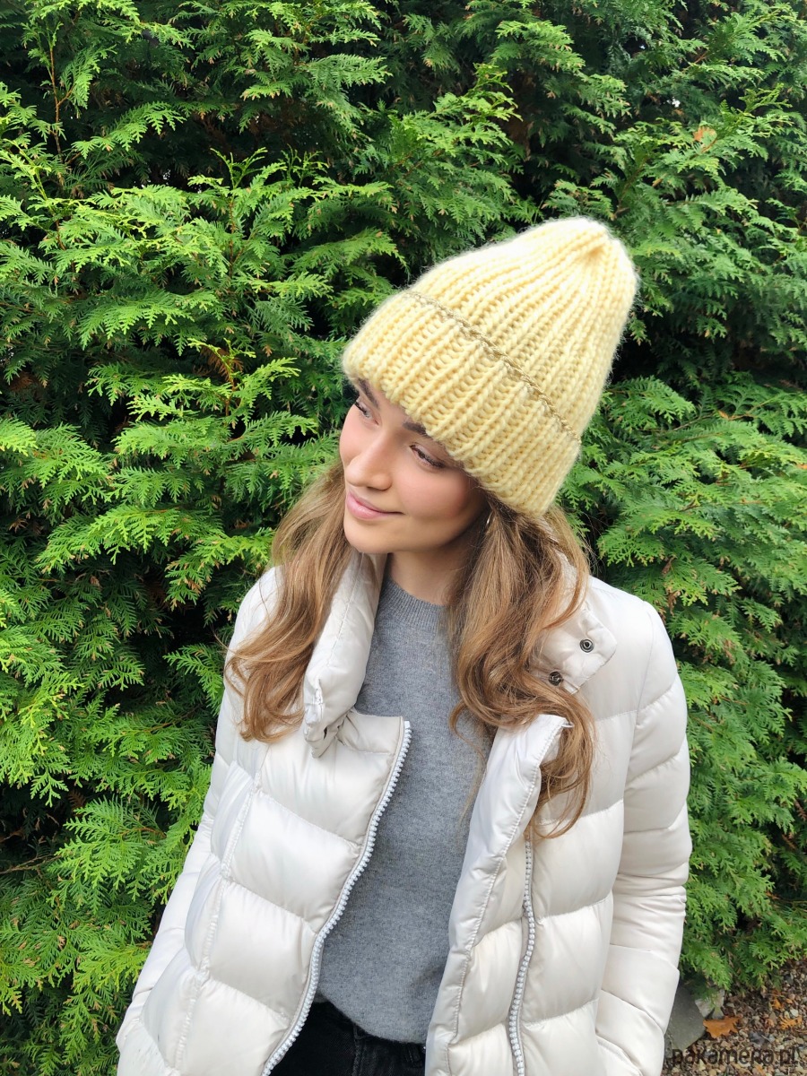 Wełniana czapka z dodatkiem błyszczącej nitki handmade żółta