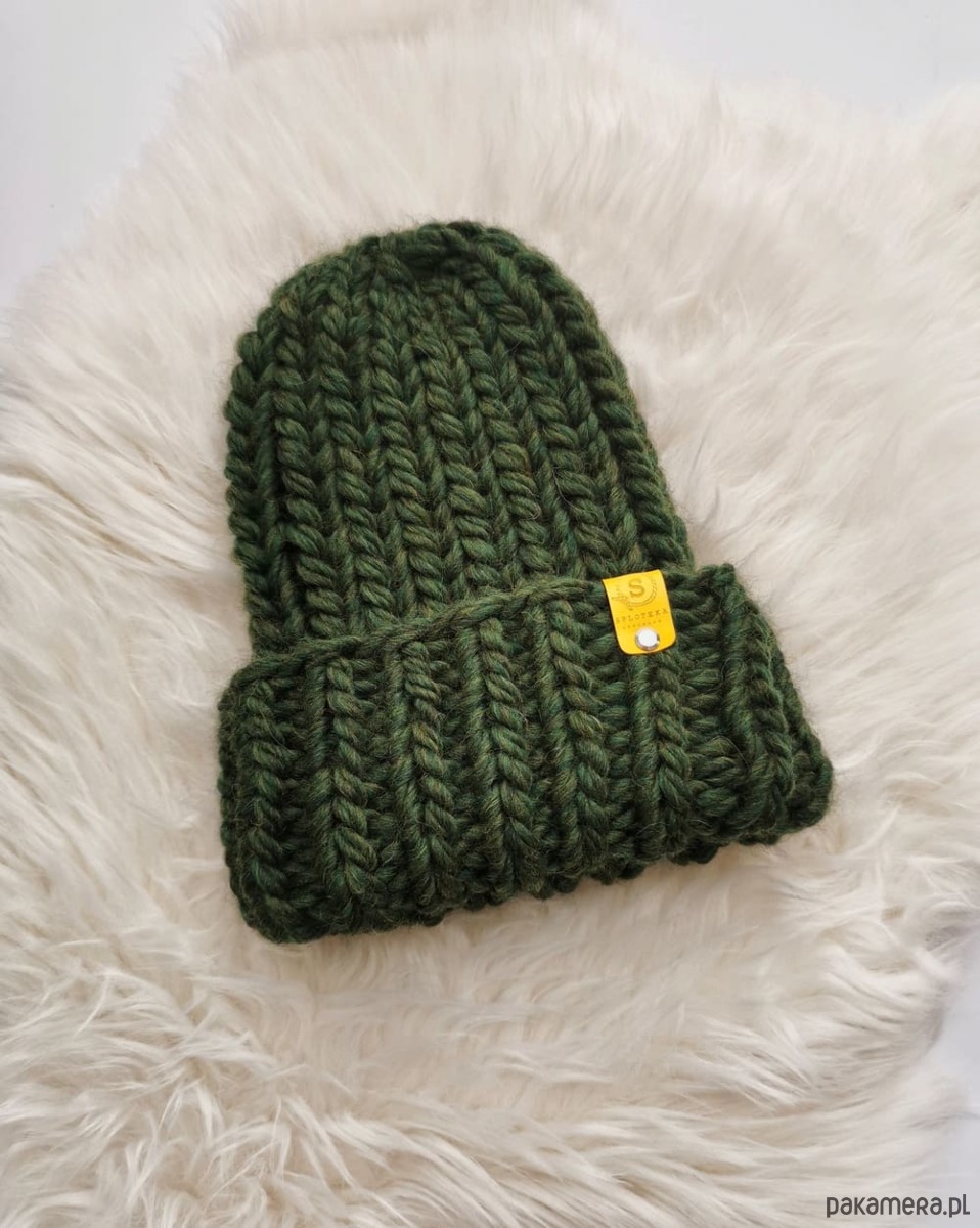 Czapka jest gruba i cieplutka, zrobiona ścisłym splotem,