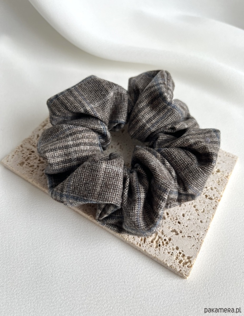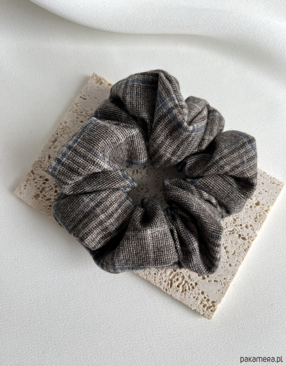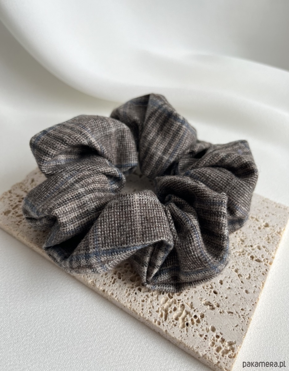 Scrunchie Grey Check - klasyka w kratkę. Ta gumka to minimalistyczny, a zarazem efektowny dodatek do jesiennej czy też zimowej stylizacji. Wykonana z miękkiej wełny, pięknie układa się na włosach, a wyjątkowy wzór w kratkę nadaje jej ponadczasowego, klasycznego charakteru.