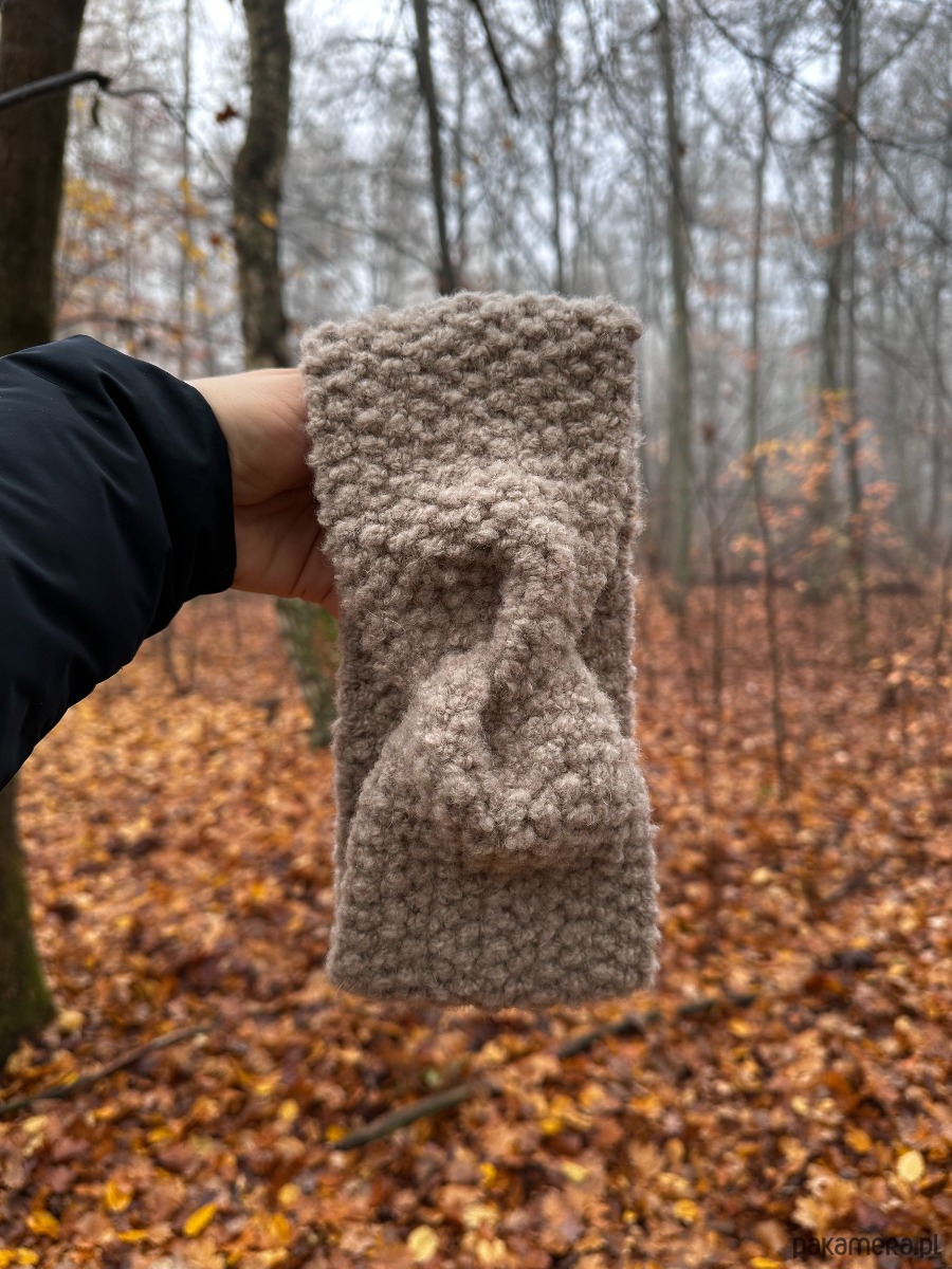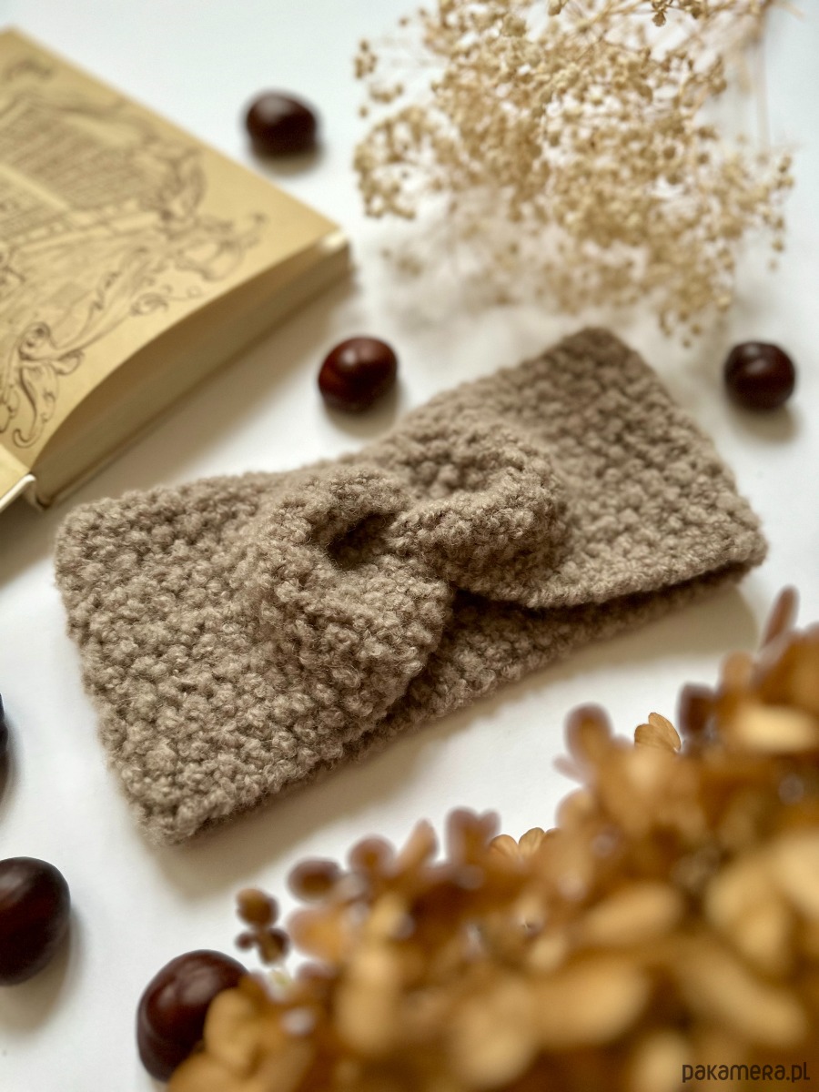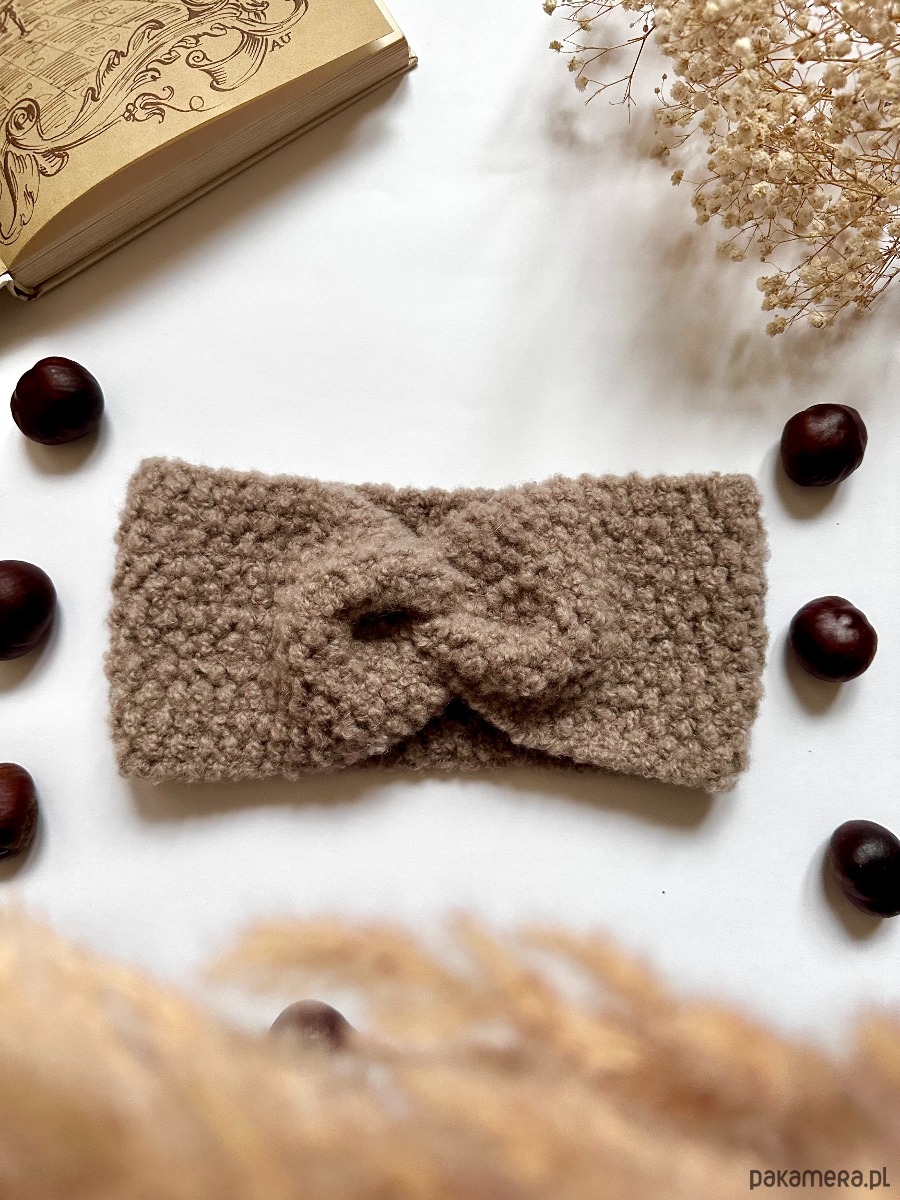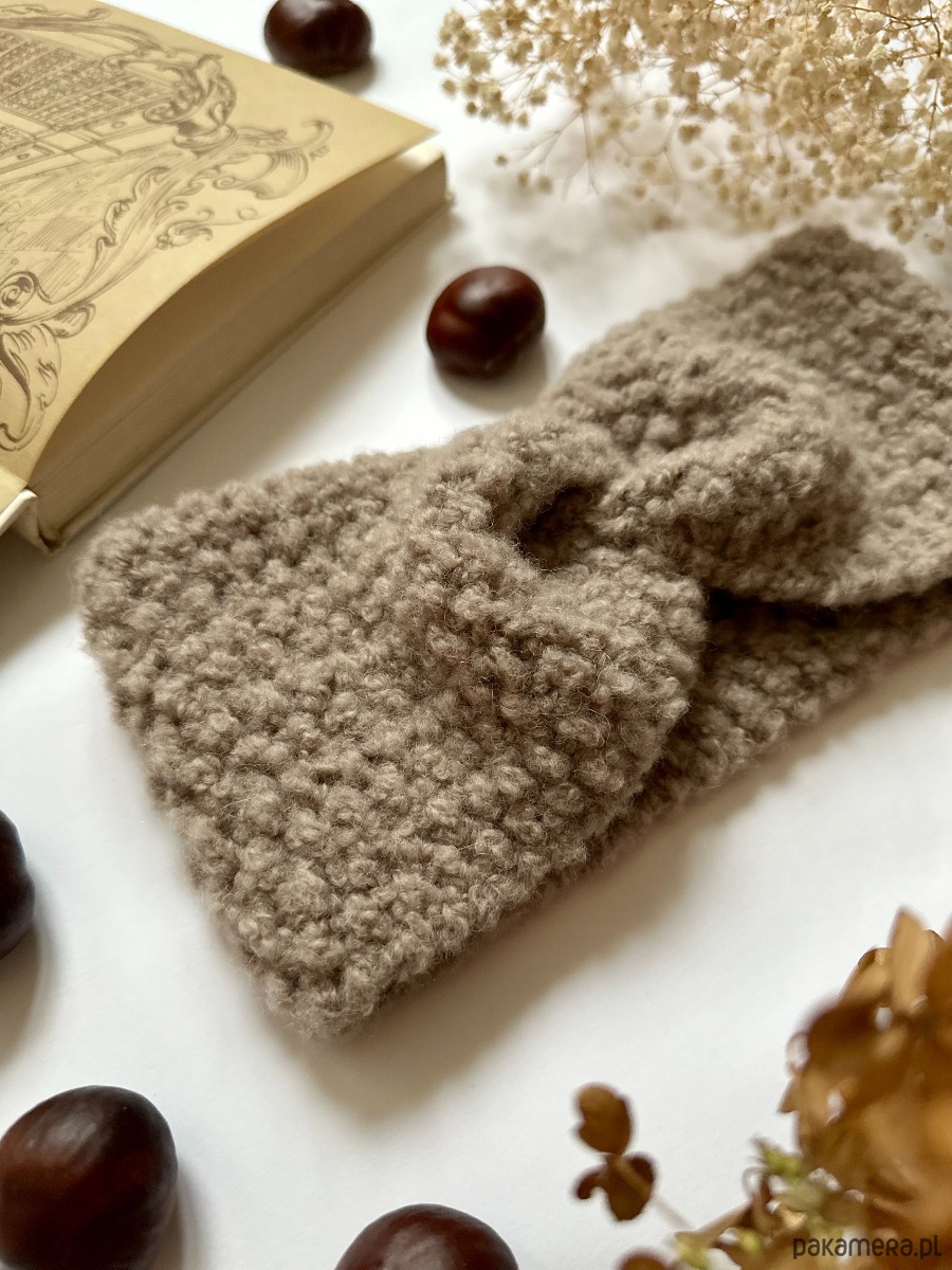 Opaska wełniana twist boucle, wykonana ręcznie na drutach, w ponadczasowym naturalnym kolorze ciemnego beżu.