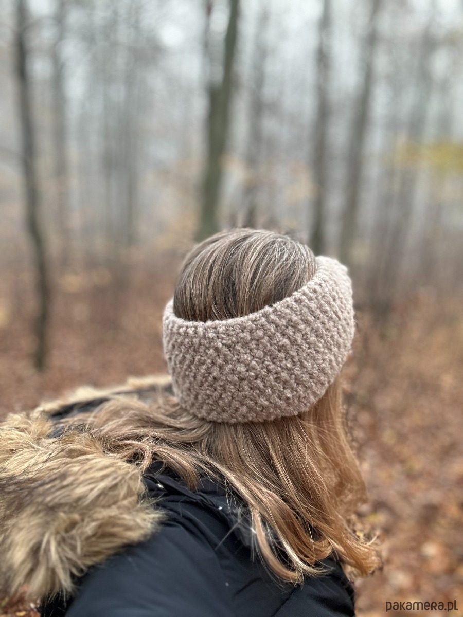Opaska jest zrobiona z dwóch nitek, aby była gruba i ciepła, idealna na zimne dni dla tych, co nie lubią czapek oraz ściegiem nadającym jej dużą objętość i ciekawą teksturę.