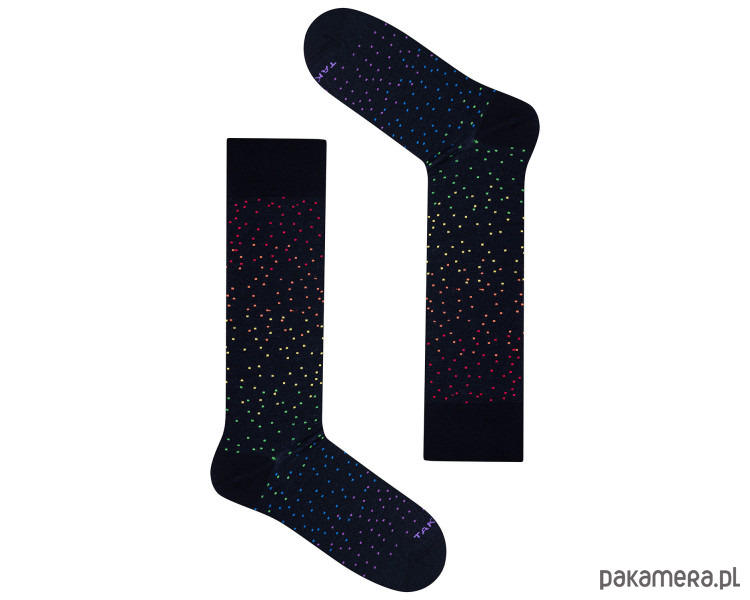 Jeśli poszukujesz skarpetek, które łączą w sobie komfort i elegancję, te długie, garniturowe skarpetki w kolorze granatowym z kolorowymi kropeczkami od Takapara są dla Ciebie. Wykonane w Łodzi z najwyższej jakości wełny merino, zapewniają luksus i funkcjonalność. Zalety takie jak doskonała termoregulacja, właściwości antybakteryjne i maksymalny komfort dzięki idealnie płaskiemu szwowi hand linked toe czynią je wyjątkowymi. Granatowy kolor skarpetek jest synonimem elegancji i profesjonalizmu, podczas gdy kolorowe kropeczki dodają nuty radosności i optymizmu. Ożywią one każdą formalną stylizację, pasując doskonale do granatowego garnituru i białej koszuli. A czy wiedziałeś, że tęcza jest symbolem nowych początków i dobrej zmiany? Nie zwlekaj, zainwestuj w komfort i styl już dziś.