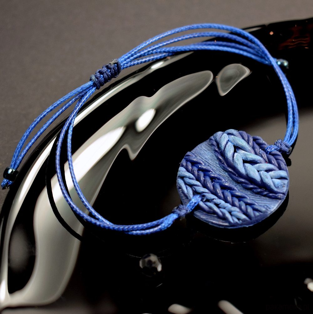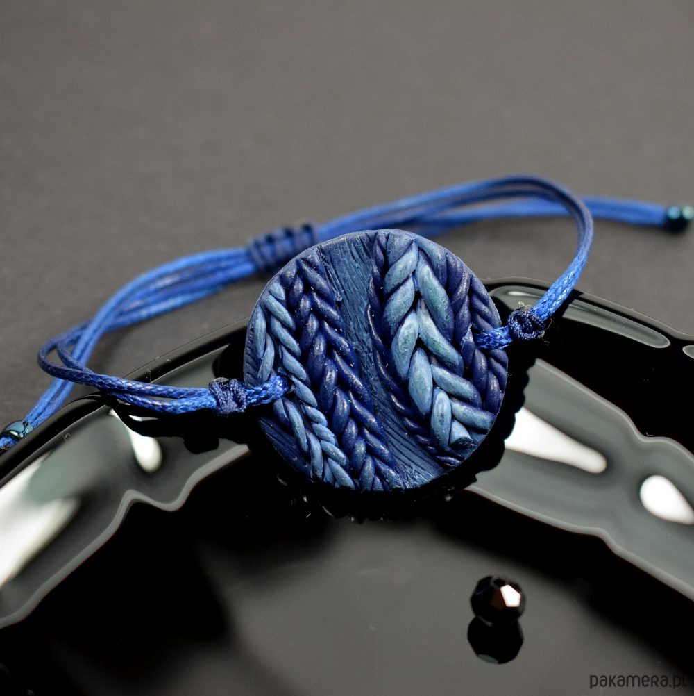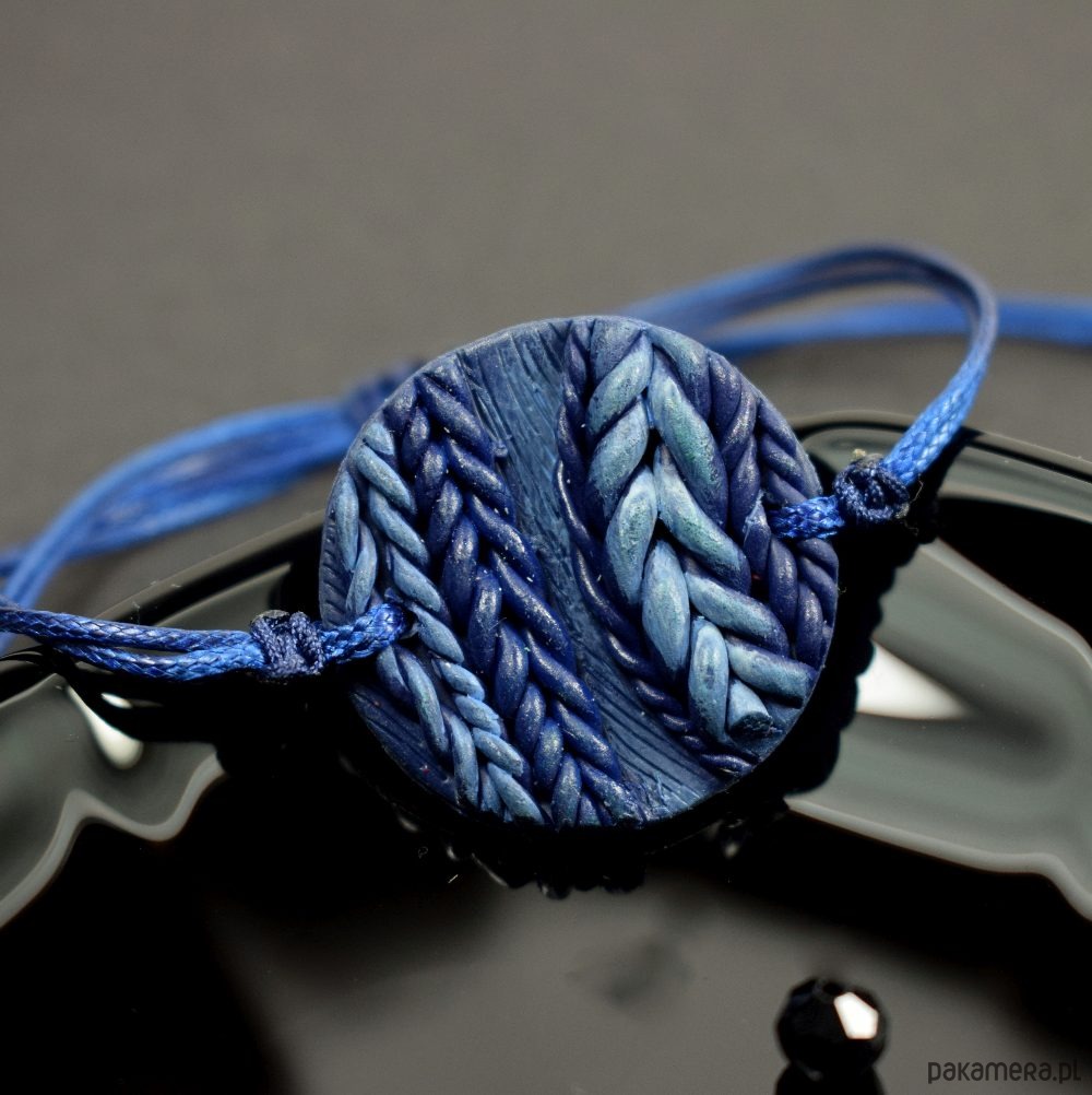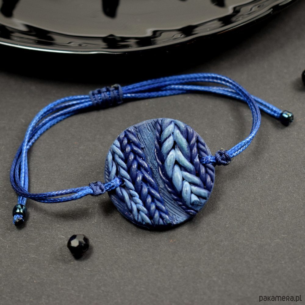Bransoletka sznurkowa z regulacją, dopasuje się do każdego nadgarstka. Jej centralny element w odcieniach granatu i niebieskiego powstał ręcznie z trwałej glinki polimerowej - lekkiej, odpornej na uszkodzenia, zachowującej trwałość i estetykę mimo upływu czasu.
