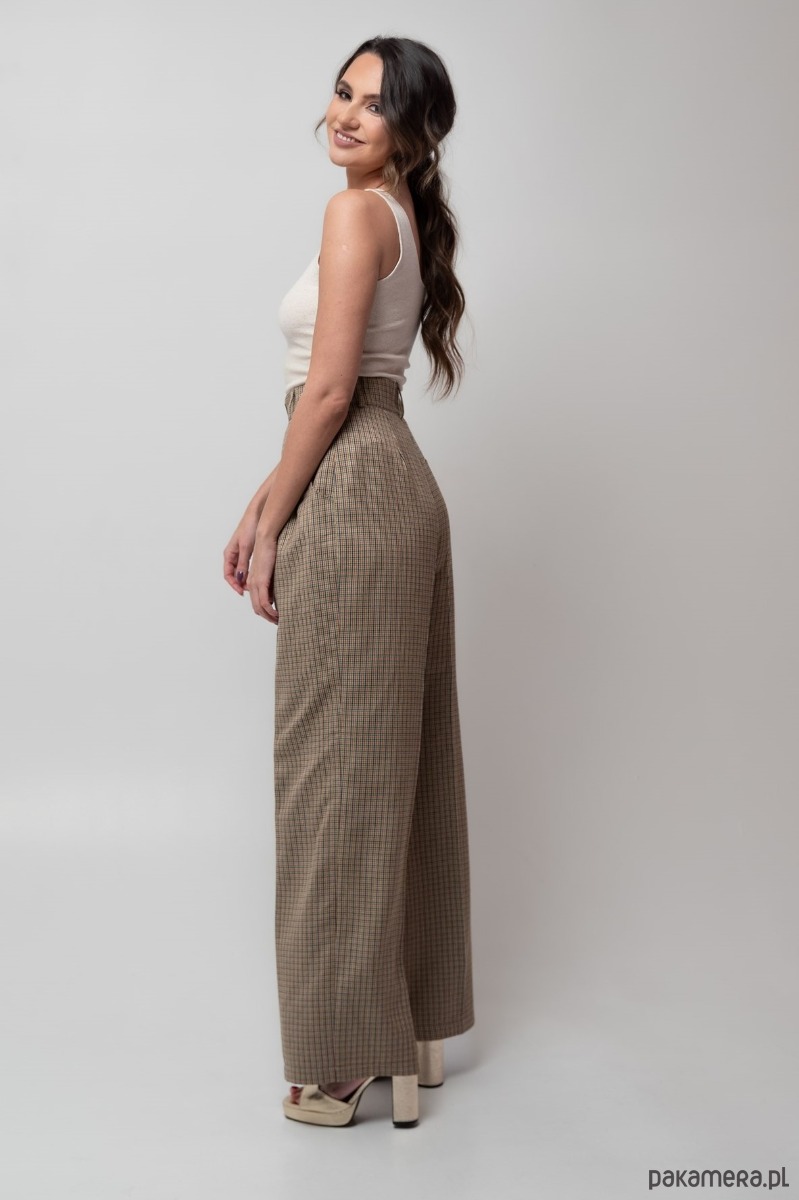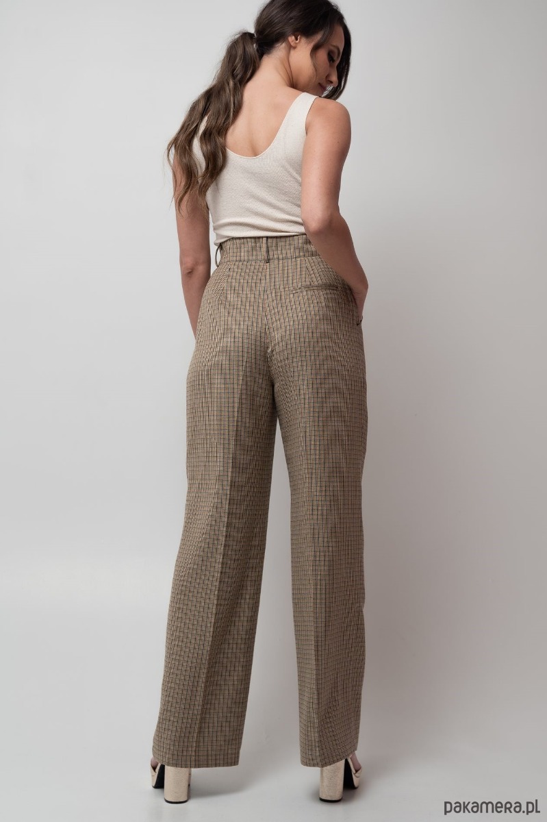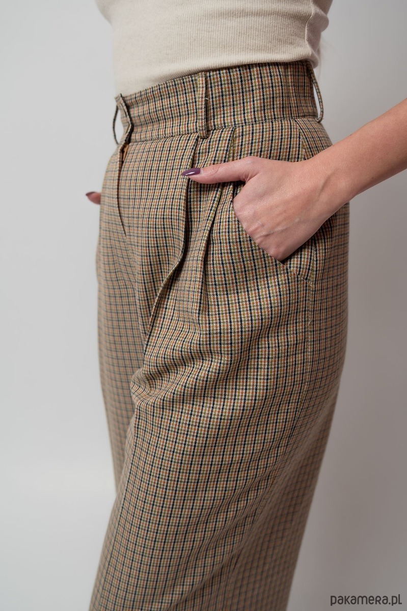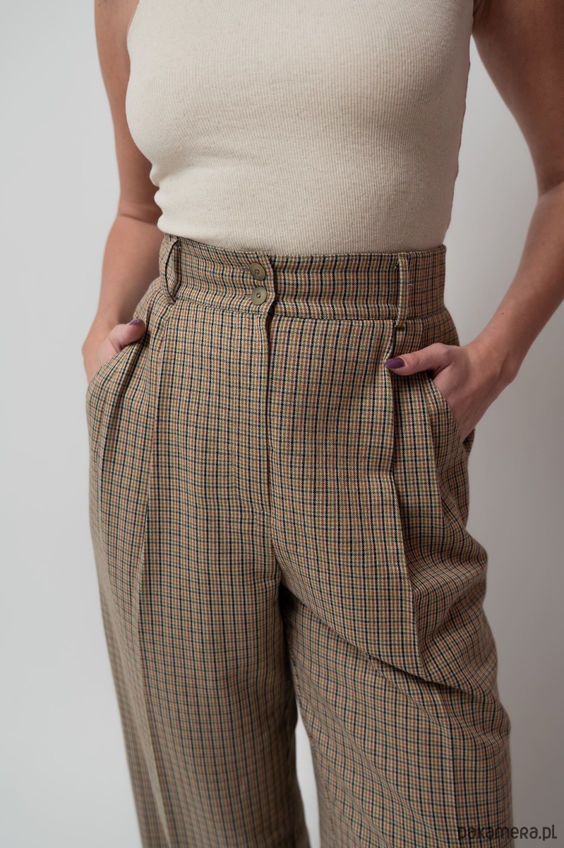 Wełniane spodnie w kratkę z szeroką nogawką.