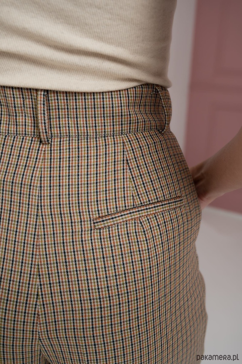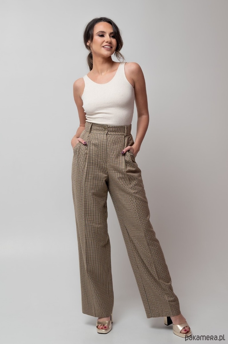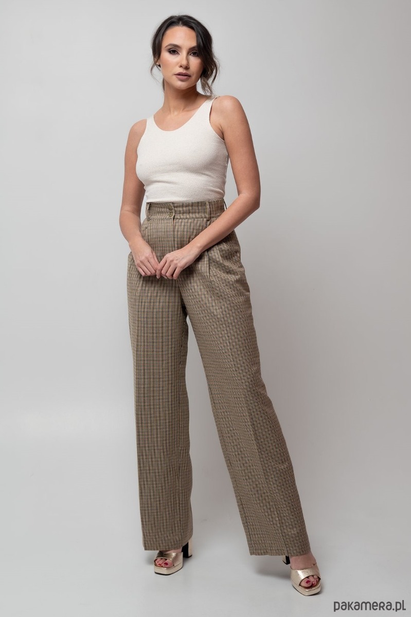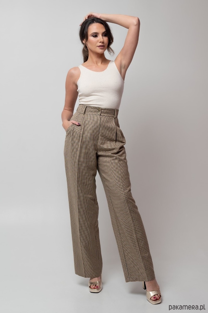 Wełniane spodnie w kratkę z szeroką nogawką.