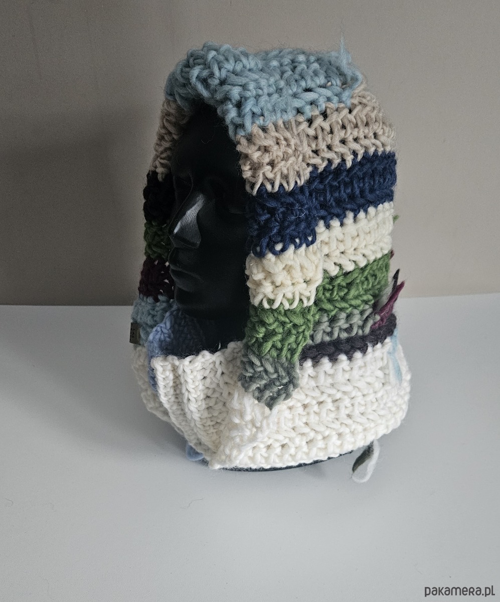 Idealny na chłodne dni – otula głowę, szyję i ramiona, zapewniając przyjemne ciepło bez konieczności zakładania czapki i szalika osobno. Doskonały dodatek w stylu boho i handmade, który doda charakteru każdej stylizacji – od swetra po płaszcz.