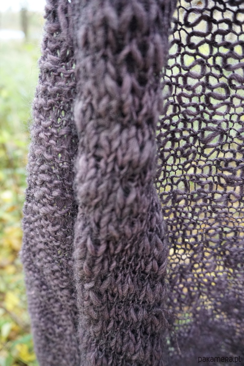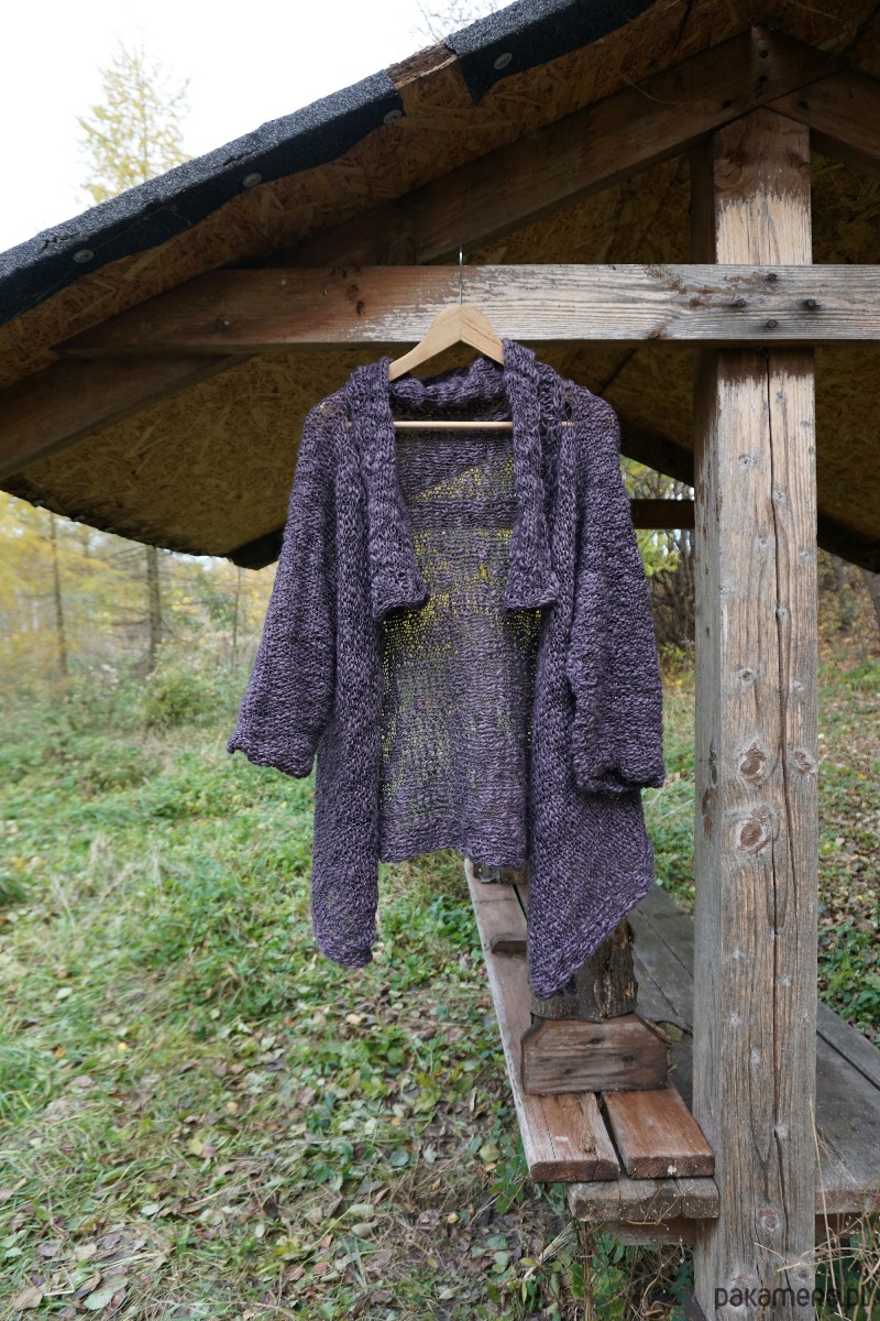 Ręcznie dziergany kardigan oversize wykonany ze 100% lekkiej wełny w melanżu odcieni śliwki, bakłażana i fioletu. Delikatna, nieregularna przędza nadaje mu subtelną fakturę i lekkość, jednocześnie zapewniając ciepło.