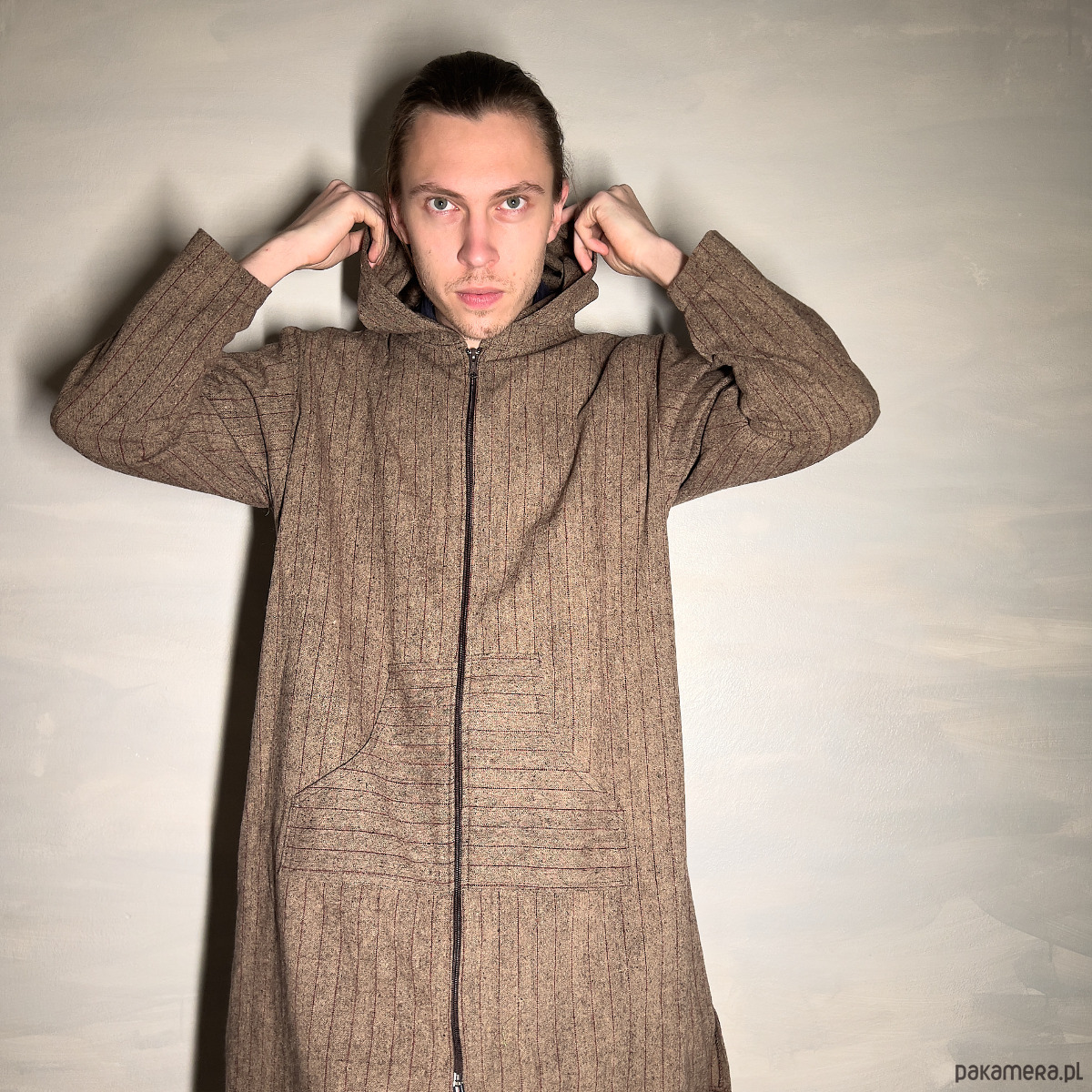 Krótki płaszcz wełniany z z kapturem na suwak