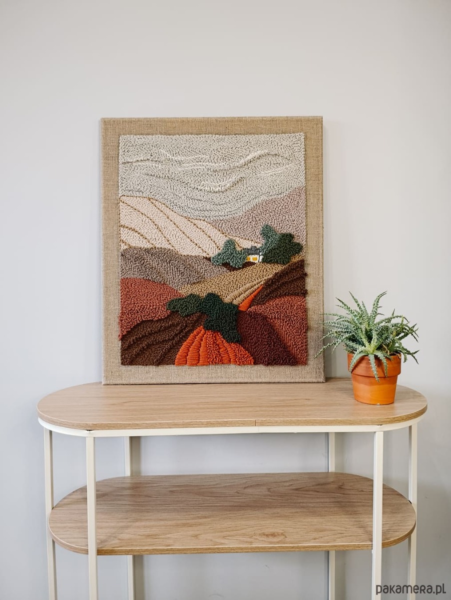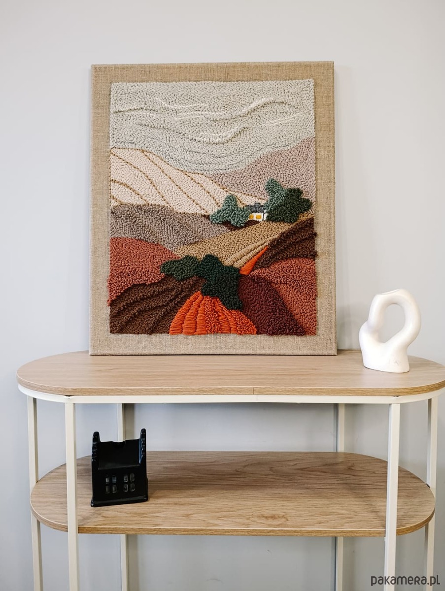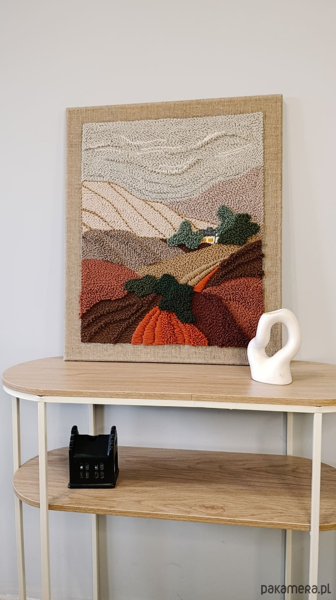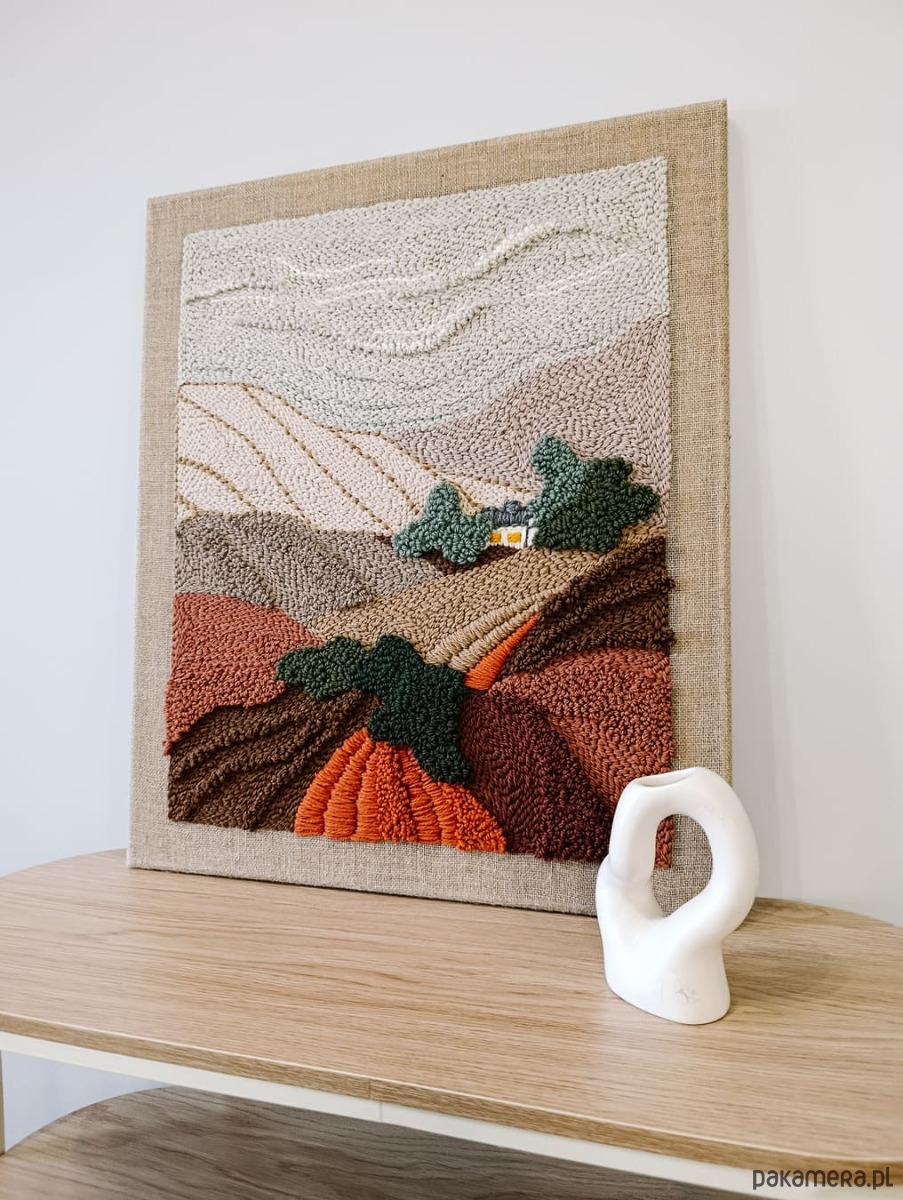 Ręcznie haftowany obraz tekstylny wykonany techniką punch needle. Praca przedstawia krajobraz inspirowany polami i pagórkami – miękkie linie, warstwowa struktura i spokojna, ziemista kolorystyka budują wrażenie harmonii i rytmu. A w oddali samotny dom, czy ktoś w nim mieszka?