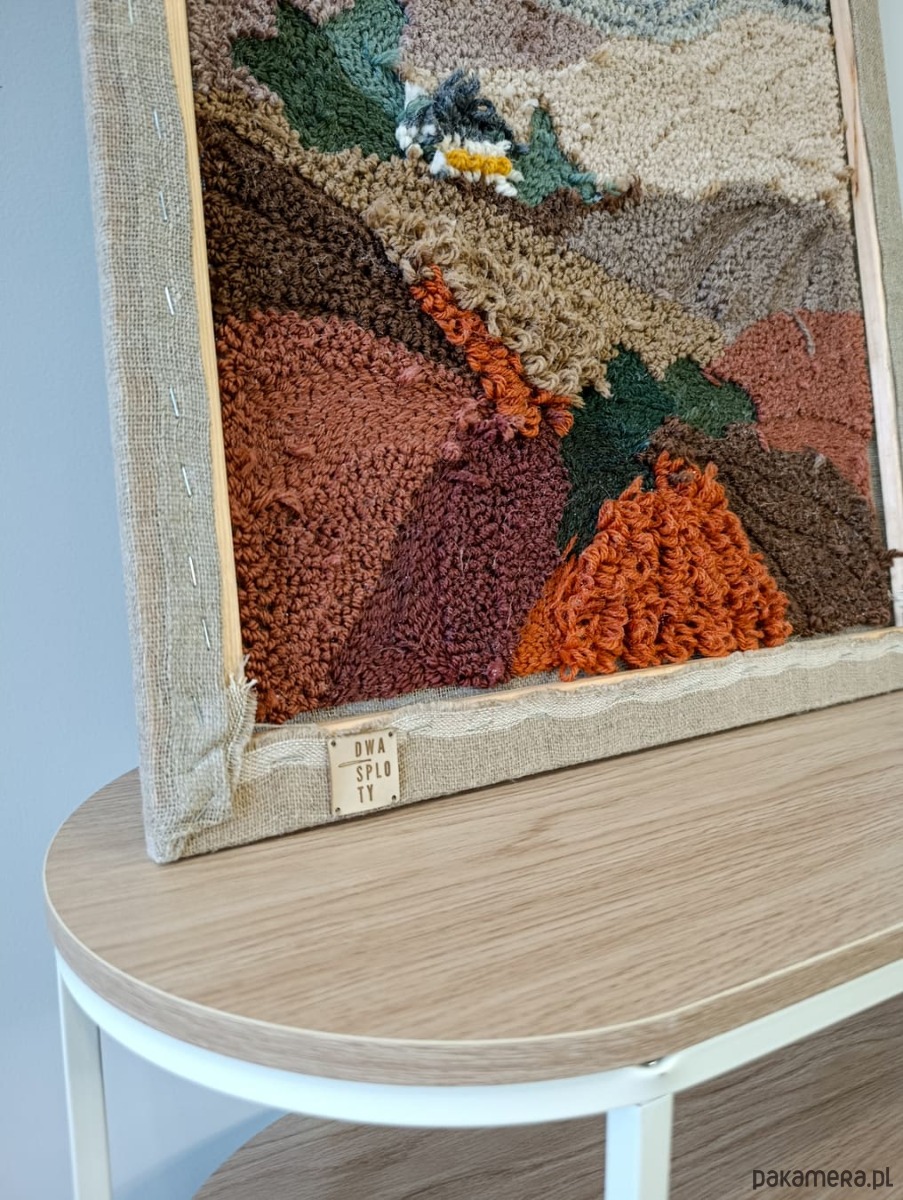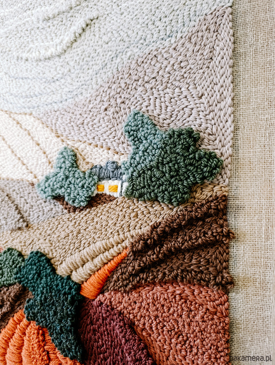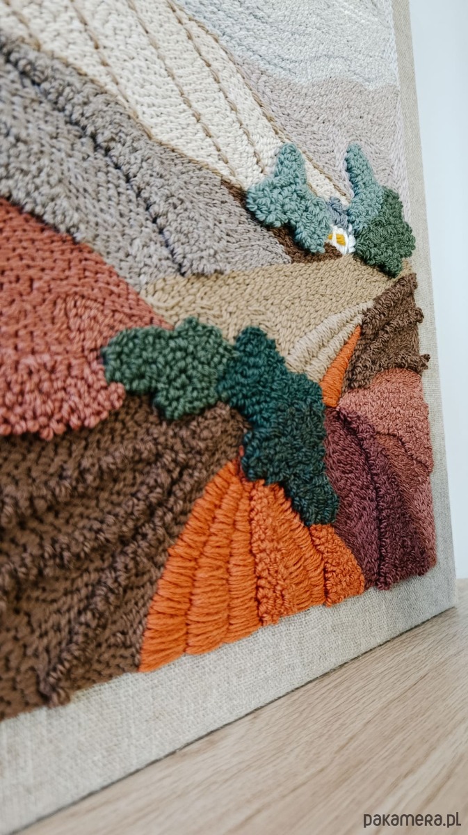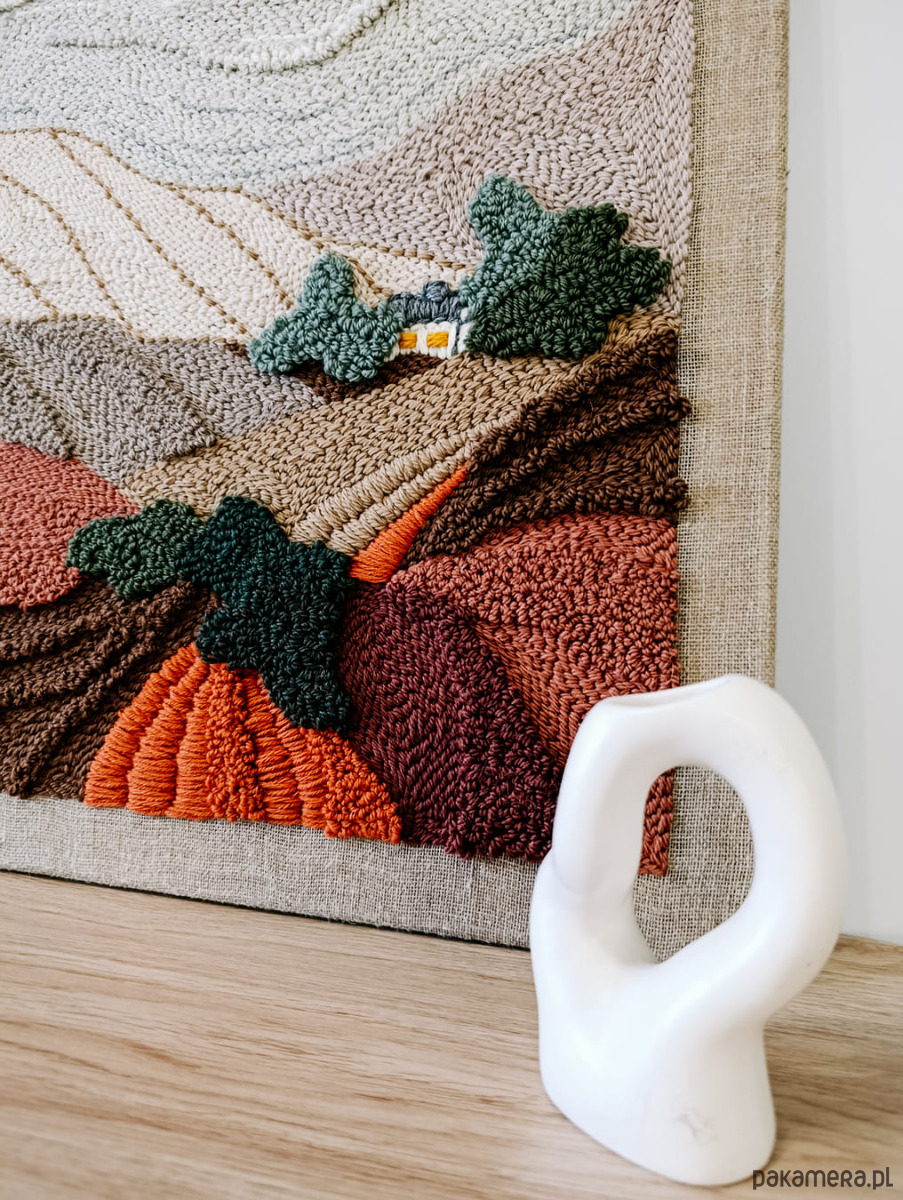 Ręcznie haftowany obraz tekstylny wykonany techniką punch needle. Praca przedstawia krajobraz inspirowany polami i pagórkami – miękkie linie, warstwowa struktura i spokojna, ziemista kolorystyka budują wrażenie harmonii i rytmu. A w oddali samotny dom, czy ktoś w nim mieszka?