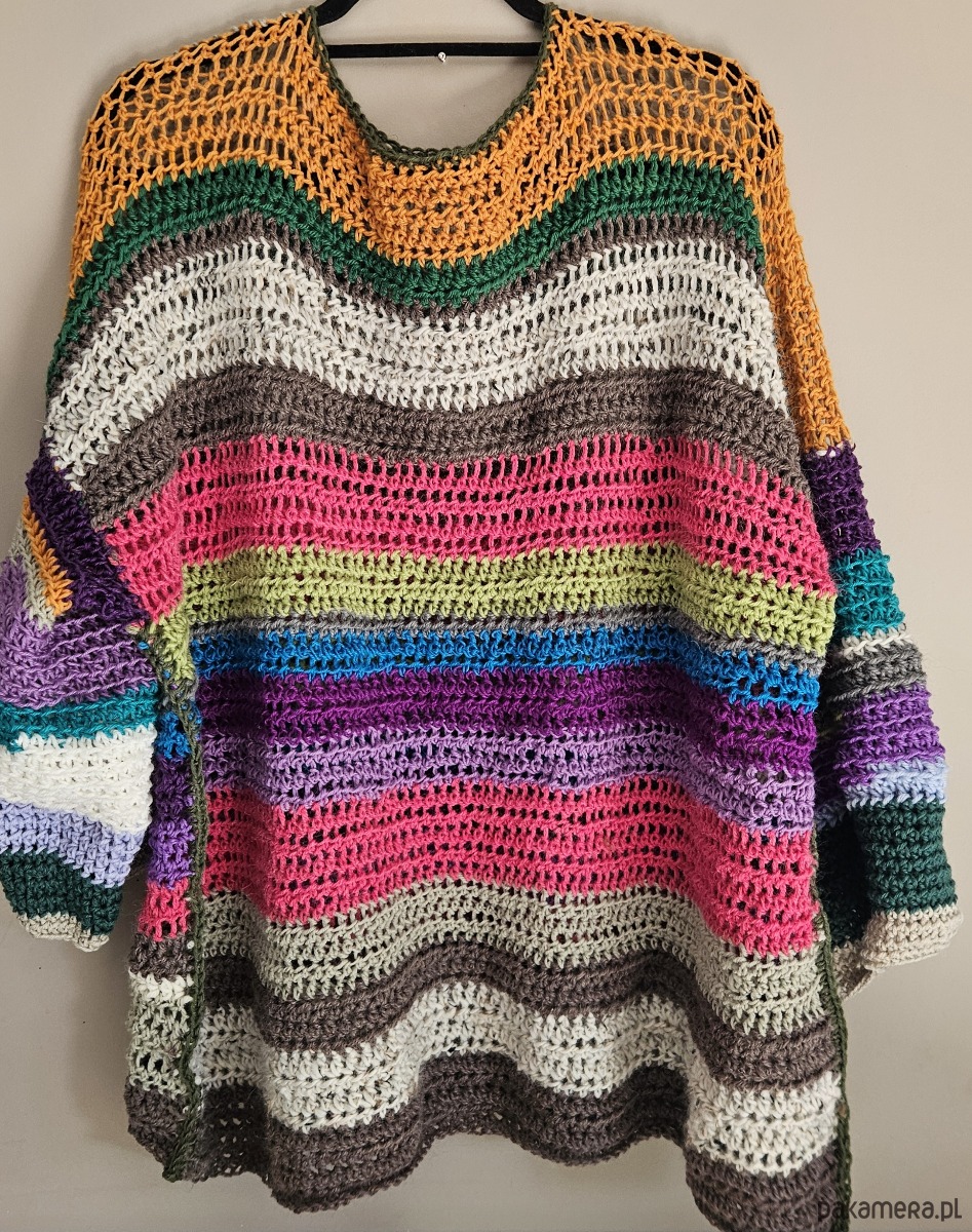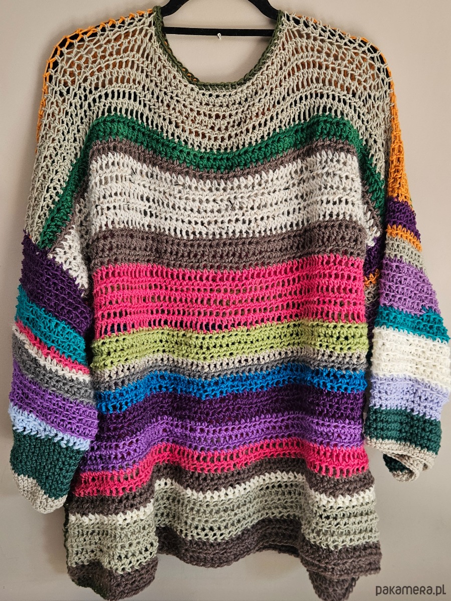 Ten sweter to prawdziwy handmade z charakterem – wykonany na szydełku z miękkiej, wełnianej włóczki, która otula i daje przyjemne ciepło w chłodniejsze dni. Każdy rząd to połączenie kolorów, które tworzą niepowtarzalny, lekko artystyczny klimat – idealny dla osób, które lubią wyróżniać się stylem.