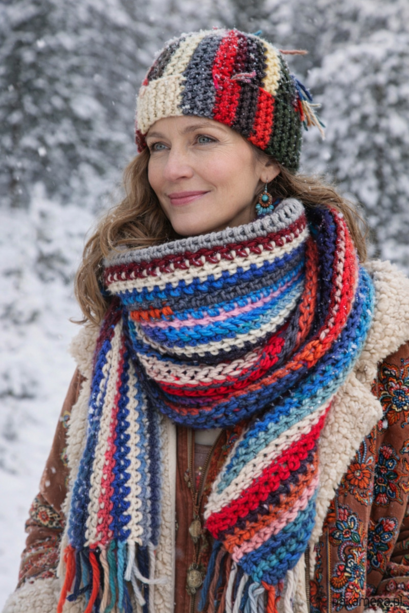 Wyjątkowy, ręcznie robiony szal wykonany z dbałością o każdy detal. Ciepły, miękki i otulający — idealny na zimowe dni oraz chłodne wieczory. Wielobarwna paleta kolorów tworzy niepowtarzalny wzór, dzięki czemu każdy egzemplarz jest jedyny w swoim rodzaju.