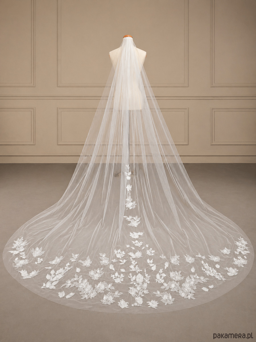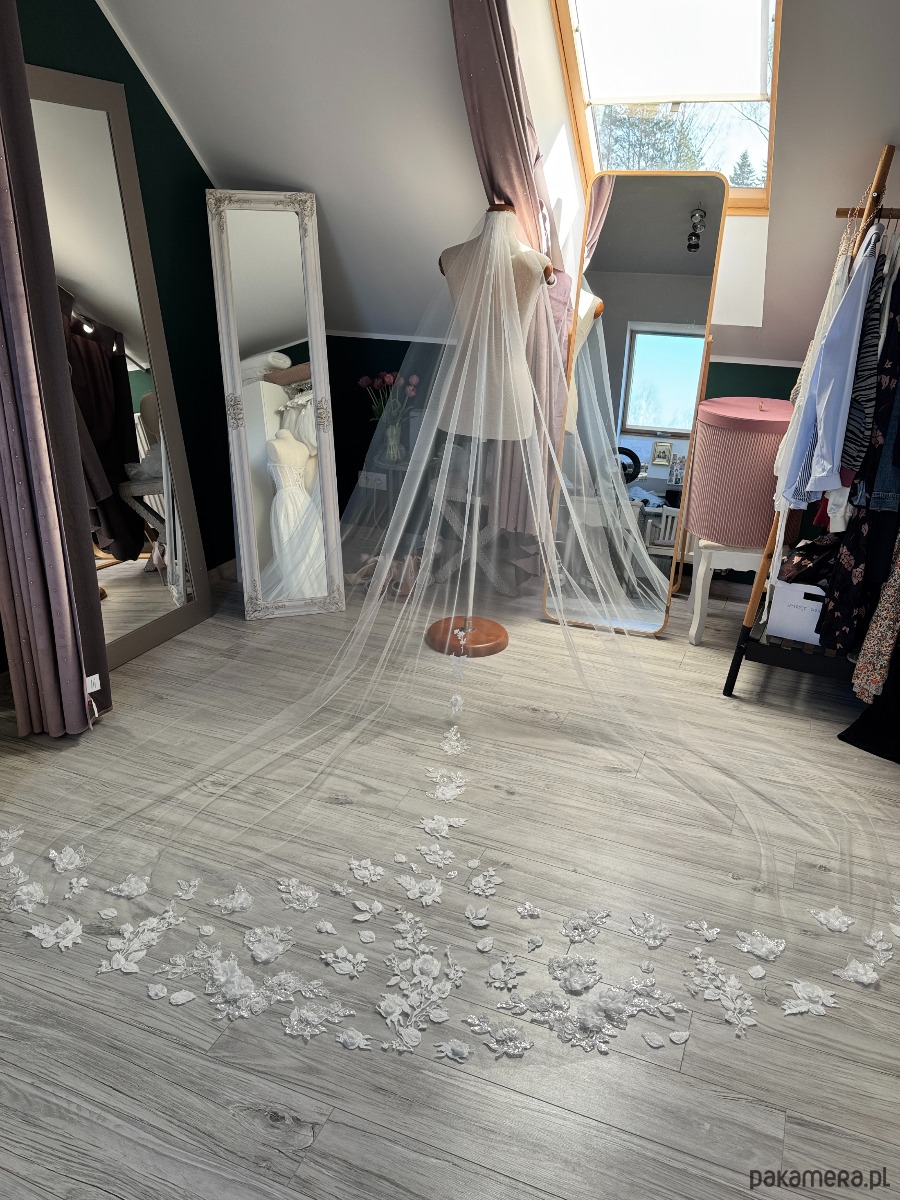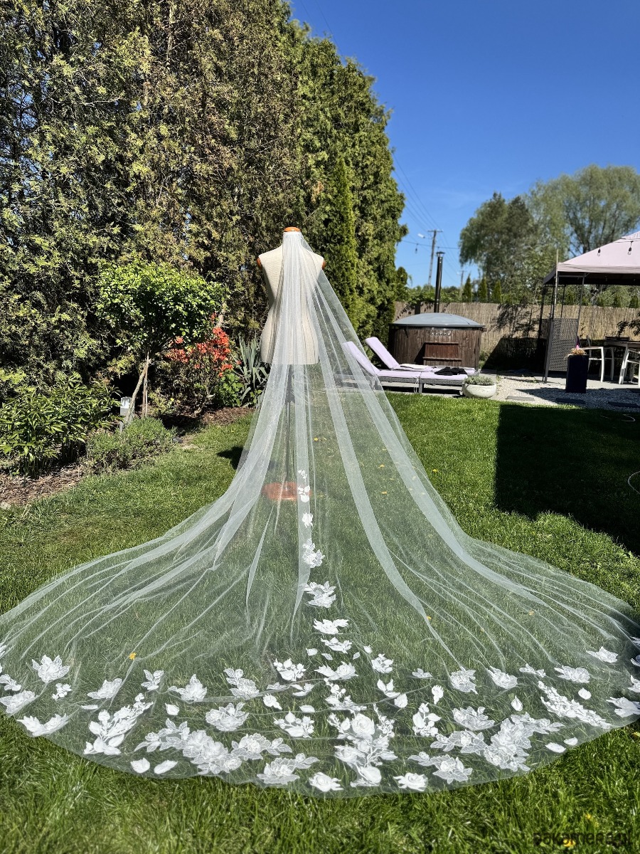 Welon katedralny uszyty z delikatnego włoskiego tiulu. Welon ozdobiony ręcznie wycinanymi koronkowymi kwiatkami. Będzie wyglądał pięknie zarówno w kościele jak i na uroczystości w plenerze. Długość welonu 3 m. Welon będzie pasował do sukni w kolorze złamanej bieli.