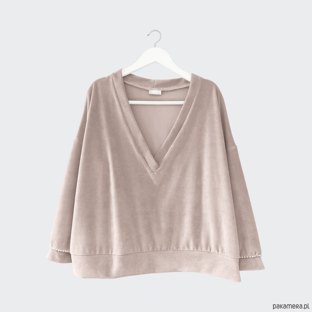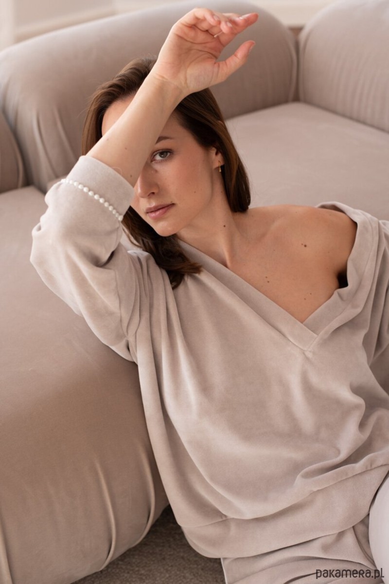 Welurowa beżowa bluza z perełkami przy mankietach to absolutny must-have, jeśli kochasz wygodę w luksusowym wydaniu. Uszyta z miękkiego, przyjemnego w dotyku weluru, który otula ciało niczym kocyk, ale jednocześnie wygląda elegancko i bardzo stylowo.