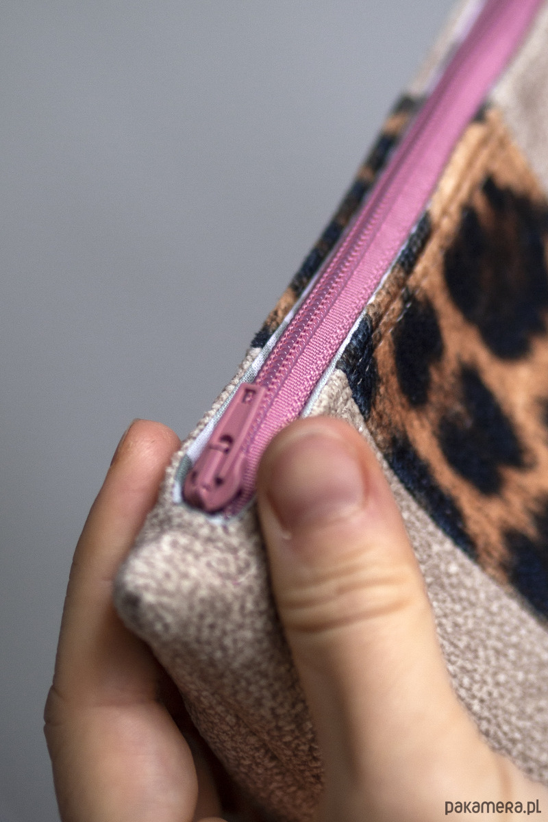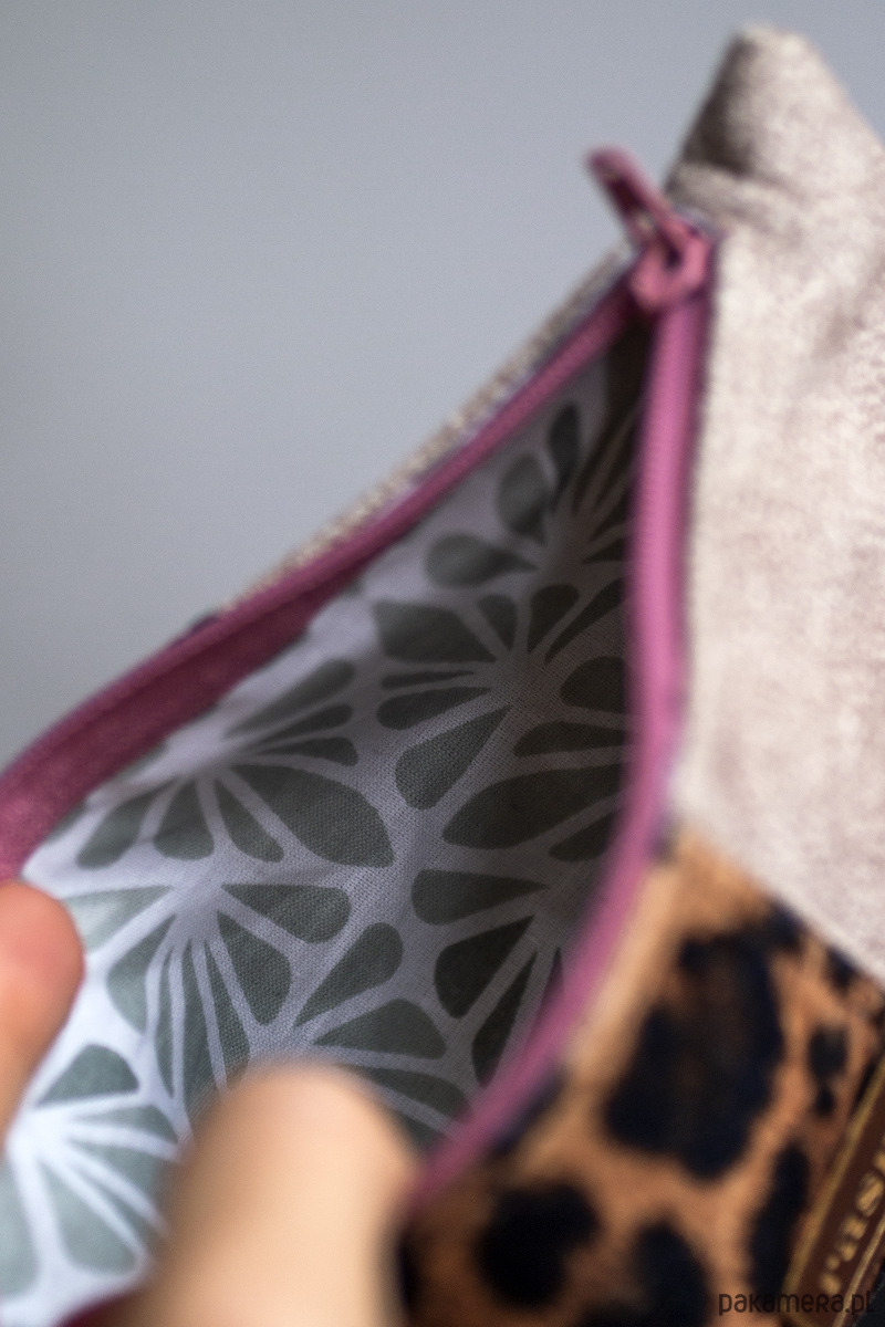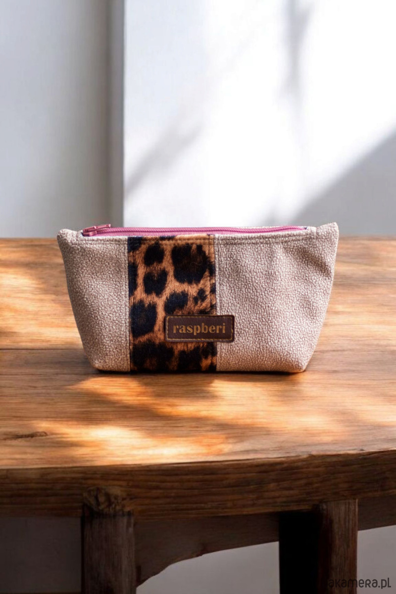 Średniej wielkości kosmetyczka wykonana z weluru w panterkę oraz weluru w kolorze beżowym.
