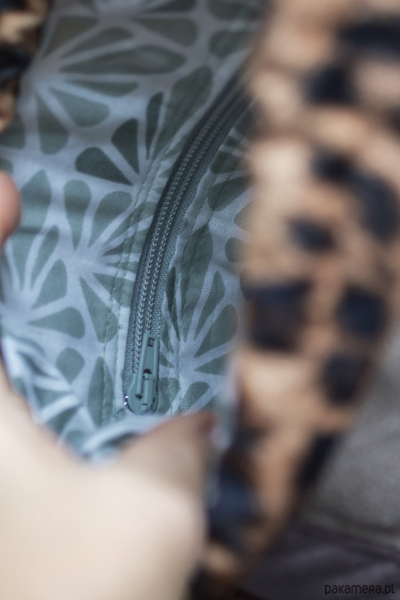 Wykonana z weluru w panterkę. Z przodu oraz z na tyle torebki kieszenie (np. na telefon czy chusteczki) z pudroworóżowego pikowanego weluru i weluru w kolorze beżowym. W środku kieszonka zapinana na suwak.