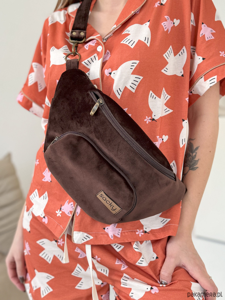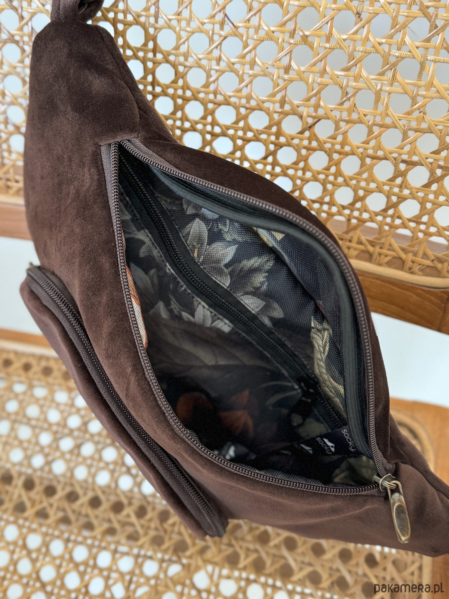 Welurowa nerka miejska deep brown to pojemna nerka skierowana do kobiet. Welurowa tkanina z której wykonaliśmy nerkę jest bardzo wytrzymałym i łatwym w utrzymaniu czystości materiałem. Na przodzie saszetki znajduje się kieszeń zapinana na zamek, w której możesz schować telefon. Regulowany odpinany materiałowy pasek pozwoli Ci modyfikować nerkę według Twoich potrzeb. Wewnątrz saszetka podszyta jest wodoodporną podszewką w kwiatowy wzór. Dodatkowo w środku nerki znajdziesz kieszonkę na zamek oraz karabińczyk na klucze.