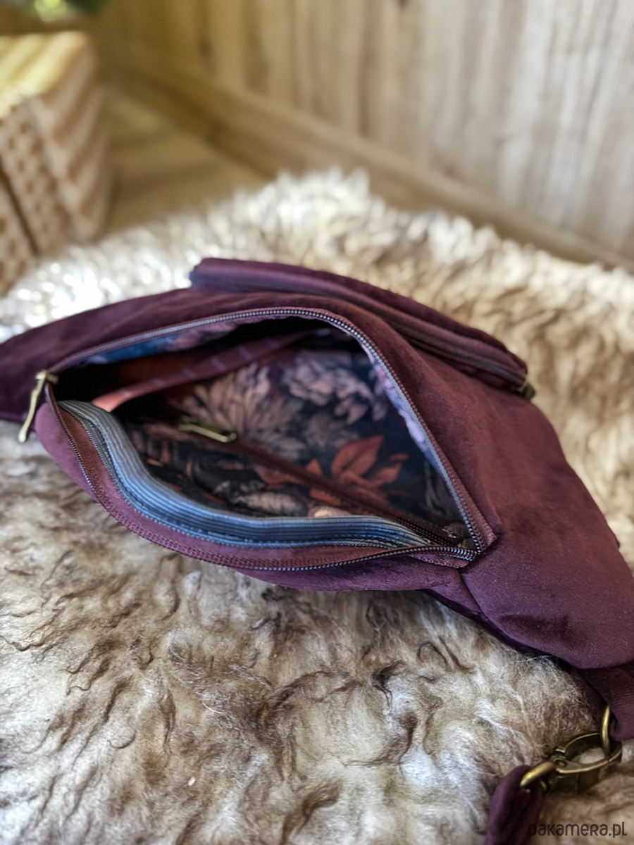 Welurowa nerka miejska wino to pojemna nerka skierowana do kobiet. Welurowa tkanina z której wykonaliśmy nerkę jest bardzo wytrzymałym i łatwym w utrzymaniu czystości materiałem. Na przodzie saszetki znajduje się kieszeń zapinana na zamek, w której możesz schować telefon. Regulowany odpinany materiałowy pasek pozwoli Ci modyfikować nerkę według Twoich potrzeb. Wewnątrz saszetka podszyta jest wodoodporną podszewką w kwiatowy wzór. Dodatkowo w środku nerki znajdziesz kieszonkę na zamek oraz karabińczyk na klucze.
