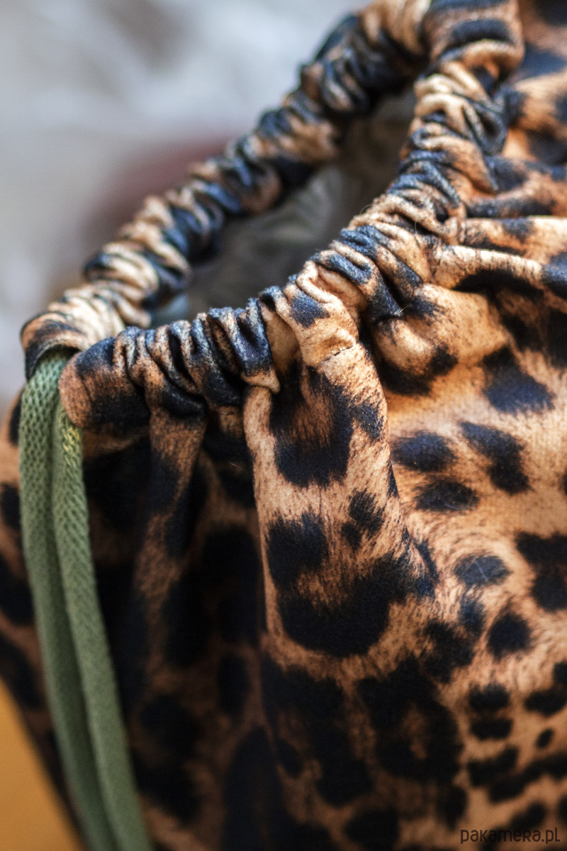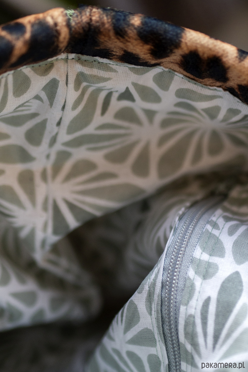 Wzorzysta bawełniana podszewka. Kieszonka w środku.